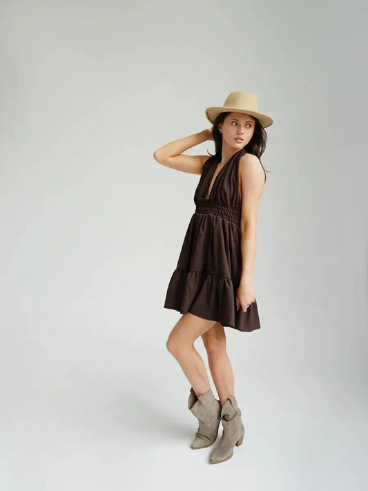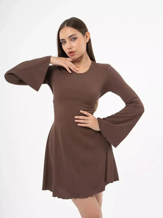 • Cocoa Laced brown mini dress with long flared sleeves and a body-hugging silhouette, perfect for summer events.
