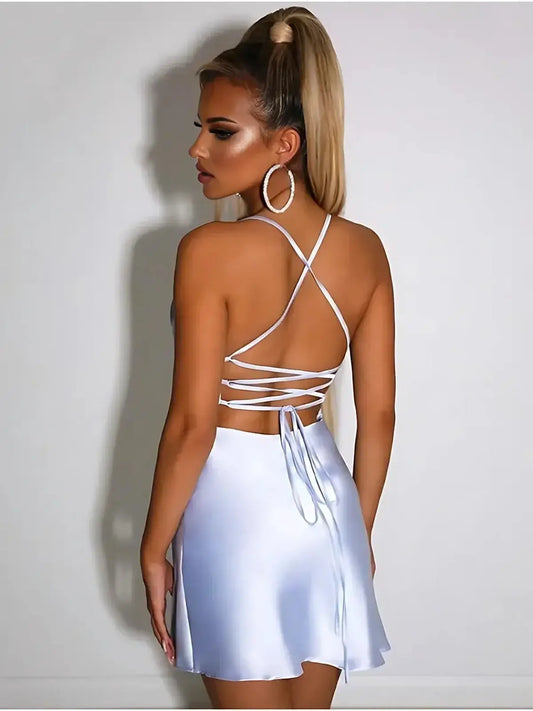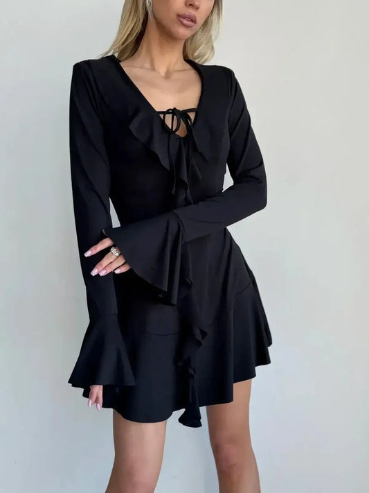 • Bold pink mini dress with a V-neckline, long sleeves, and flared silhouette, perfect for summer occasions.
