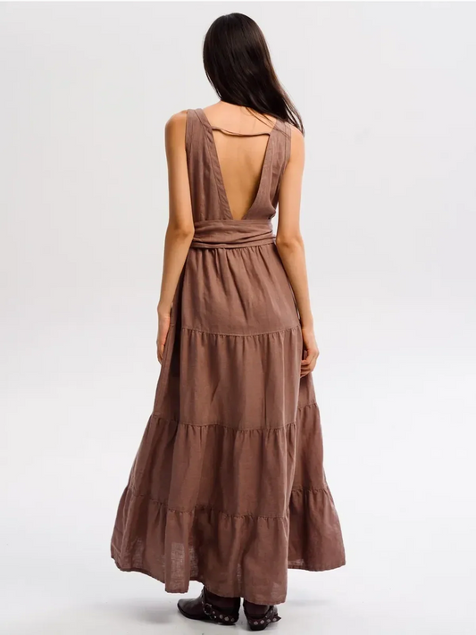 • Cocoa Laced brown mini dress with long flared sleeves and a body-hugging silhouette, perfect for summer events.
