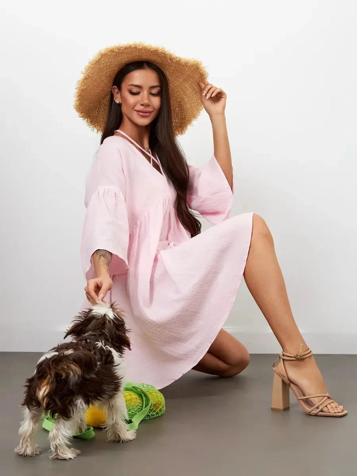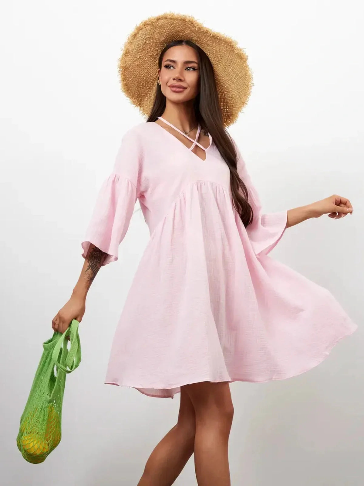 Designed with a romantic V-neckline and an adjustable tie bow detail, the Blushaire Mini Dress flatters the neckline and shoulders with subtle allure. Its flared elbow-length sleeves and airy, relaxed fit create a silhouette that moves beautifully with you. The softly textured cotton weave ensures comfort and natural airflow, making it a must-have summer dress for modern women who love both beauty and ease.