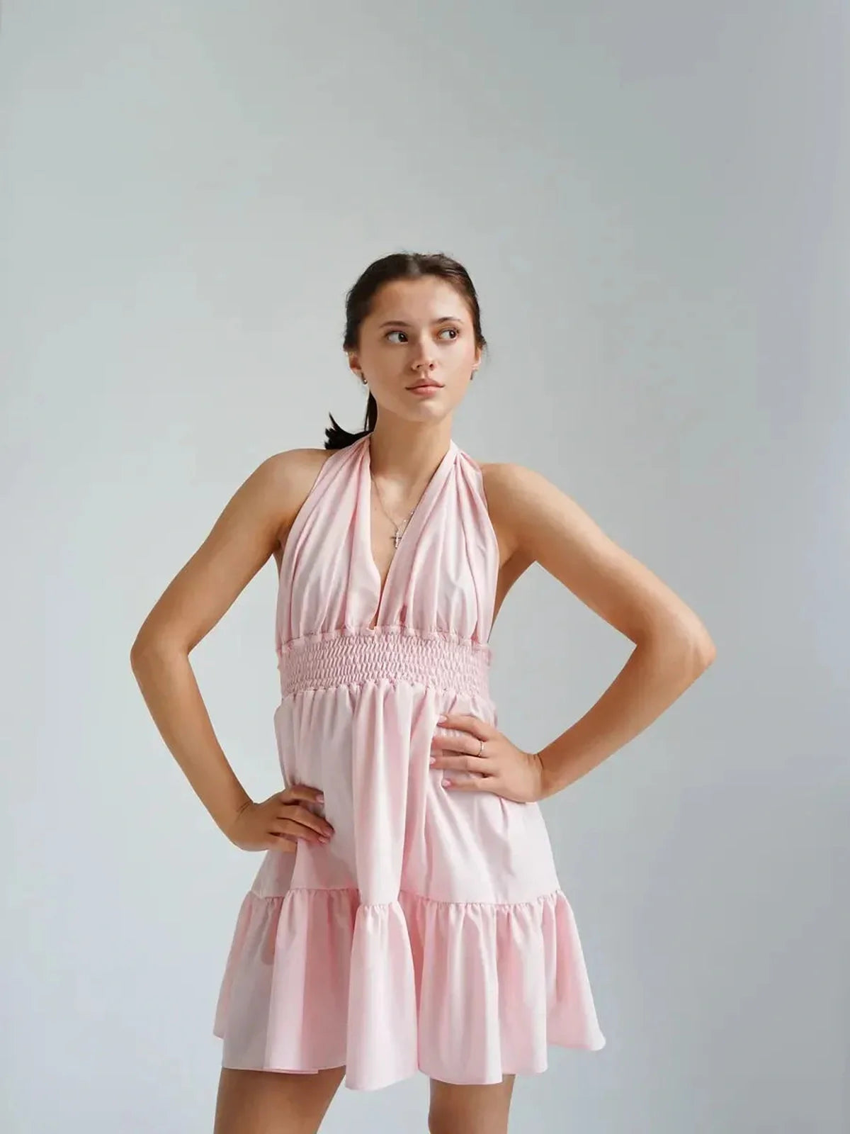 Breezy, romantic, and endlessly flattering — the Roselle Mini Dress is your new go-to for sunlit days and softly glamorous nights. Crafted from a lightweight cotton-blend fabric in a delicate blush tone, this women’s pink halter mini dress combines feminine movement with relaxed sophistication. Its flowy tiered silhouette and gathered neckline bring effortless charm to every moment.