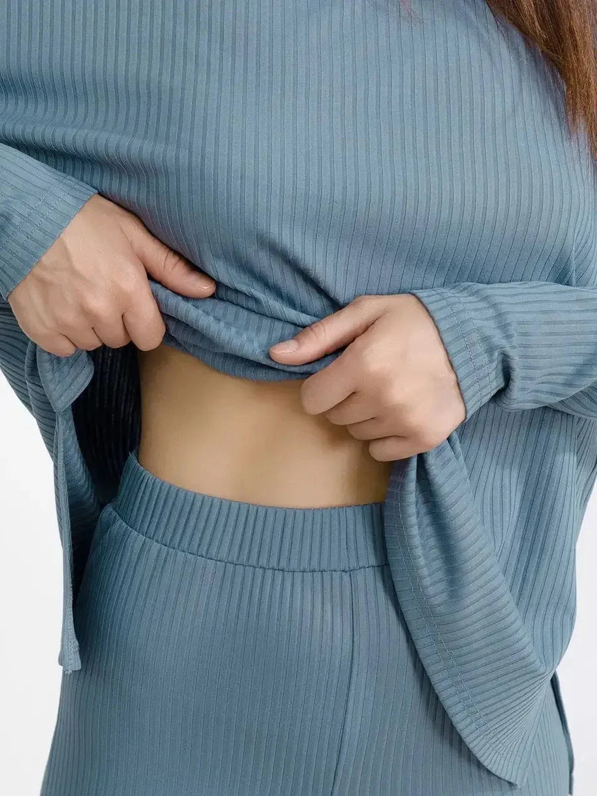 The Cloud Lounge Set is the ultimate expression of relaxed sophistication, designed for women who appreciate style and comfort in equal measure. Crafted from a luxuriously soft ribbed knit in a calming grey-blue tone, this two-piece ensemble pairs an oversized long-sleeve top with wide-leg trousers, creating an airy silhouette that moves with ease. Perfect for slow mornings, stylish lounging, or casual city errands, it blends timeless minimalism with elevated everyday wear.