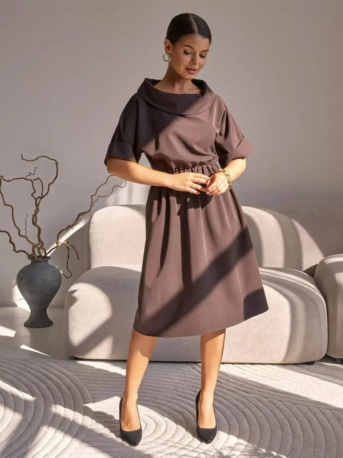 A chocolate brown mini dress that redefines laid-back elegance with a sculptural touch.