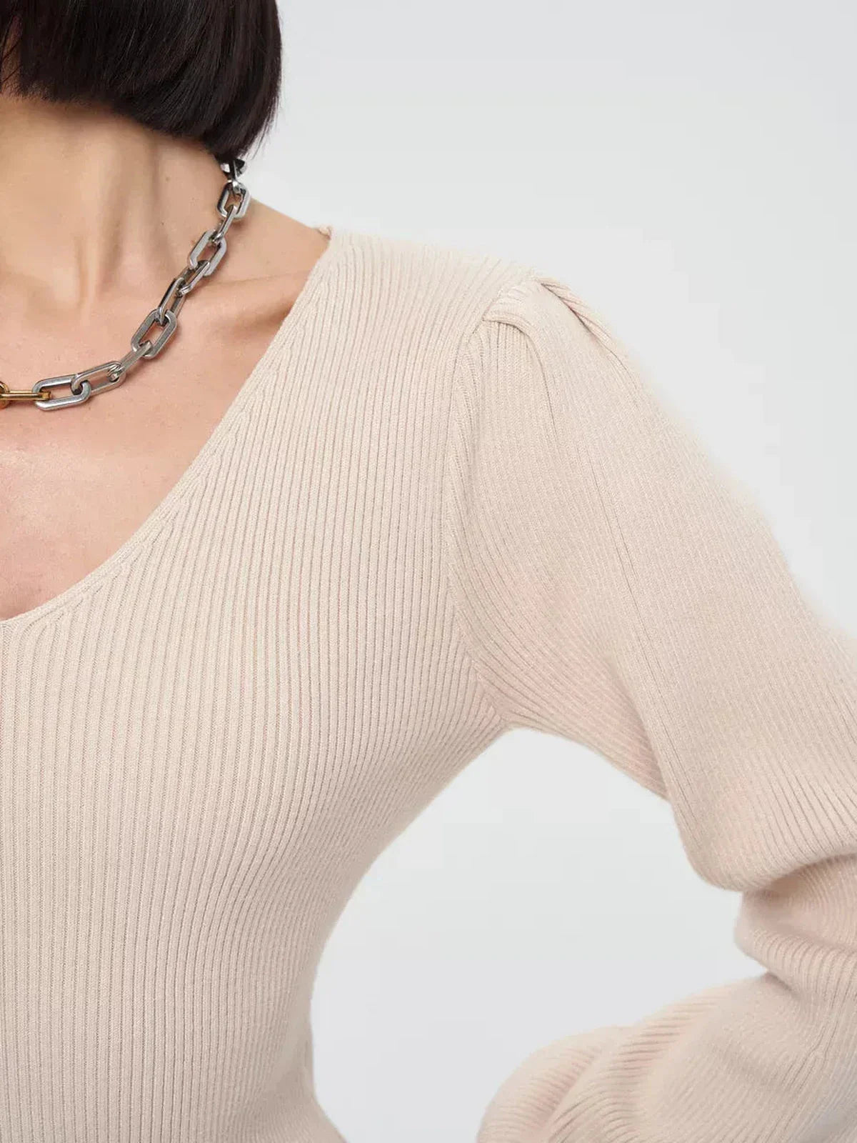 The deep V-neckline highlights the collarbones with subtle allure, while voluminous balloon sleeves bring a touch of modern drama. The semi-fitted body contours your shape gently without restricting movement, offering the perfect balance of comfort and polish. Unlined and crafted with natural stretch, the Cream Contour Mini Dress slips on easily and moves beautifully — no fasteners, no fuss, just refined confidence.