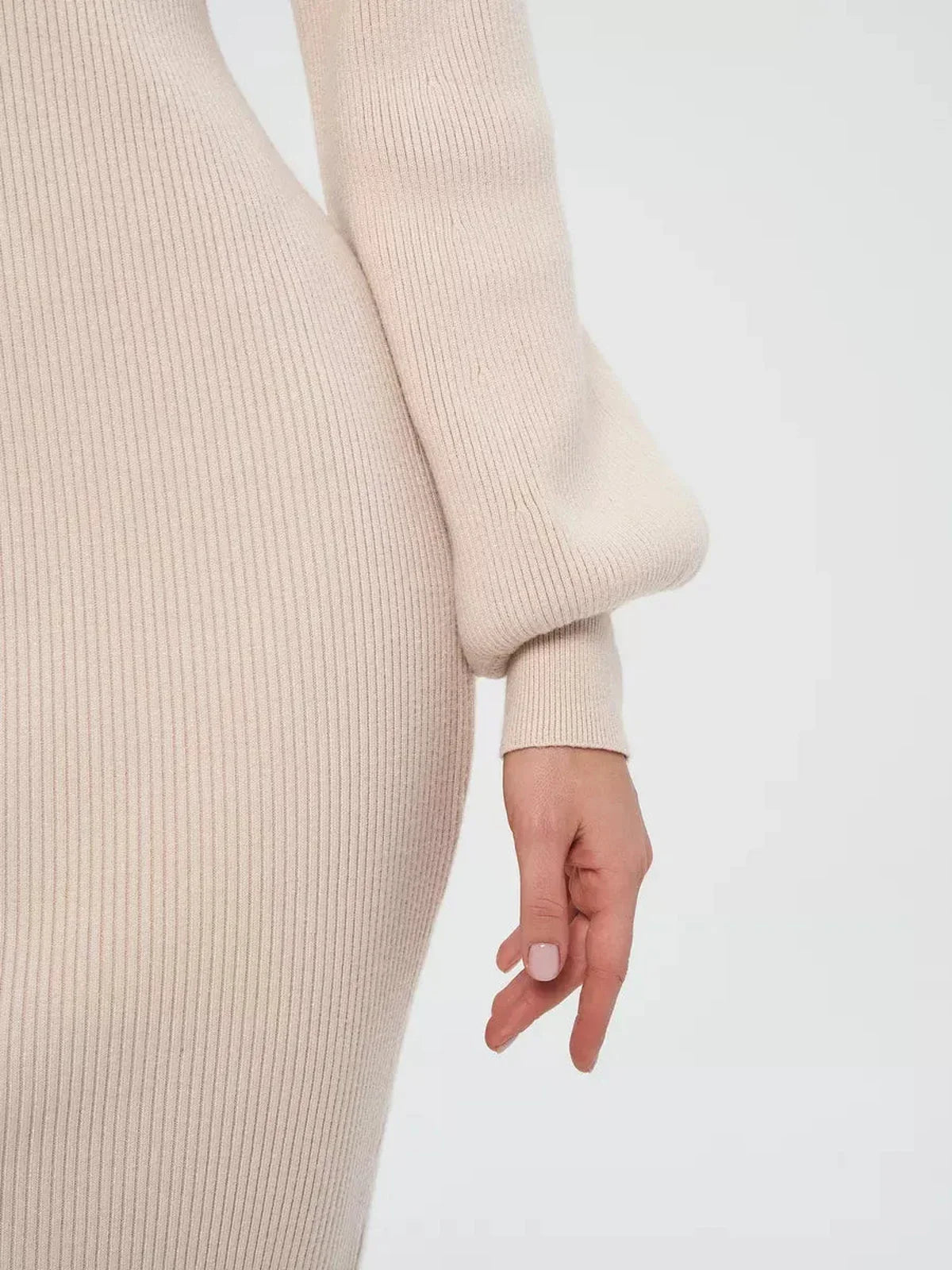 A cream ribbed mini dress that combines comfort, contour, and classic elegance.