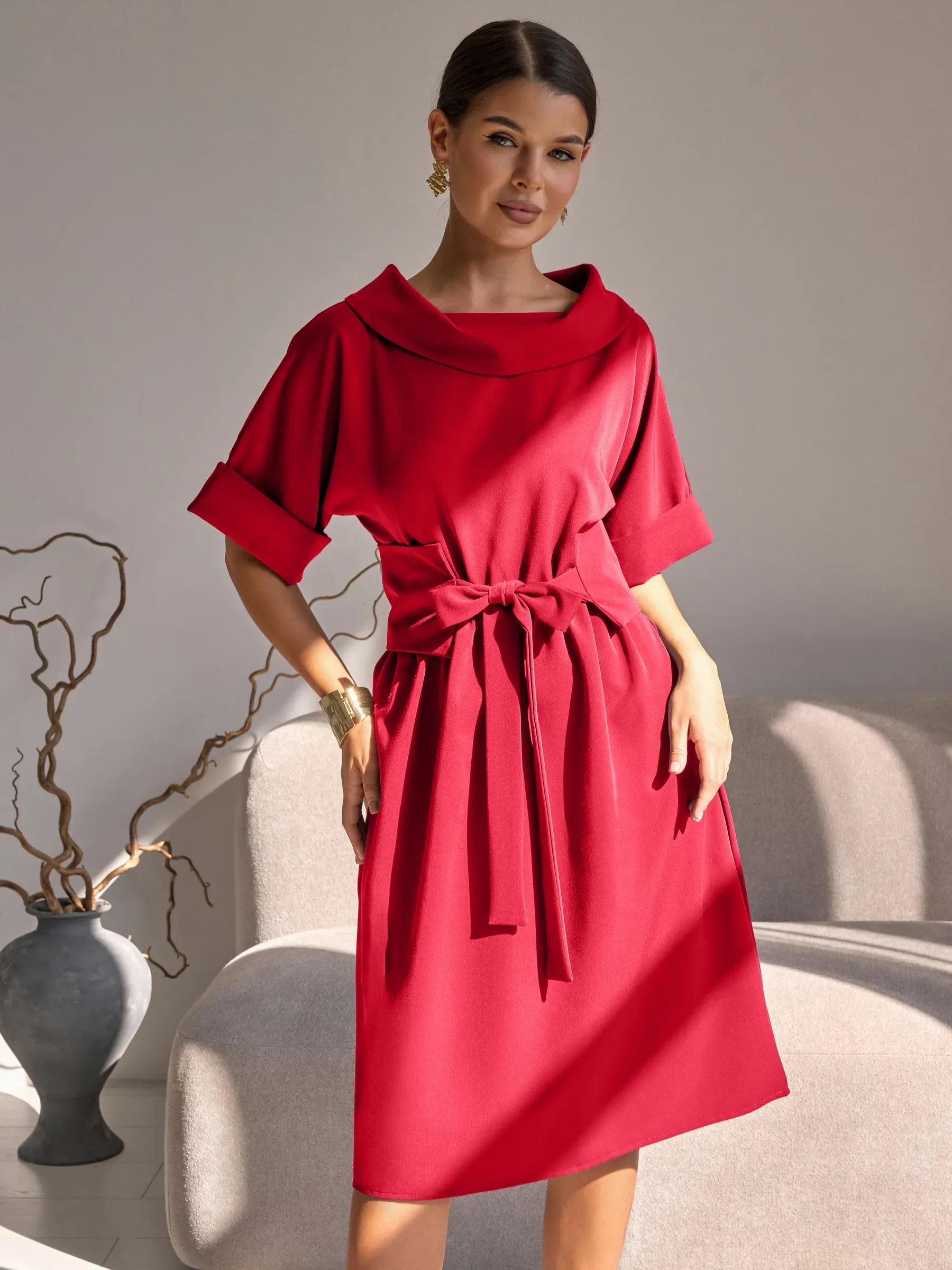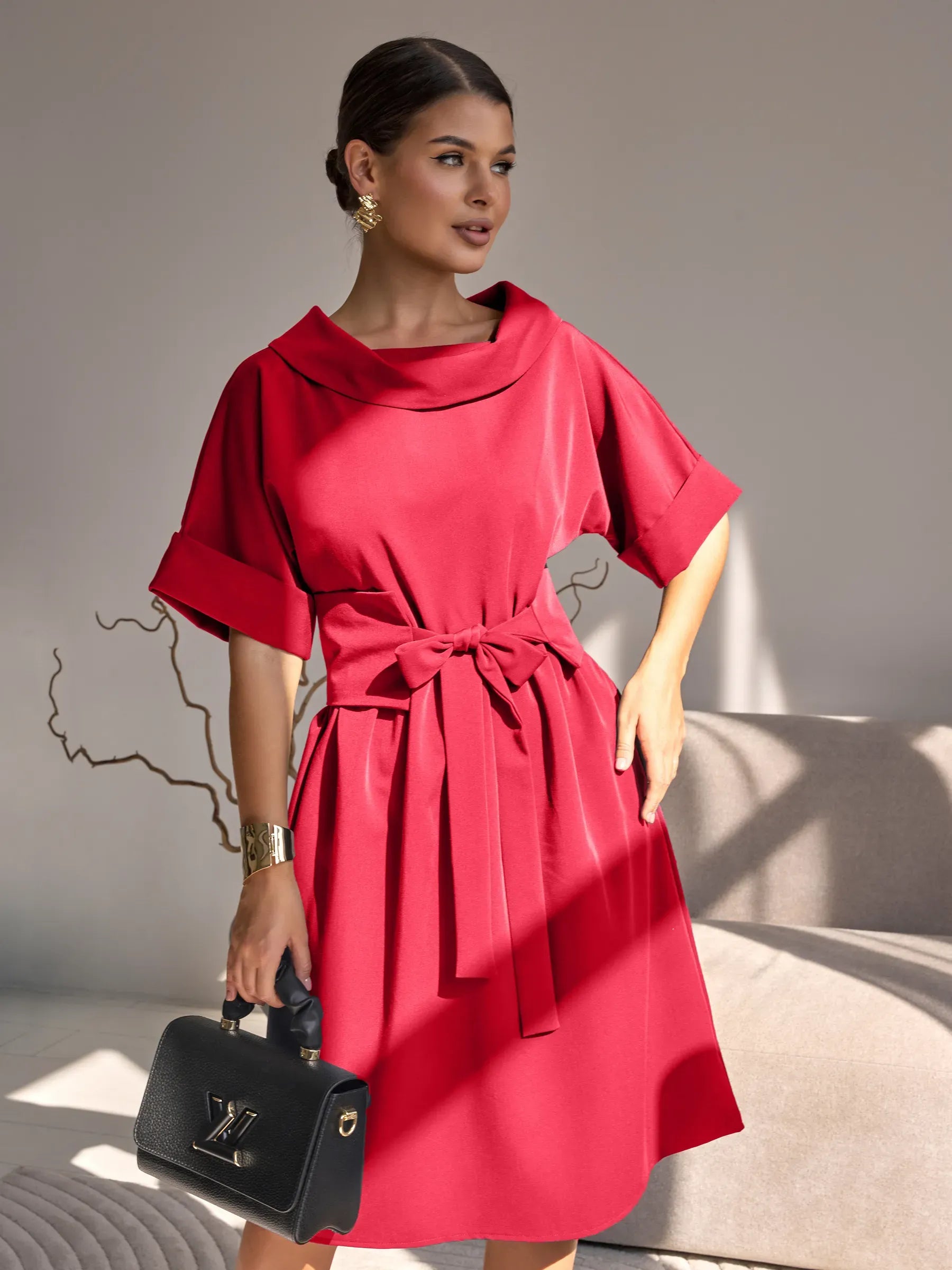 Crafted from a premium blend of polyester, viscose, and lycra, the fabric offers gentle stretch, breathability, and a soft, luxurious feel against the skin. The self-tie belt cinches the waist for a sculpted shape, while the wide, voluminous sleeves introduce a modern touch of drama. Designed for movement and ease, the Crimson Aura Mini Dress features hidden side pockets and a pull-on fit — no zippers or fasteners, just effortless elegance.
