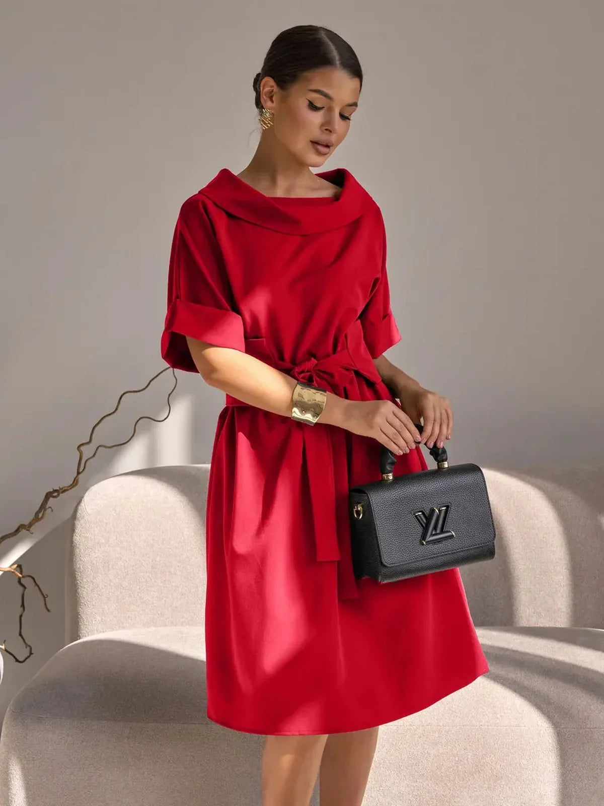Bold, refined, and effortlessly timeless — the Crimson Aura Mini Dress is the statement piece that defines modern sophistication. Designed in a rich crimson red hue, this women’s mini dress blends structured tailoring with fluid drape, creating a look that feels both powerful and feminine. The wide cowl neckline beautifully frames the collarbone, adding a touch of understated allure to the clean silhouette.