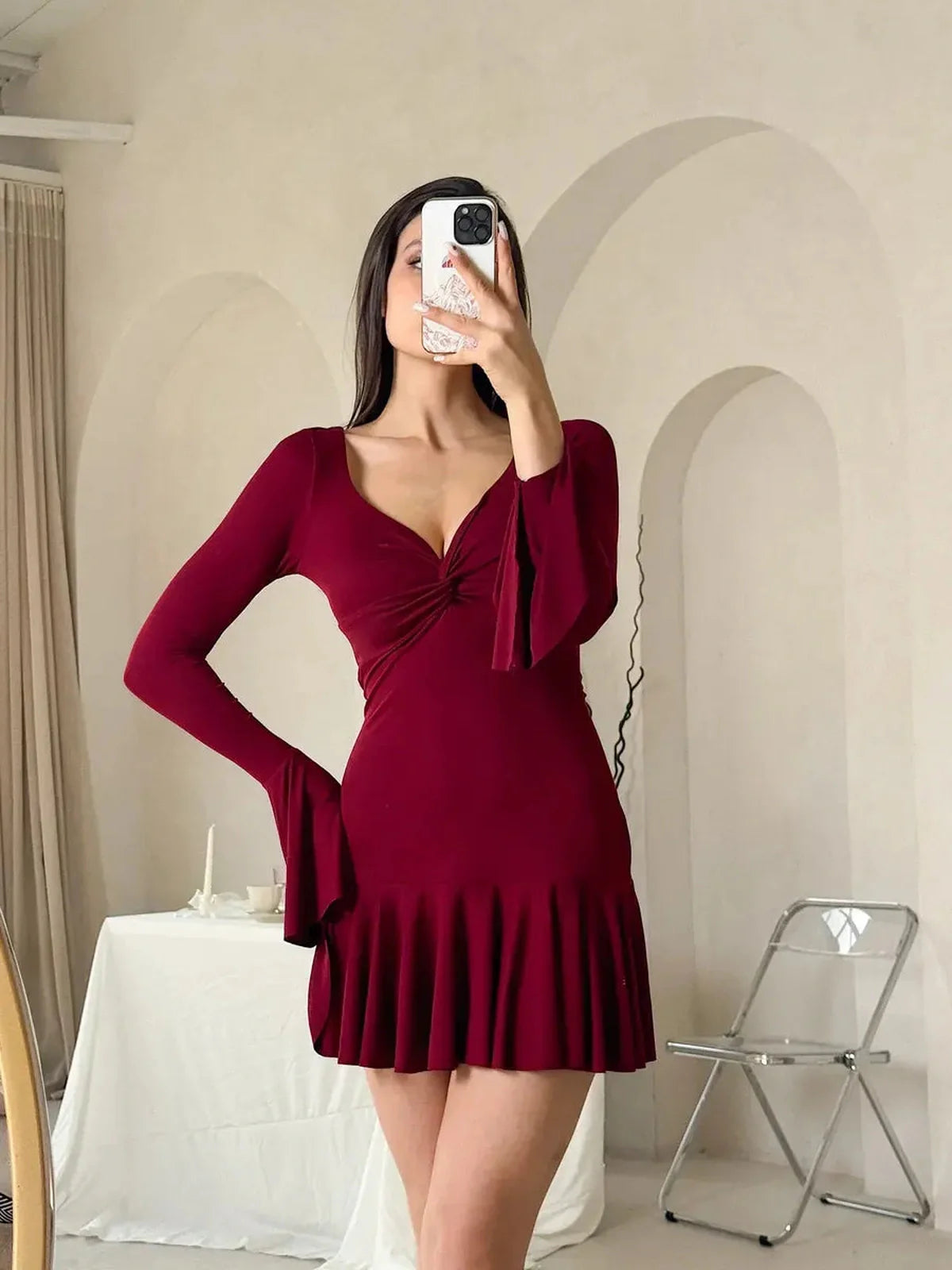 The Marvella Mini Dress features a plunging V-neckline with a knotted bust detail that draws the eye, while its long bell sleeves add volume and a graceful rhythm to every gesture. A flared, ruffled hem enhances the piece’s playful femininity, creating fluid motion with every step. Complete with a tie-back closure for a customized fit, this design seamlessly balances sensuality with elegance — ideal for wedding guest dresses, graduation events, or prom dress celebrations.