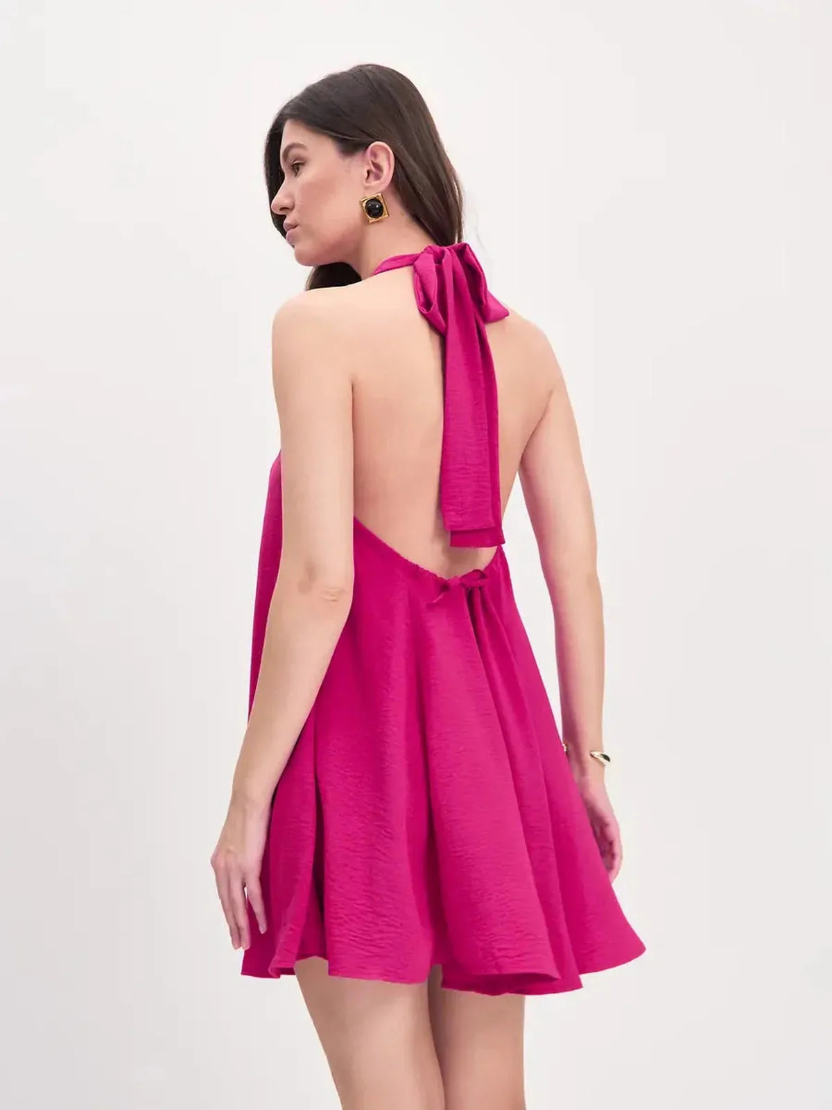 The gathered halter neck ties softly at the back, drawing attention to the shoulders and creating a refined, feminine shape. Crafted in a smooth raspberry-pink tone with a subtle sheen, the Flair Bloom Mini Dress embodies understated glamour — equally perfect for weddings, garden parties, or evening celebrations. The airy cut and inserted godet panels allow for free-flowing movement, while the unlined construction keeps it breathable and ideal for warm-weather wear.