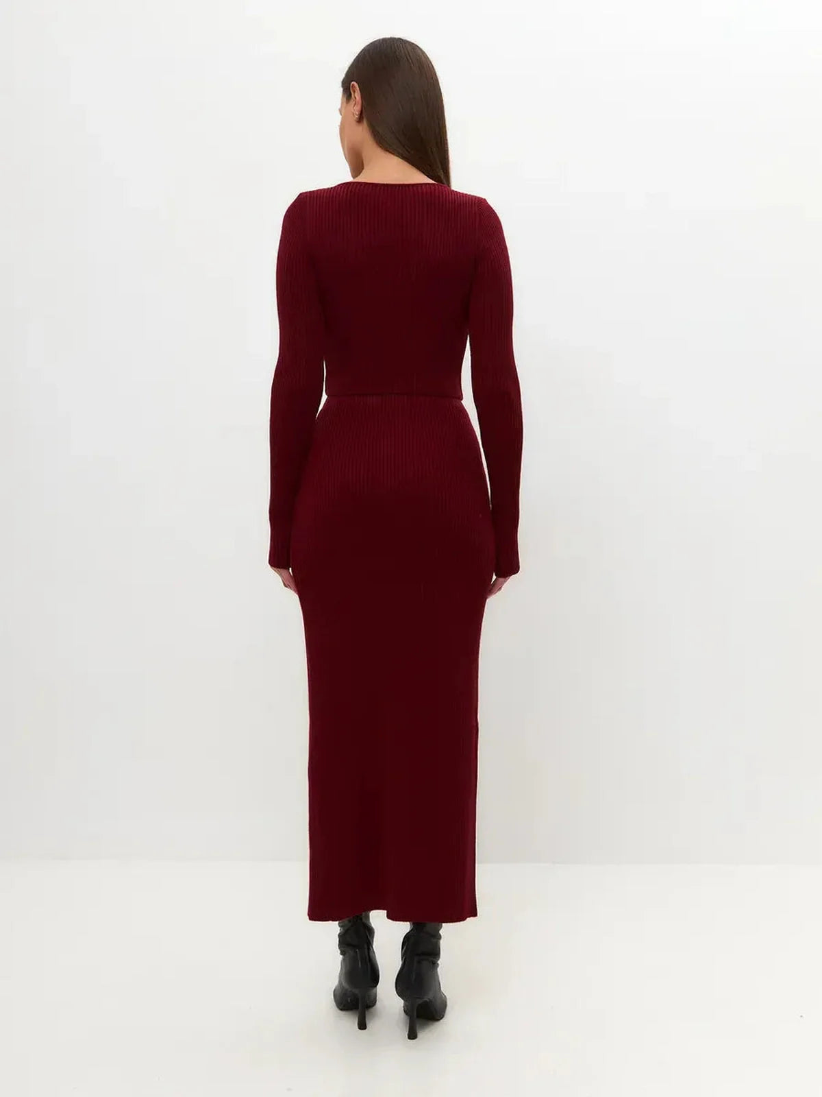 The elongated sleeves with thumbhole accents add a contemporary touch, while the streamlined midi skirt features a discreet back slit for ease of movement. In a deep cherry-burgundy hue, the set brings sophistication and versatility, making it perfect for transitional seasons, city evenings, or elevated loungewear.