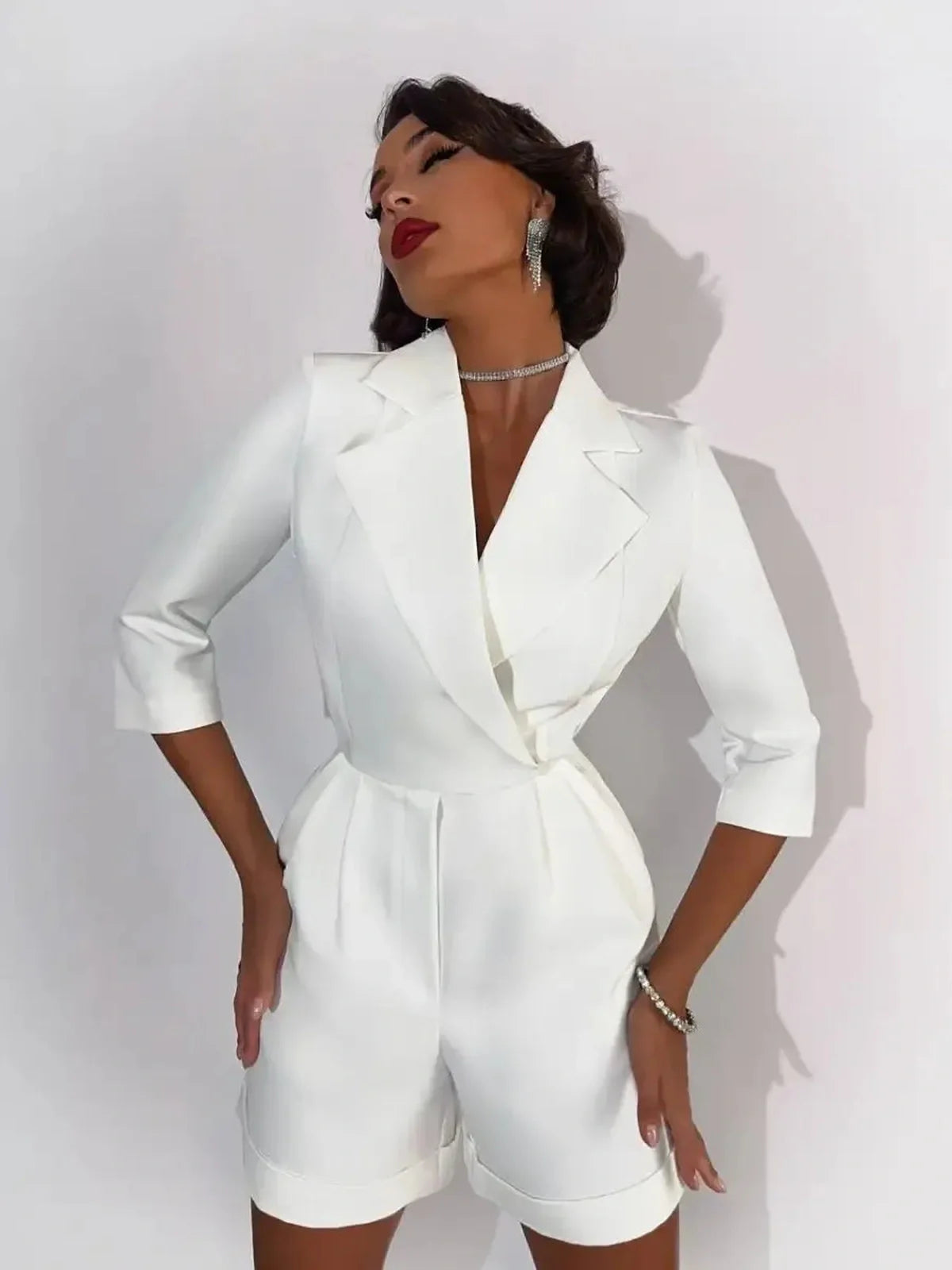 This white blazer-style playsuit brings tailored sophistication to summer styling. With a strong silhouette, pleated shorts, and lapel neckline, it elevates every outfit with an air of modern power dressing. Perfectly balanced between formal polish and sultry ease, it’s a standout piece that flatters from every angle.