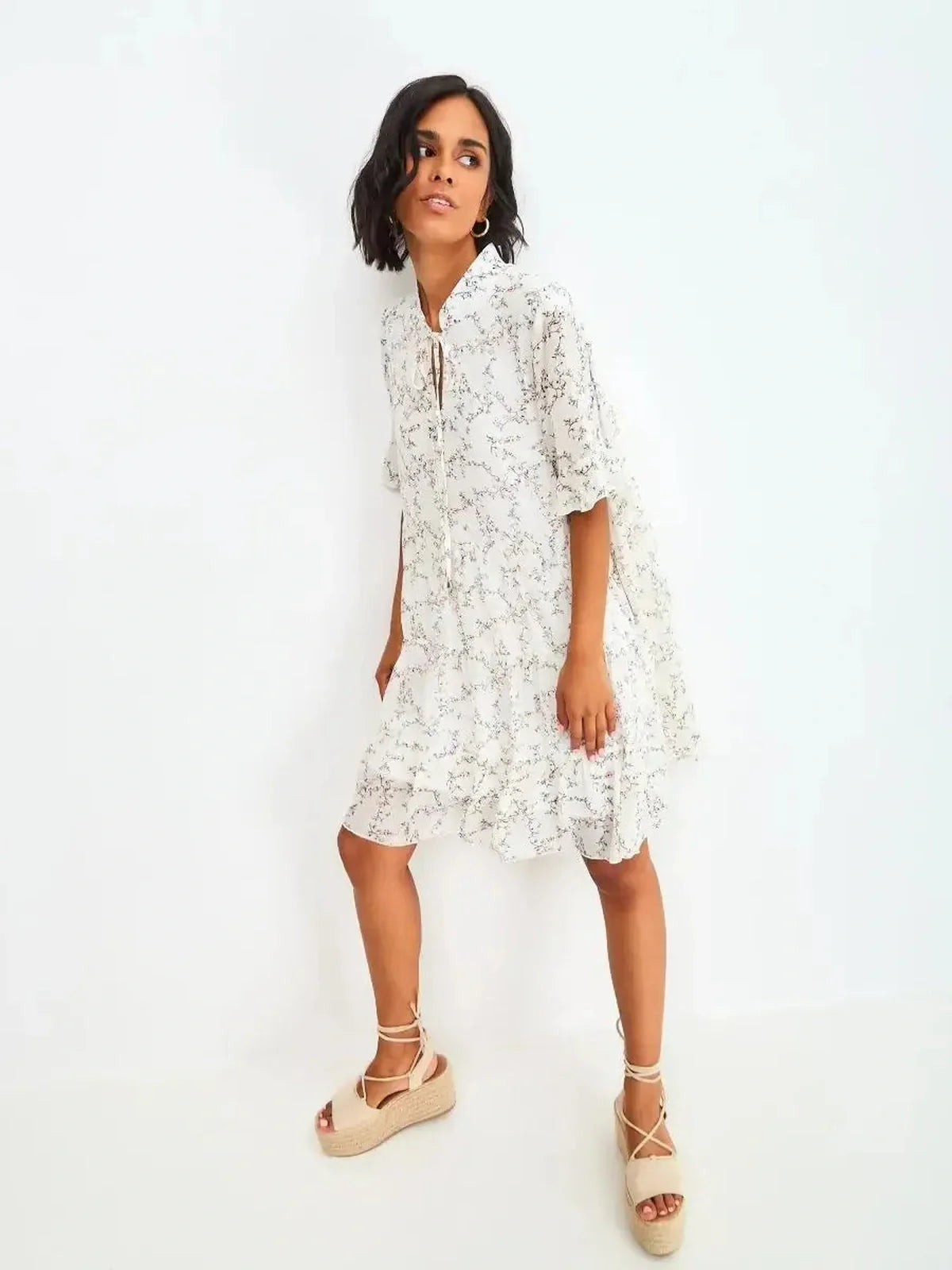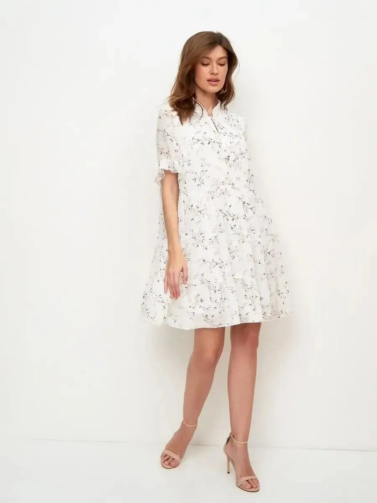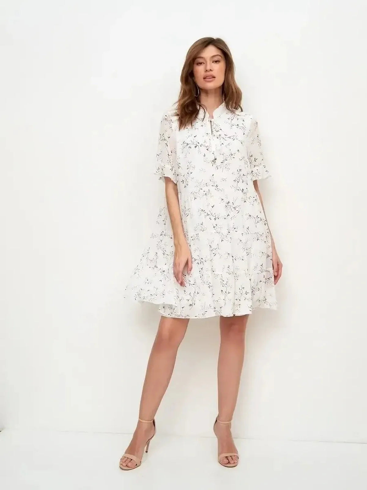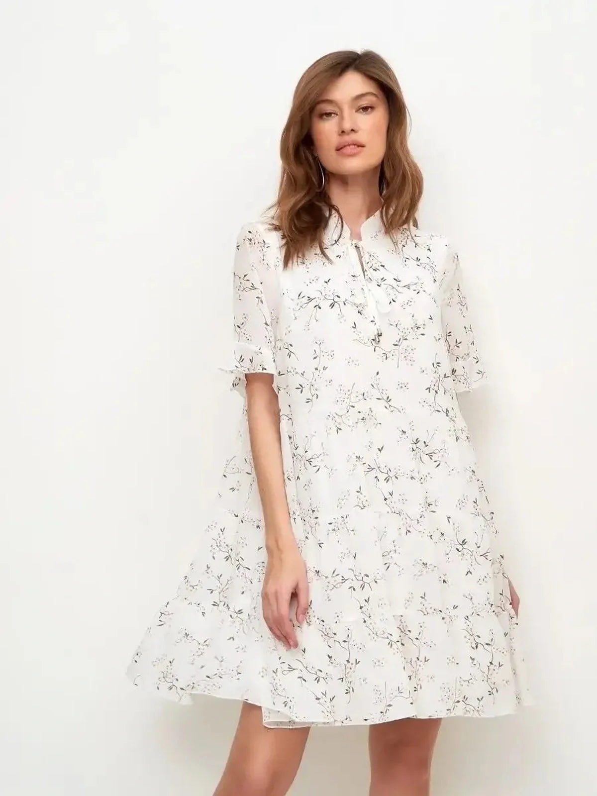 Designed in a flattering trapeze silhouette, it features a high stand collar with a delicate tie closure, accented by soft ruffles for a feminine touch. The ivory-white base is decorated with a subtle floral print, creating a look that feels fresh, romantic, and versatile. Flutter sleeves and a flowing skirt add volume and movement, making it as comfortable as it is elegant.