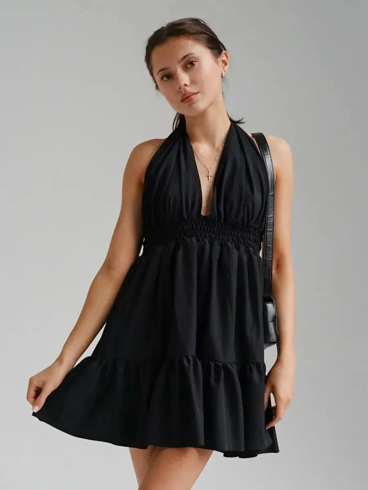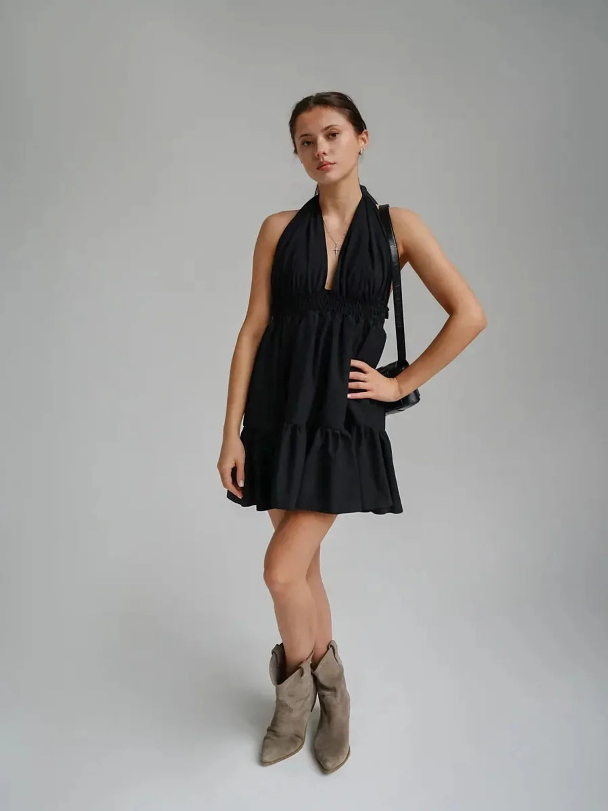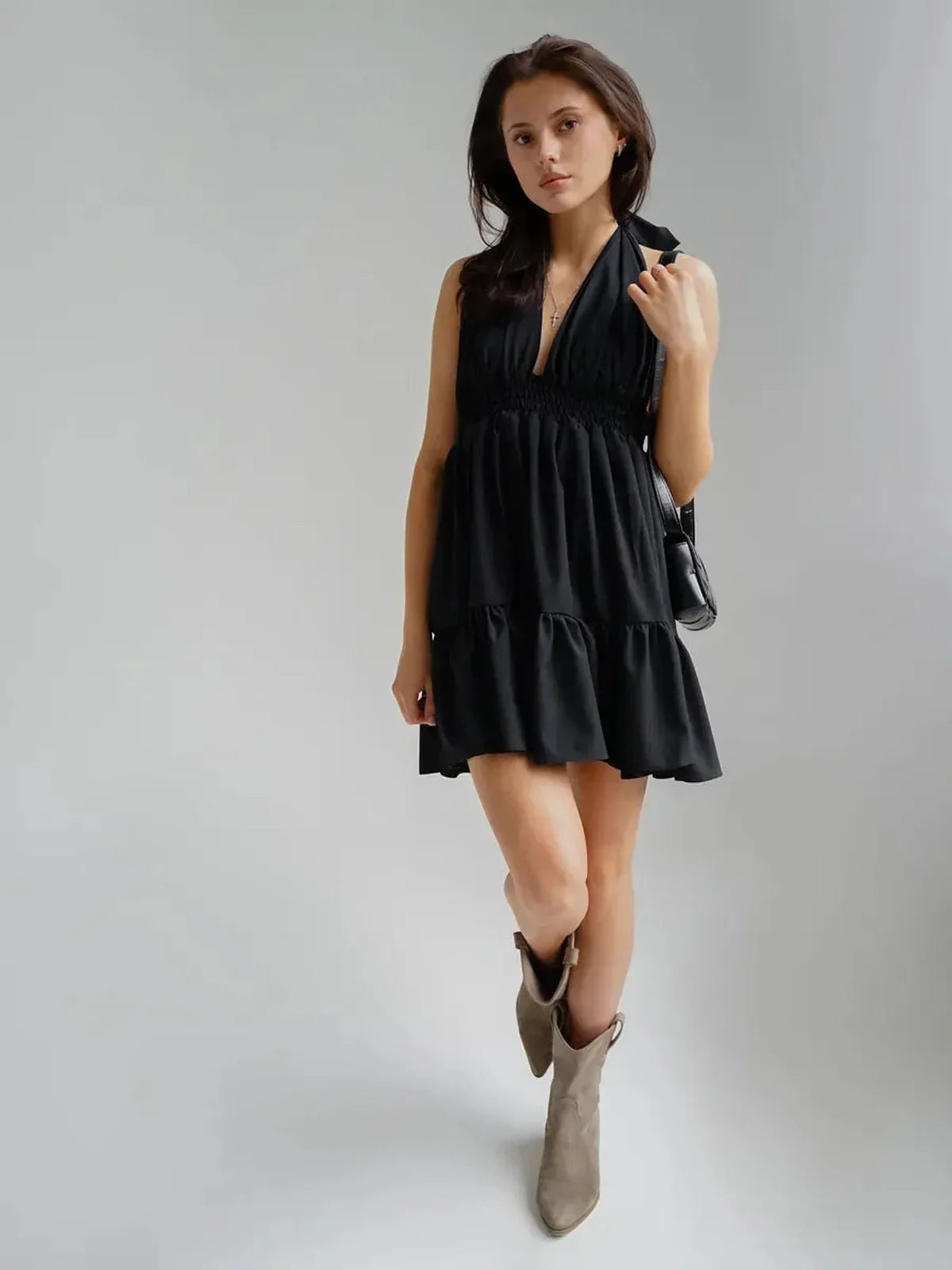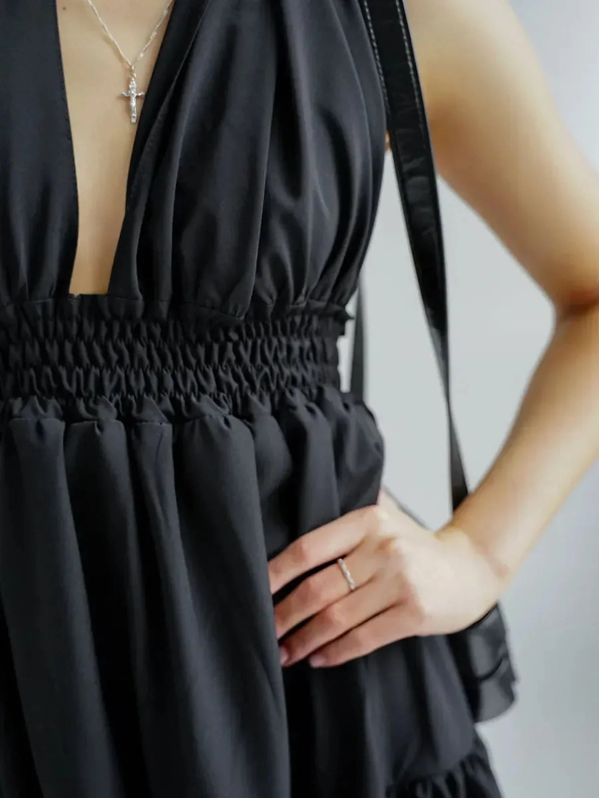 The Luna Flare Mini Dress features a gathered V-neckline and halter-style ties that adjust for a perfect, personalized fit. Its smocked waistband gently shapes the waist while ensuring flexible comfort, and the flared tiered skirt moves gracefully with every step. The matte black fabric adds subtle texture and sophistication — ideal for everything from daytime brunches to evening garden parties.