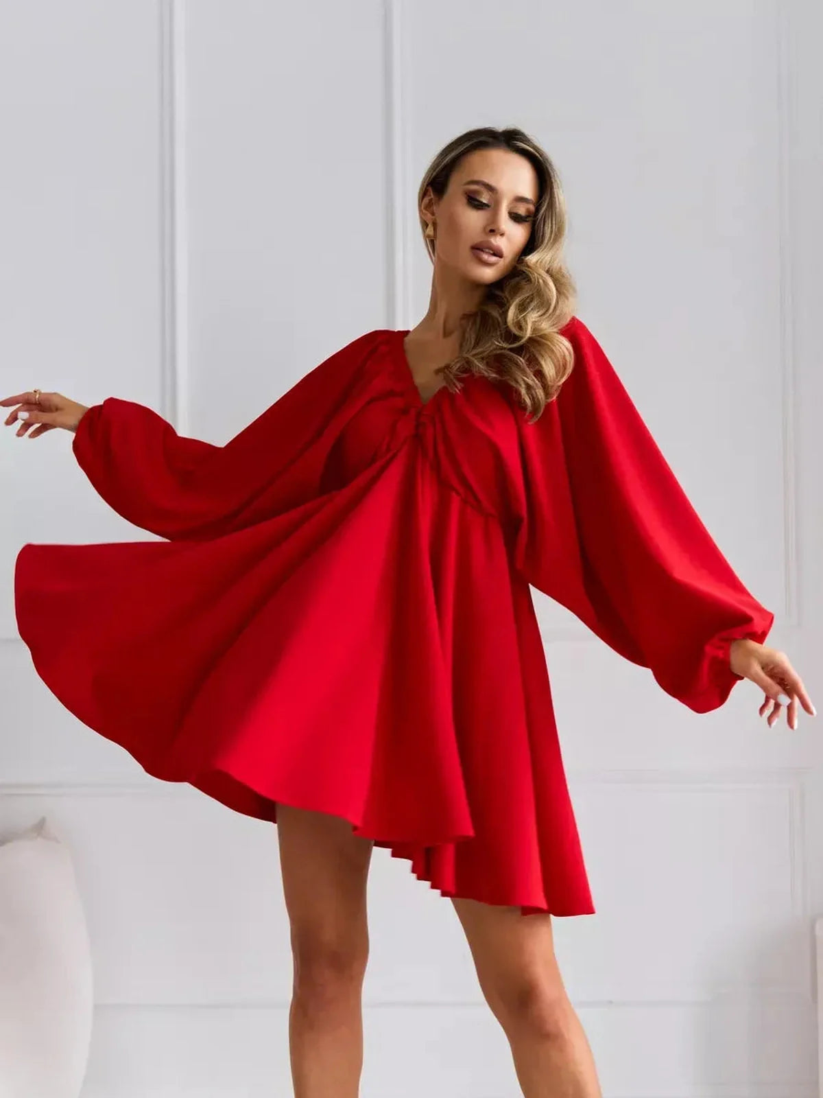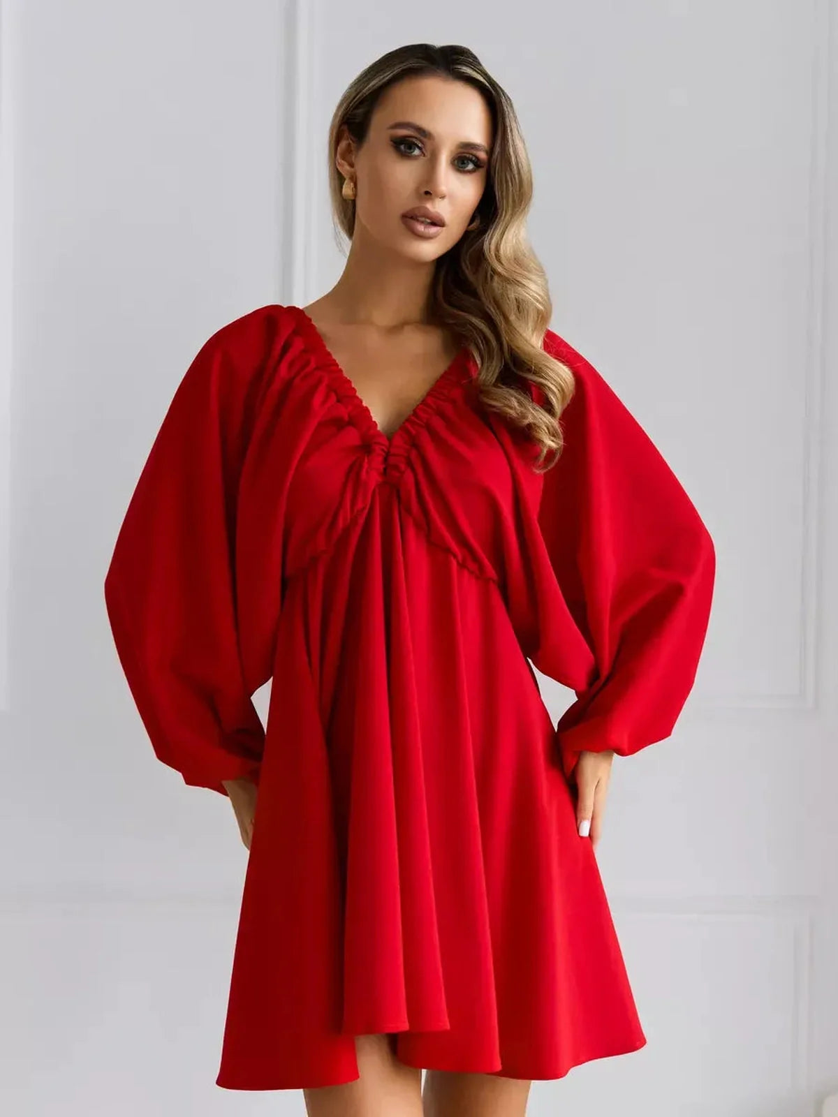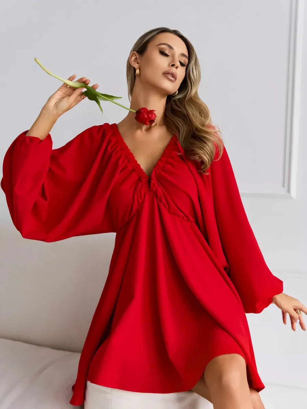 The plunging V-neckline is accented with delicate ruching and decorative buttons that beautifully shape the bustline, while voluminous long sleeves add movement and romance to the silhouette. The flattering A-line cut flows effortlessly over the body, enhancing every figure — from slender to curvy — and ensuring a graceful finish with every step. Unlined and pocket-free, the Luna Flare Mini Dress delivers a smooth, polished fit that’s easy to wear and even easier to adore.