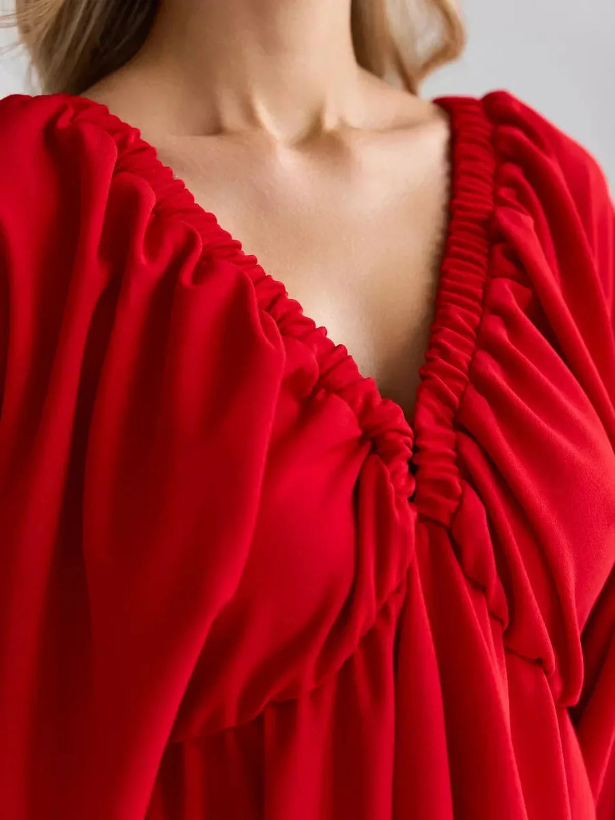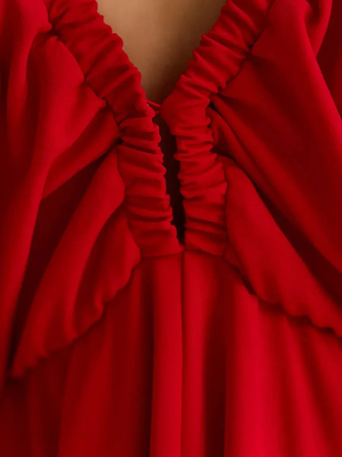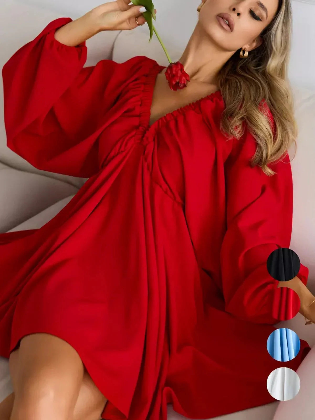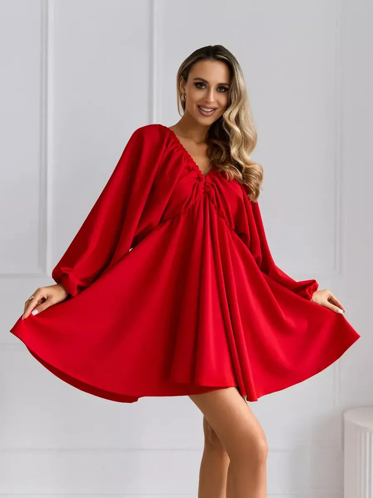 The plunging V-neckline is accented with delicate ruching and decorative buttons that beautifully shape the bustline, while voluminous long sleeves add movement and romance to the silhouette. The flattering A-line cut flows effortlessly over the body, enhancing every figure — from slender to curvy — and ensuring a graceful finish with every step. Unlined and pocket-free, the Luna Flare Mini Dress delivers a smooth, polished fit that’s easy to wear and even easier to adore.