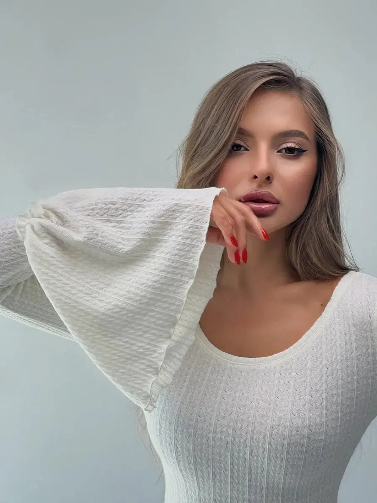 The Lustre Maxi Dress redefines sophistication with its sculpted silhouette and fluid knit design. Crafted from a soft, structured wool blend, this body-contouring piece embraces the figure with architectural precision while allowing for effortless movement. Its signature bell sleeves and subtly flounced hemline introduce graceful volume — a striking contrast to the minimalist, tailored frame.