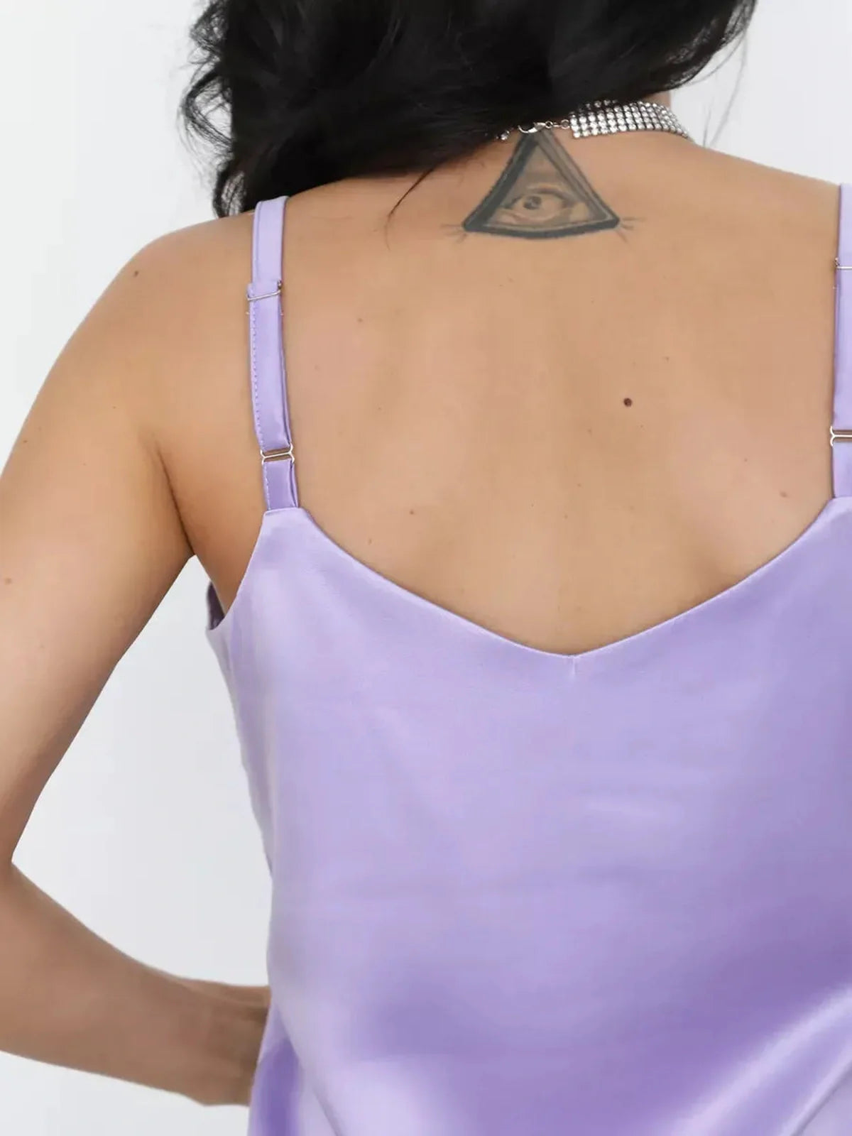 The Moonlit Mist Midi Dress captures the essence of effortless sophistication in a soft, luminous lilac hue. Crafted from silky satin with a fluid drape, this minimalist silhouette skims the body with elegant precision. The delicate V-neckline — mirrored at the front and back — enhances the neckline with understated allure, while adjustable straps allow for a perfectly tailored fit.