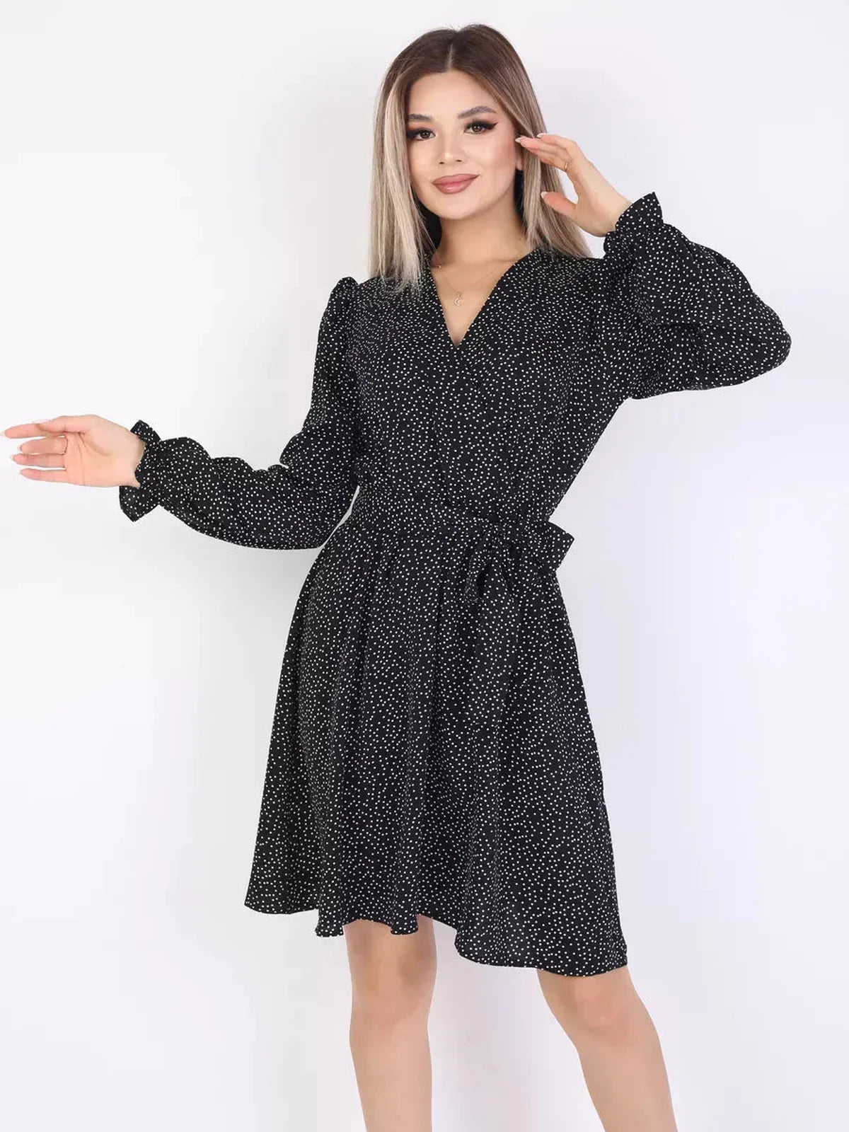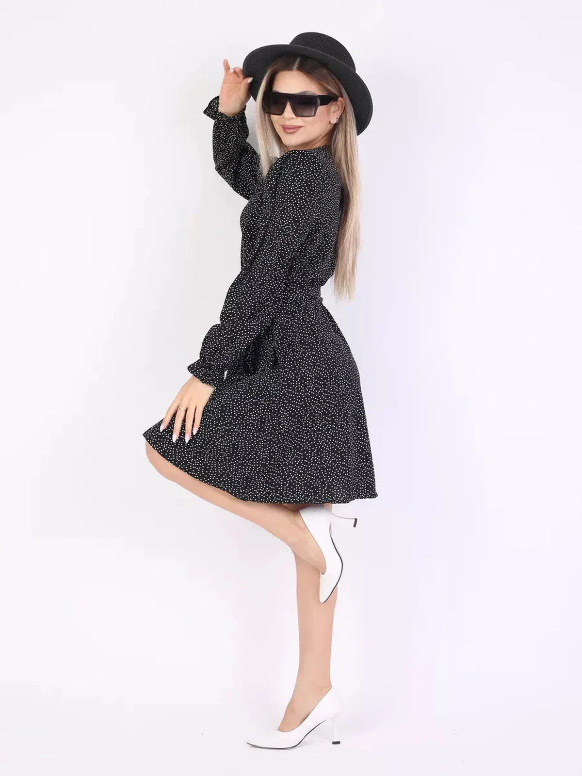 Effortlessly timeless and irresistibly chic, the Midnight Dots Mini Dress is your go-to piece for refined everyday style and elegant evening moments. Designed in a flattering wrap silhouette, this black mini dress features crisp white polka dots that add a playful yet polished touch. The adjustable self-tie belt defines the waist beautifully, while the flared skirt creates fluid movement that complements every figure.