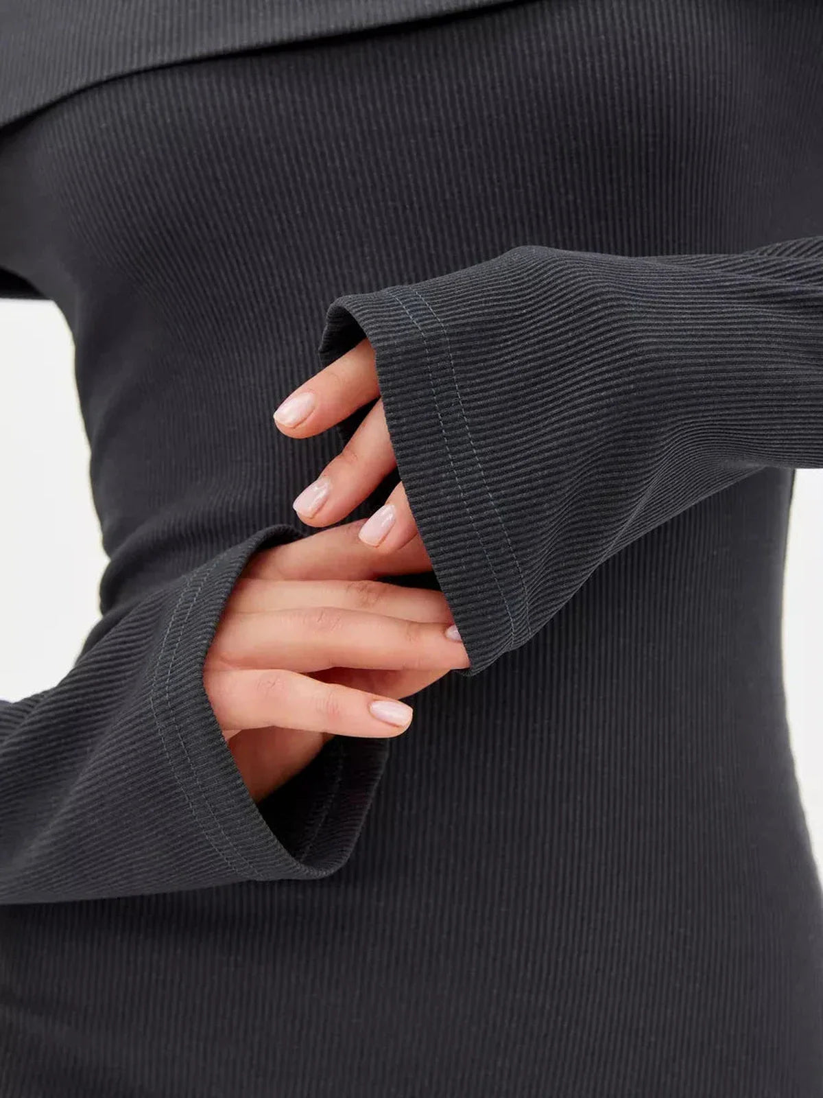 The Midnight Drape Midi Dress redefines understated luxury with its fluid lines and sculpted silhouette. Crafted from a soft ribbed knit, this off-shoulder design drapes effortlessly across the neckline, creating an elegant frame that highlights the collarbones and shoulders. Its body-contouring fit flatters every curve, offering both comfort and allure in one timeless piece.