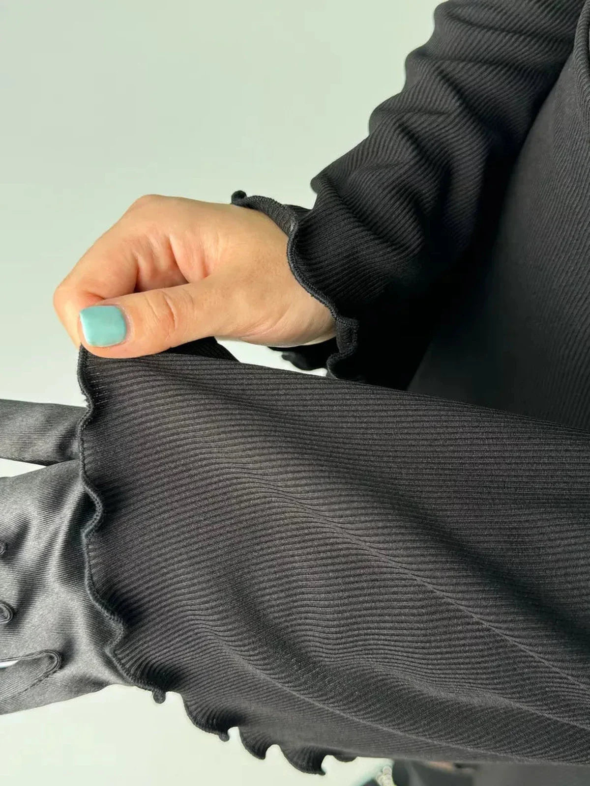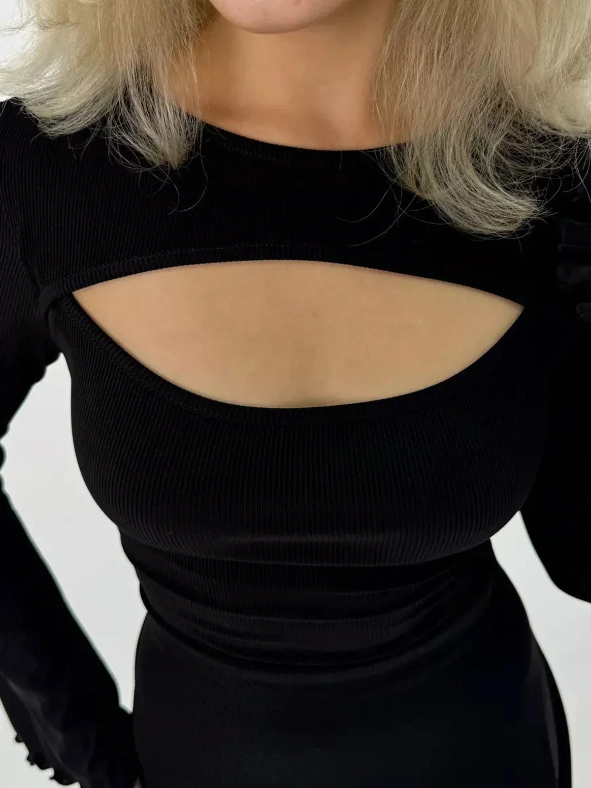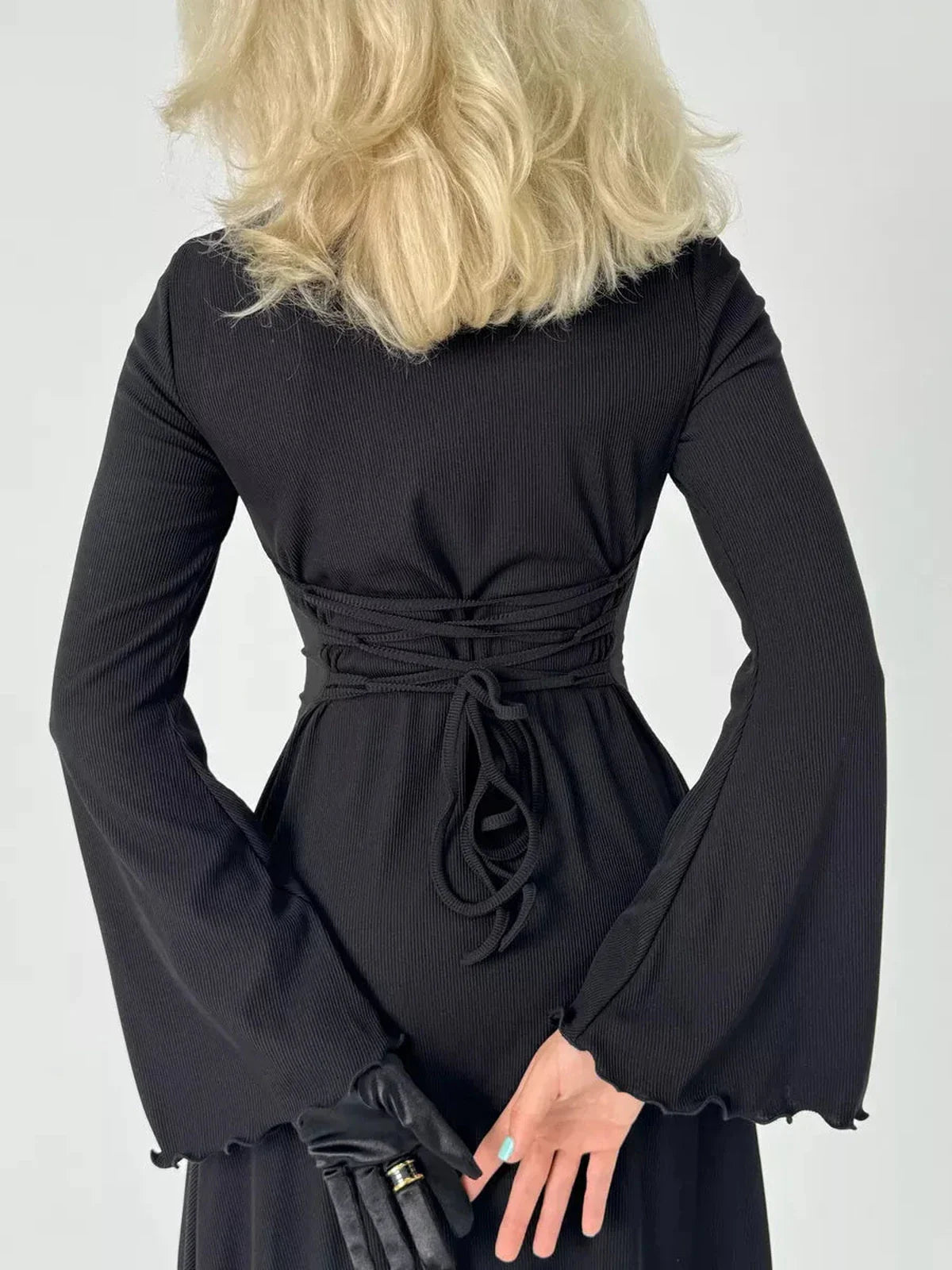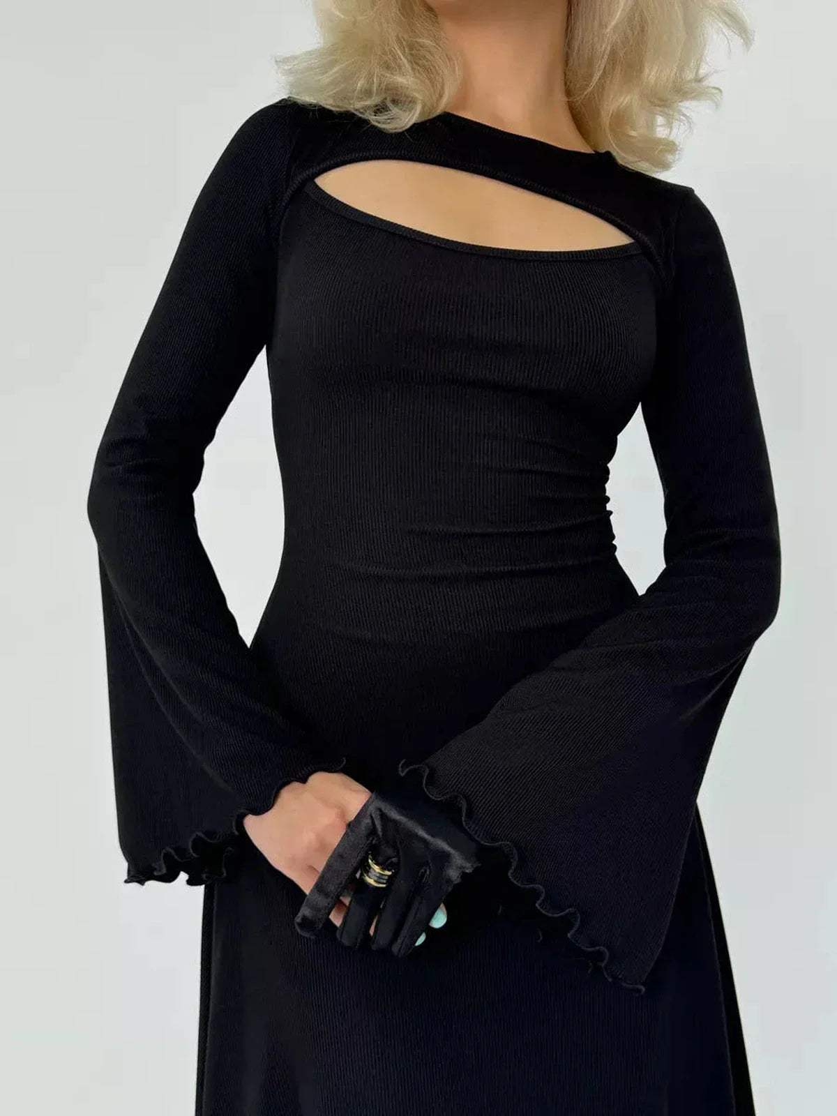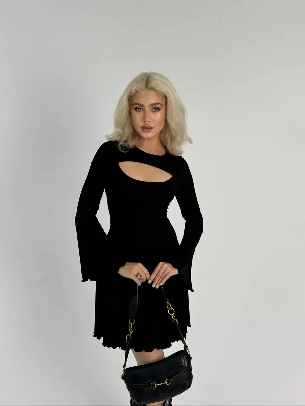 The cutout bodice and soft boat neckline introduce an irresistible touch of allure, balancing modern minimalism with feminine energy. Long flared sleeves with delicate lettuce-edge trim add a dramatic yet refined finish, while the adjustable tie-back detail ensures a cinched, tailored fit that flatters from every angle. Polished yet striking, this piece delivers magnetic presence from dusk to dawn.