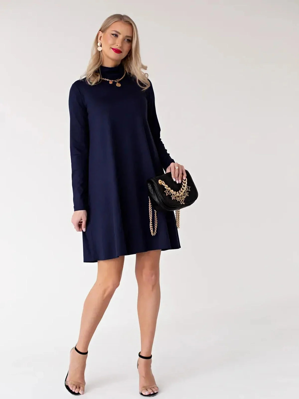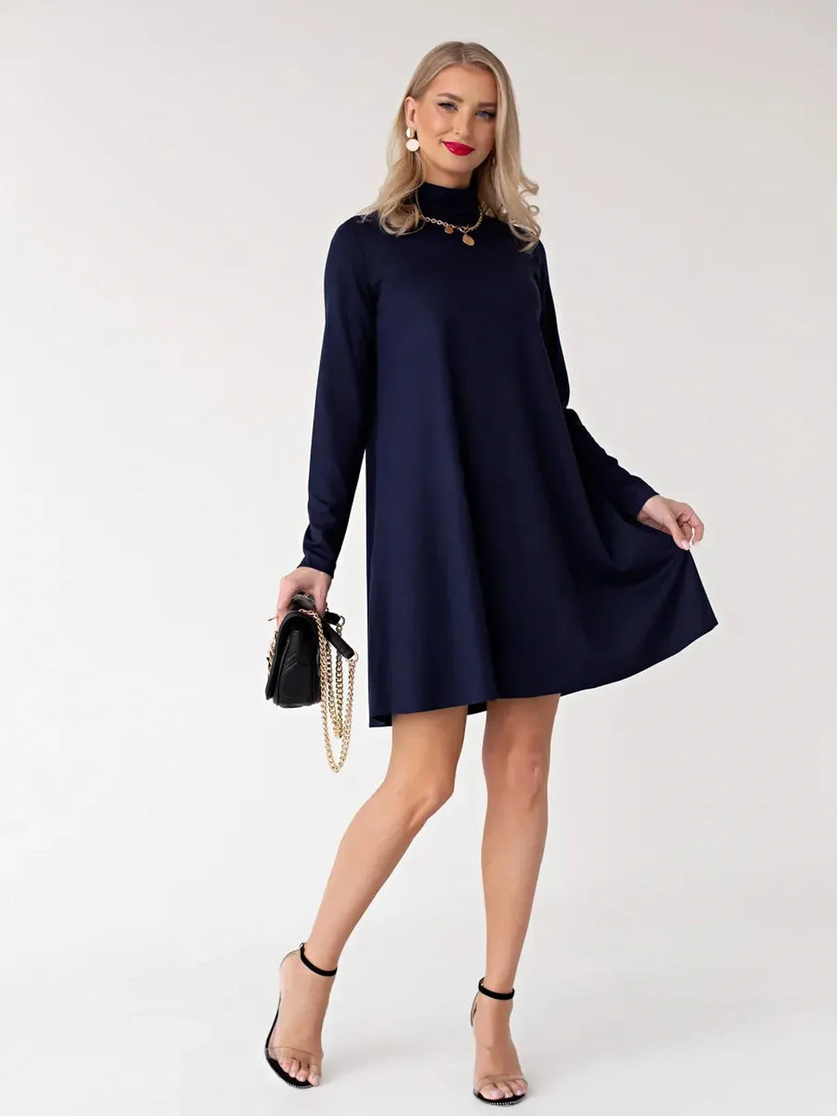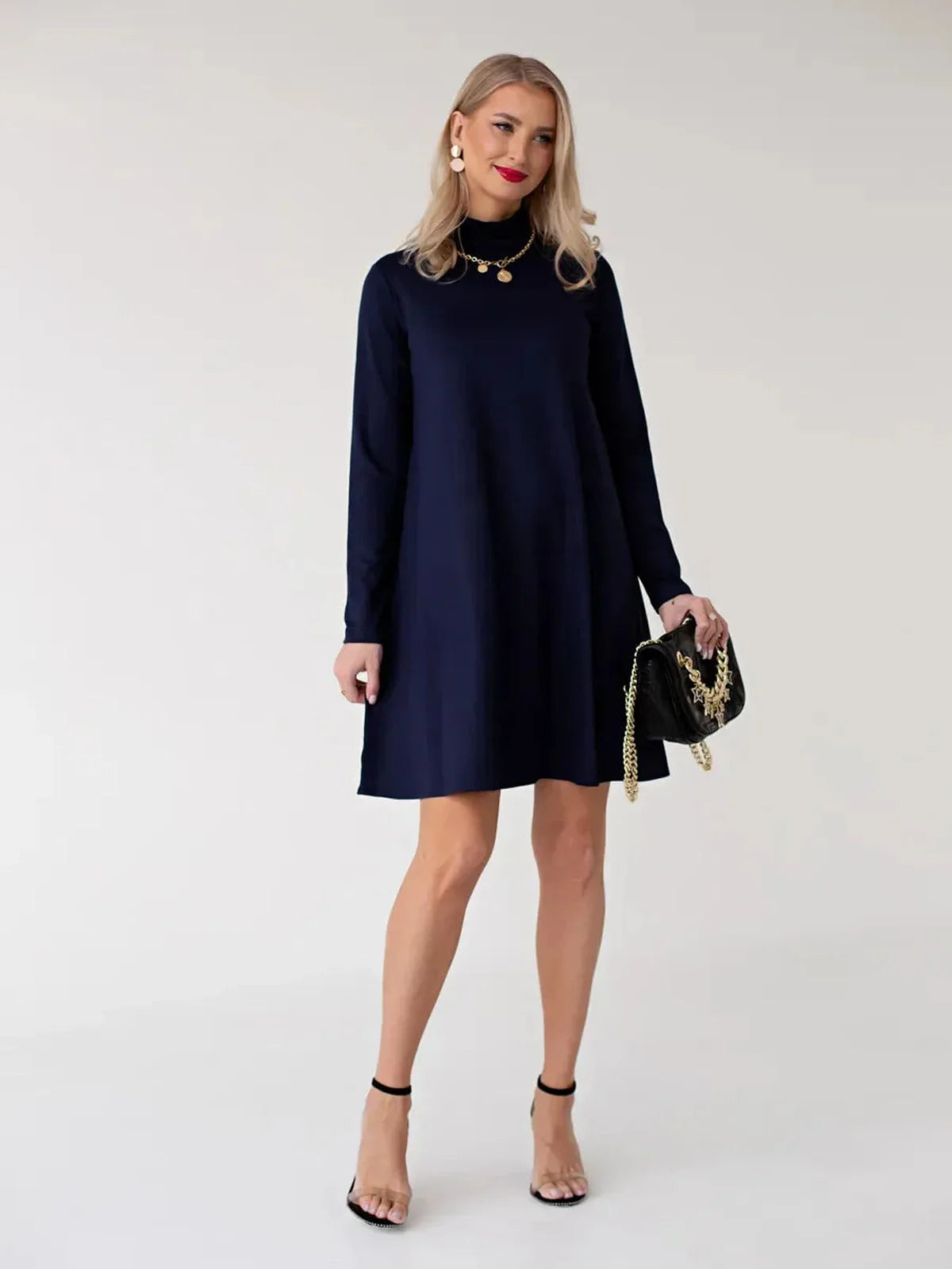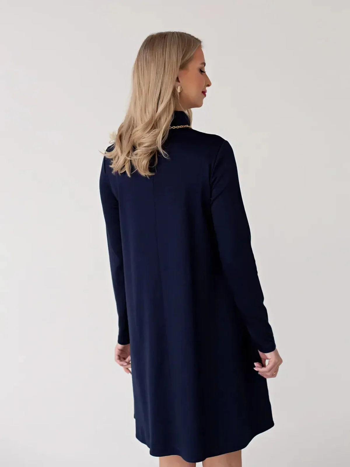 Embrace refined sophistication with the Midnight Grace Mini Dress — a timeless navy piece that balances structured elegance with modern ease. Designed in a classic A-line silhouette and crafted from a premium viscose, polyester, and elastane blend, this women’s long sleeve mini dress offers a smooth, breathable feel and a polished drape that flatters every figure.