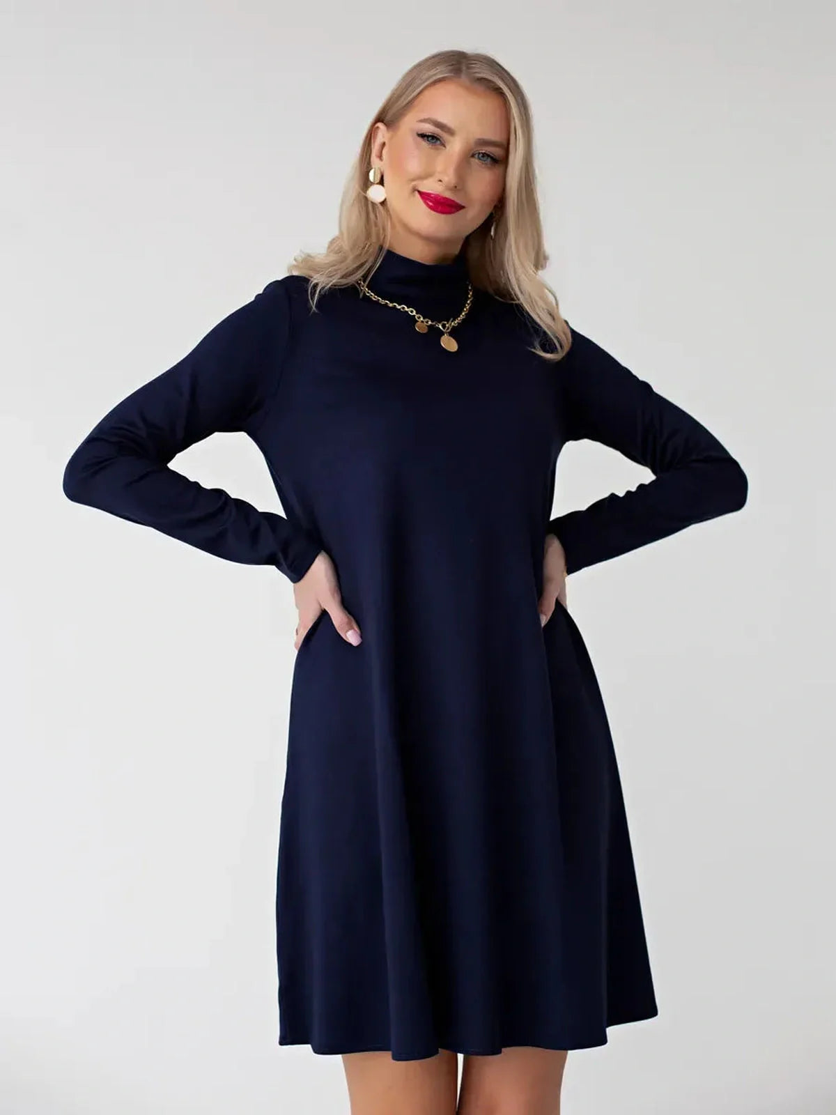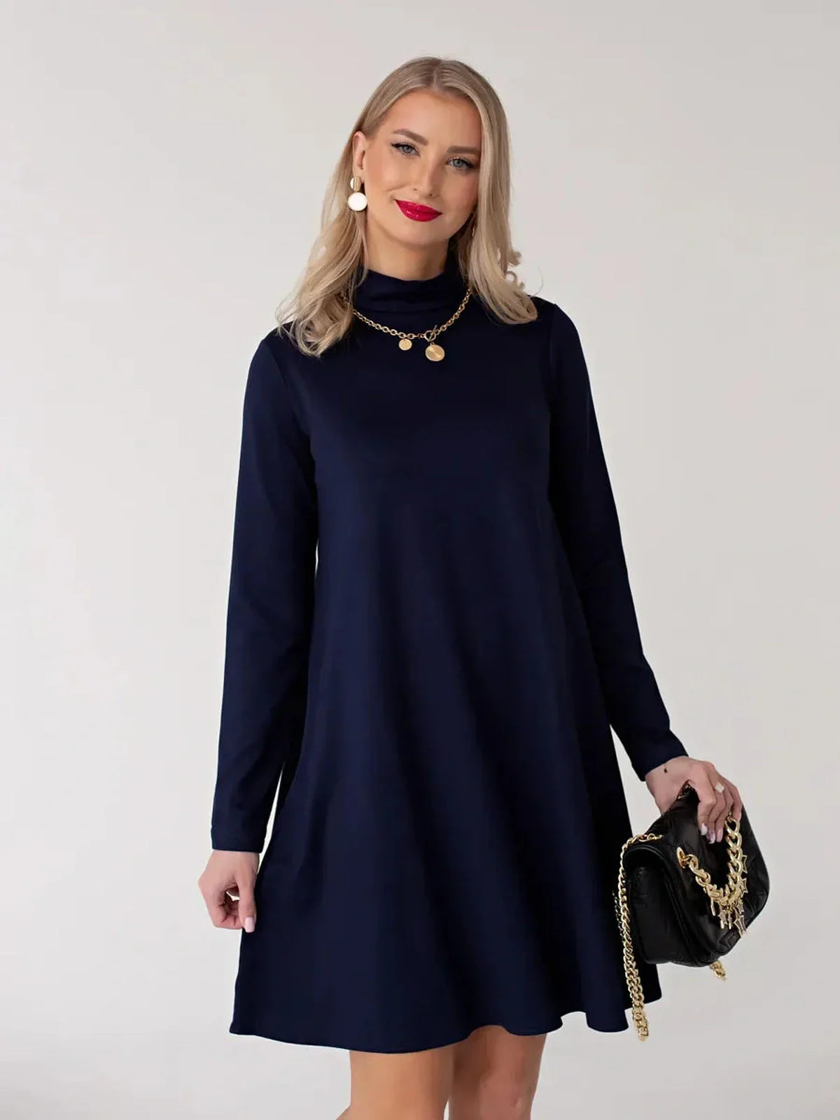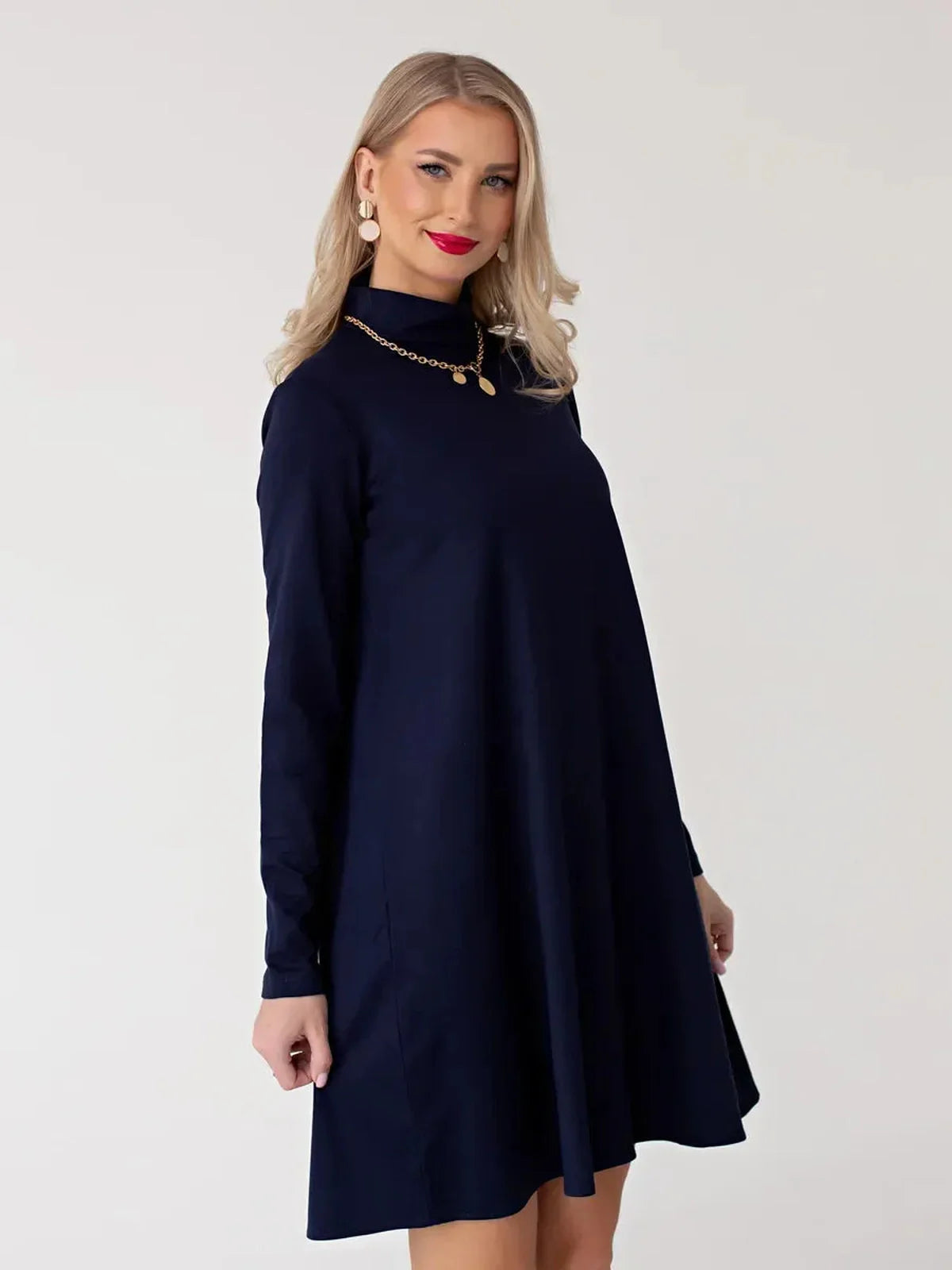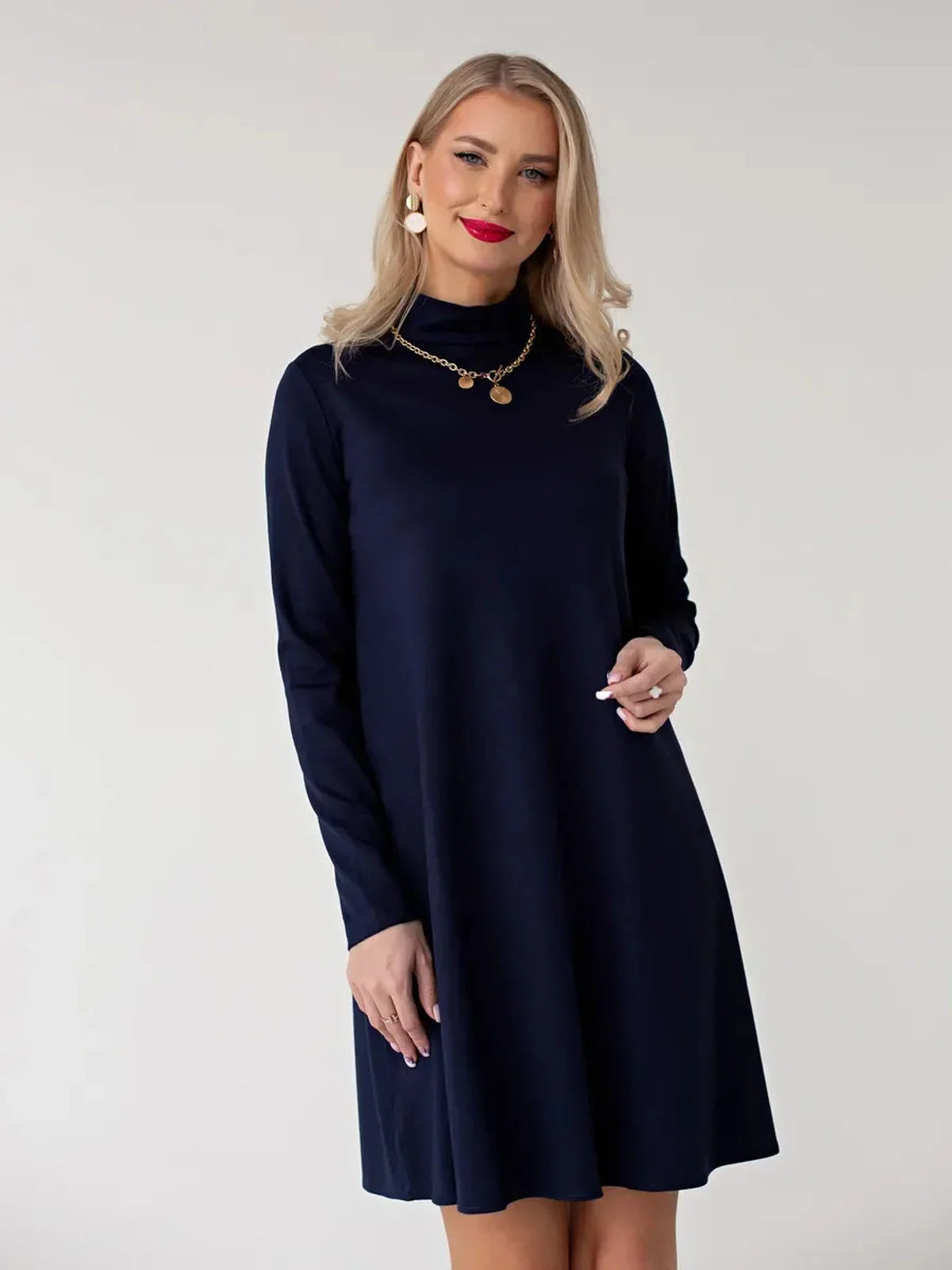 Embrace refined sophistication with the Midnight Grace Mini Dress — a timeless navy piece that balances structured elegance with modern ease. Designed in a classic A-line silhouette and crafted from a premium viscose, polyester, and elastane blend, this women’s long sleeve mini dress offers a smooth, breathable feel and a polished drape that flatters every figure.