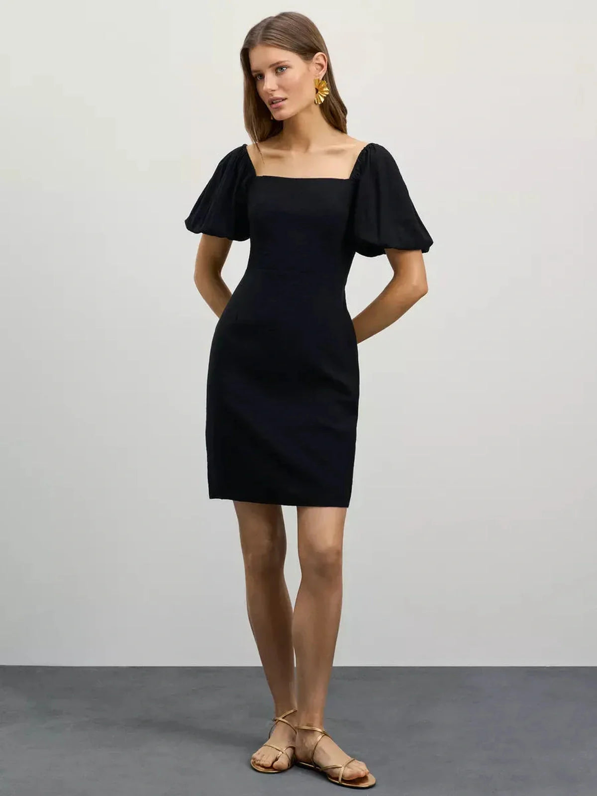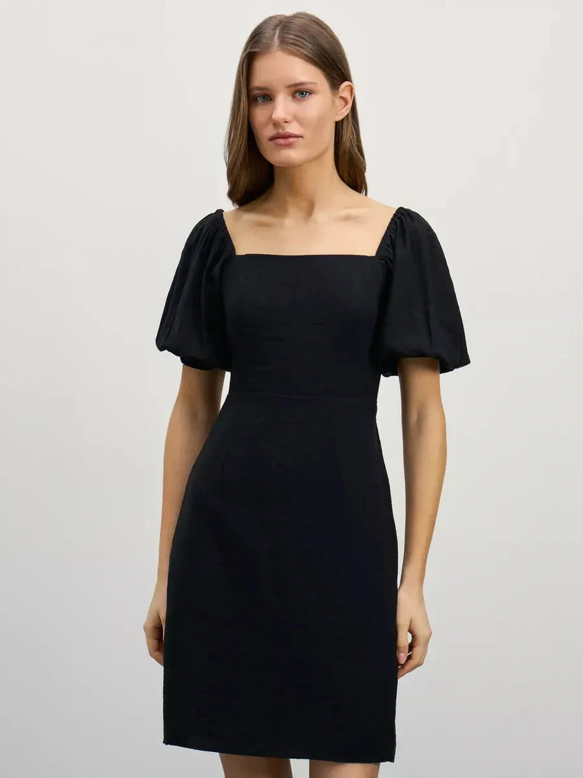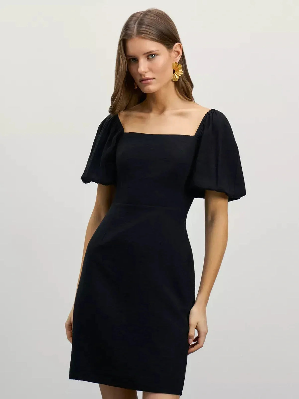 The chic square neckline frames the décolletage, complemented by voluminous puff sleeves that add a fashion-forward edge. A concealed back zipper ensures a seamless finish, while the unlined construction keeps the dress light and versatile. Its clean, unembellished design makes it the perfect canvas to style with bold jewelry or refined accessories for any occasion.