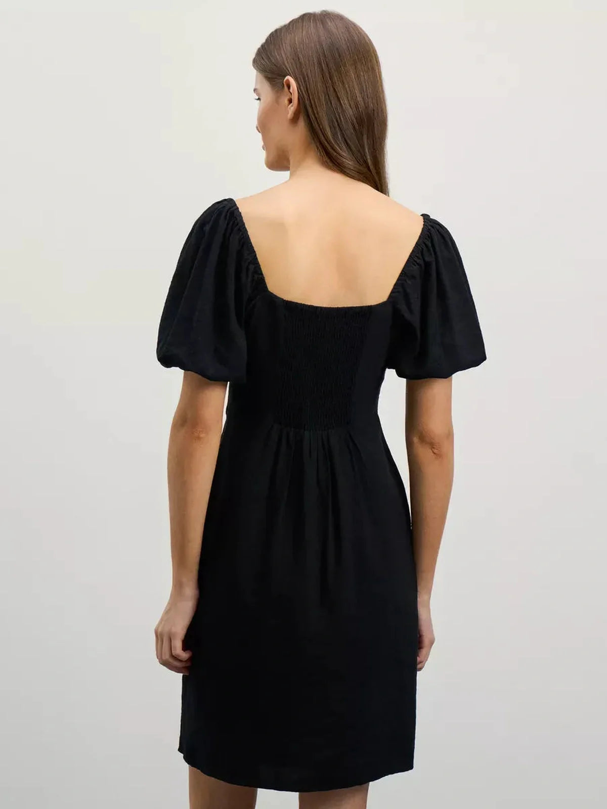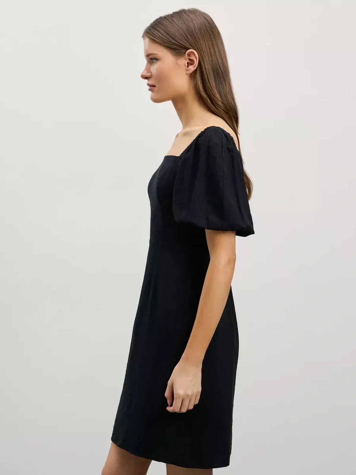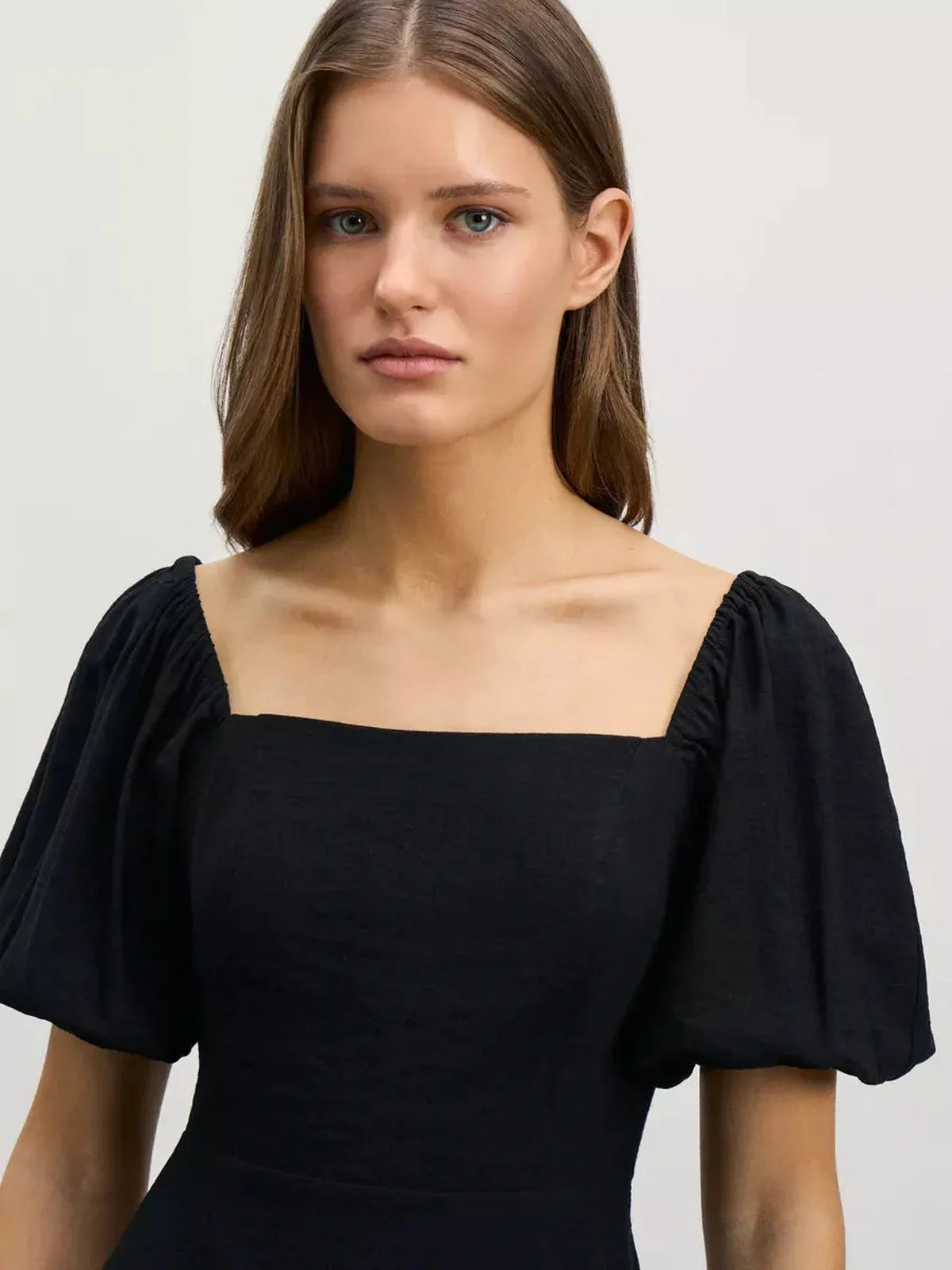 The chic square neckline frames the décolletage, complemented by voluminous puff sleeves that add a fashion-forward edge. A concealed back zipper ensures a seamless finish, while the unlined construction keeps the dress light and versatile. Its clean, unembellished design makes it the perfect canvas to style with bold jewelry or refined accessories for any occasion.