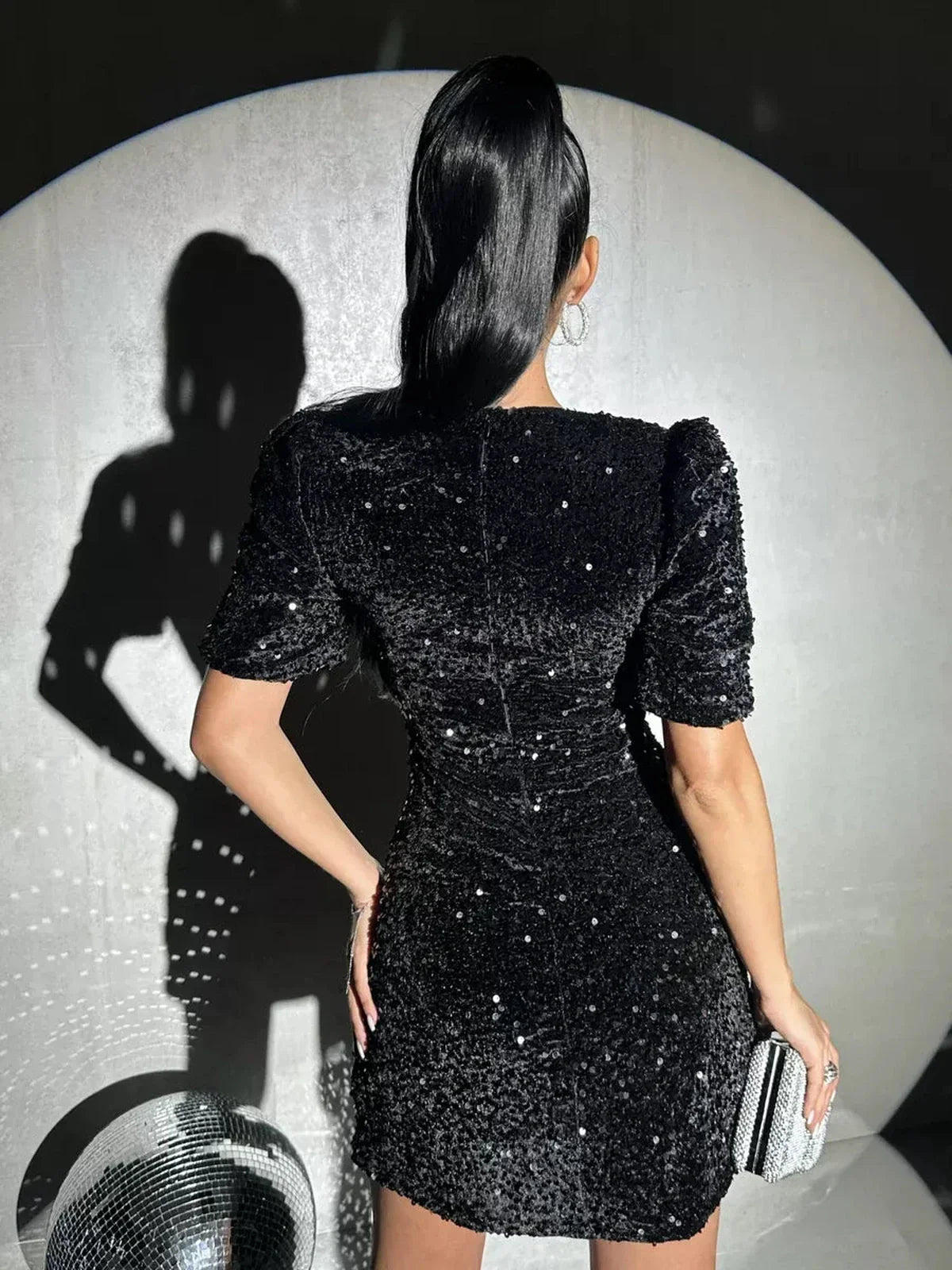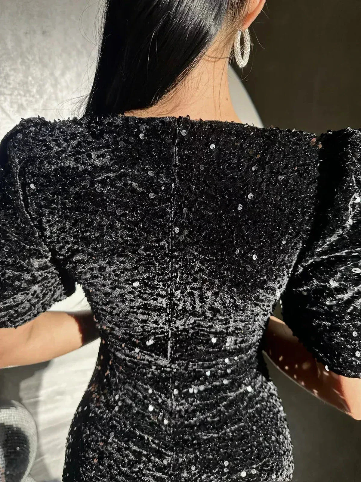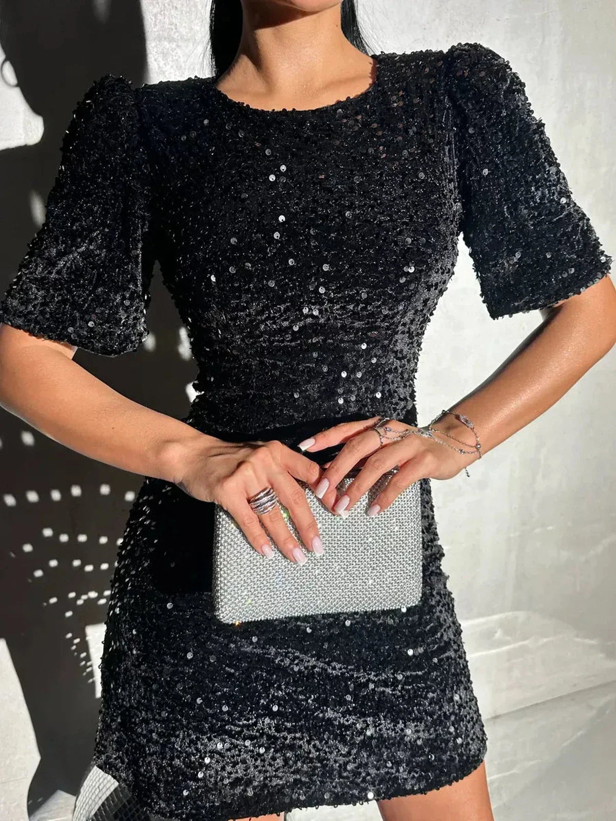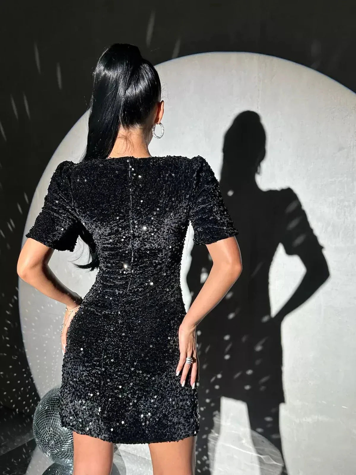 Shine brighter than the city lights in the Lunara Mini Dress, a striking embodiment of refined glamour and confident allure. Crafted from 100% polyester with a soft, velvet-like base, this women’s black sequin mini dress delivers show-stopping brilliance while maintaining luxurious comfort and a flawless fit.