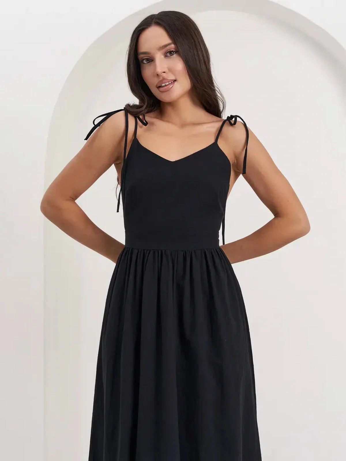 The Muse Midi Dress combines timeless sophistication with modern ease, making it a wardrobe staple for warm-weather occasions. Crafted entirely from breathable cotton, this black midi dress features a refined open back, slim tie straps, and a softly gathered skirt for a silhouette that feels both elevated and effortless. Perfect for weddings, summer parties, or evening soirées, it brings understated glamour to every moment.