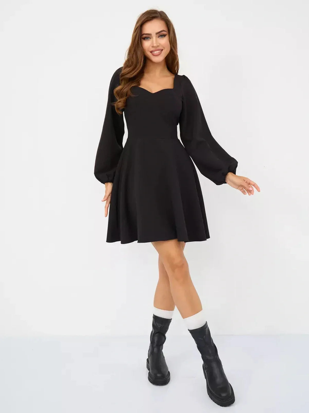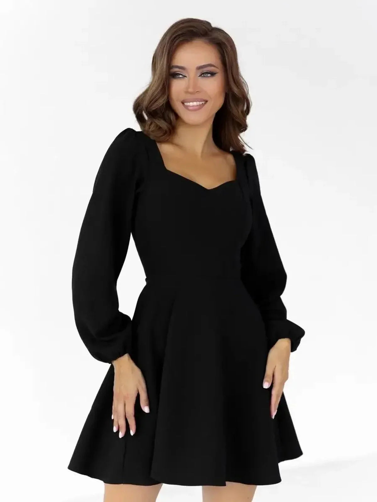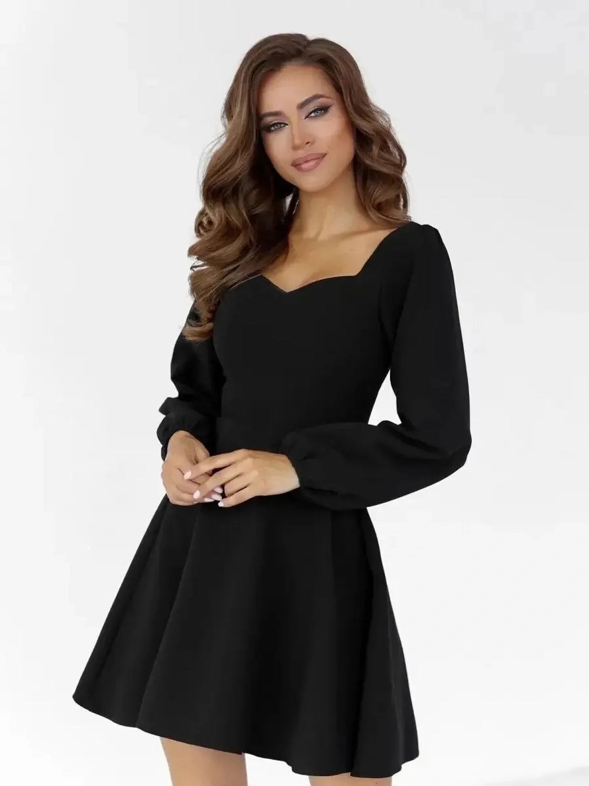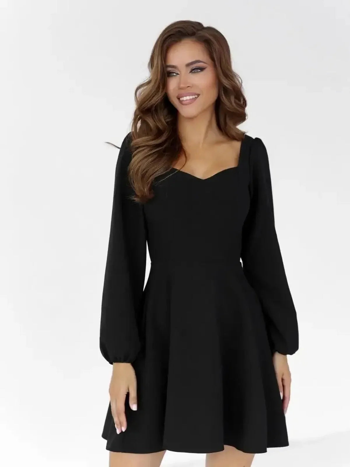 The Noir Charm Mini Dress is the definition of timeless sophistication with a modern twist. Crafted from a luxurious blend of 70% polyester, 27% viscose, and 3% elastane, this piece is designed to move with you — flattering the figure while offering all-day comfort and lasting structure. The sculpted bodice features a refined sweetheart square neckline, softly gathered shoulders, and long sleeves that balance elegance with understated allure.