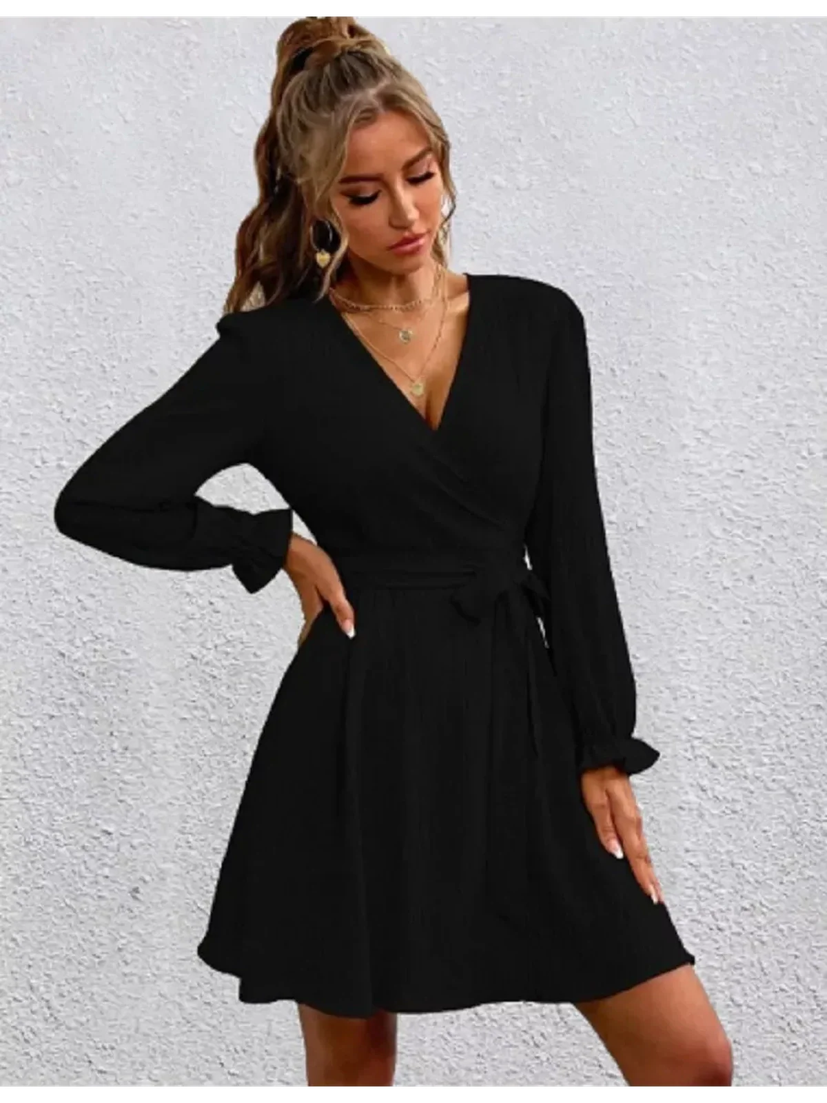 Redefine everyday sophistication with the Midnight Wrap Mini Dress — a versatile black essential that effortlessly blends comfort, style, and femininity. Crafted from soft, stretchy spandex, this long sleeve mini dress features a flattering wrap silhouette that accentuates the waist with a self-tie belt, creating a graceful hourglass shape that flatters every figure.