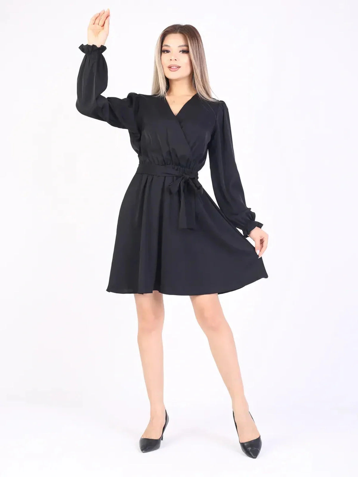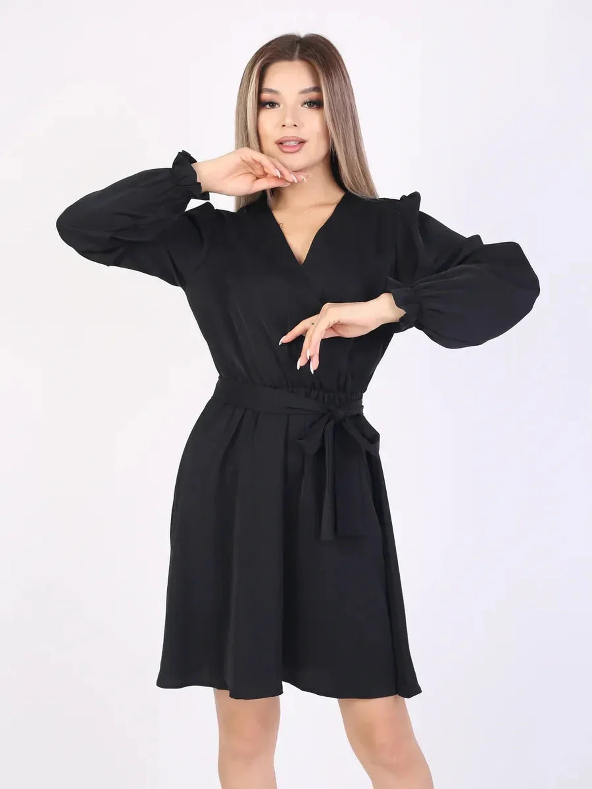 Step into sophistication with the Onyx Wrap Mini Dress — a beautifully tailored piece that redefines effortless elegance. Designed in a flattering wrap silhouette, this chic black mini dress features a V-neckline, a self-tie waist belt, and graceful long puffed sleeves finished with ruffled cuffs for a romantic touch. Every detail is crafted to accentuate your shape while maintaining all-day comfort and movement.