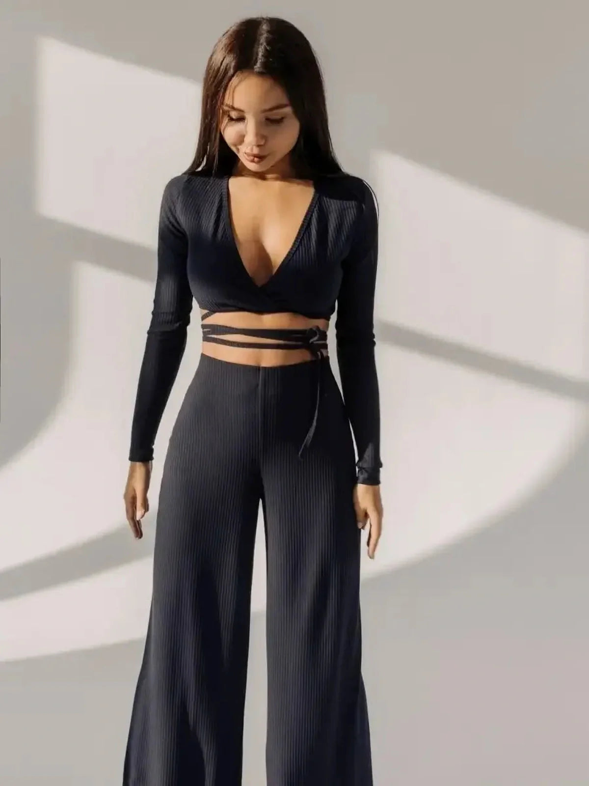 The ribbed knit fabric provides natural stretch and breathability, ensuring all-day ease without compromising elegance. The wrap-tie detail accentuates the waist, while the wide-leg trousers offer graceful movement and modern polish. With clean lines and versatile styling potential, the Noir Wrap Set transitions seamlessly from daytime wear to evening outings.