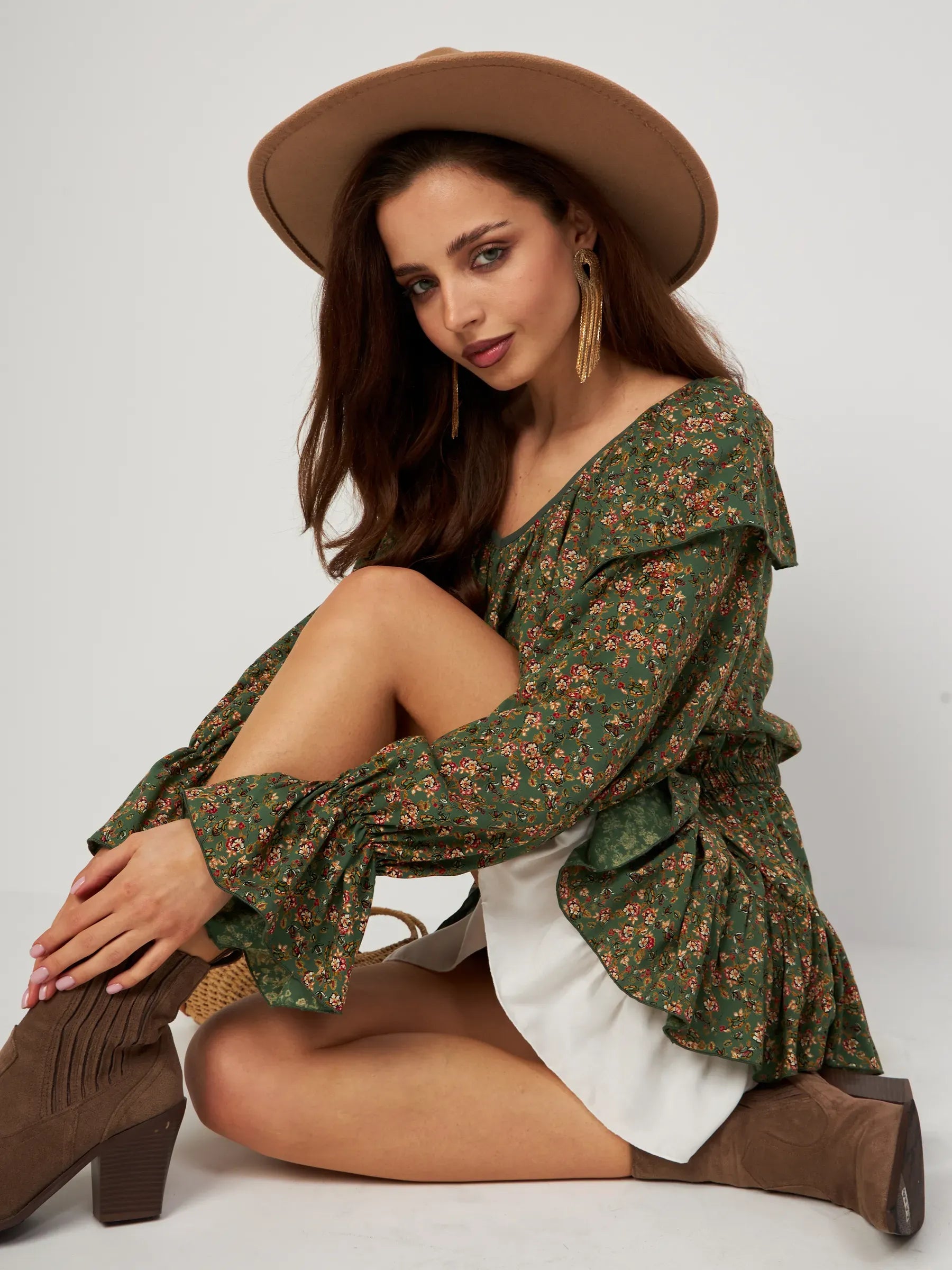 Designed in a rich olive green tone with a delicate floral print, the dress features a feminine V-neckline and soft ruffle details that frame the figure beautifully. Long flowy sleeves add elegance and ease, while the tiered hemline with a crisp white underlayer introduces a playful contrast. Slip-on styling with no zippers or fasteners ensures effortless wear and all-day comfort.