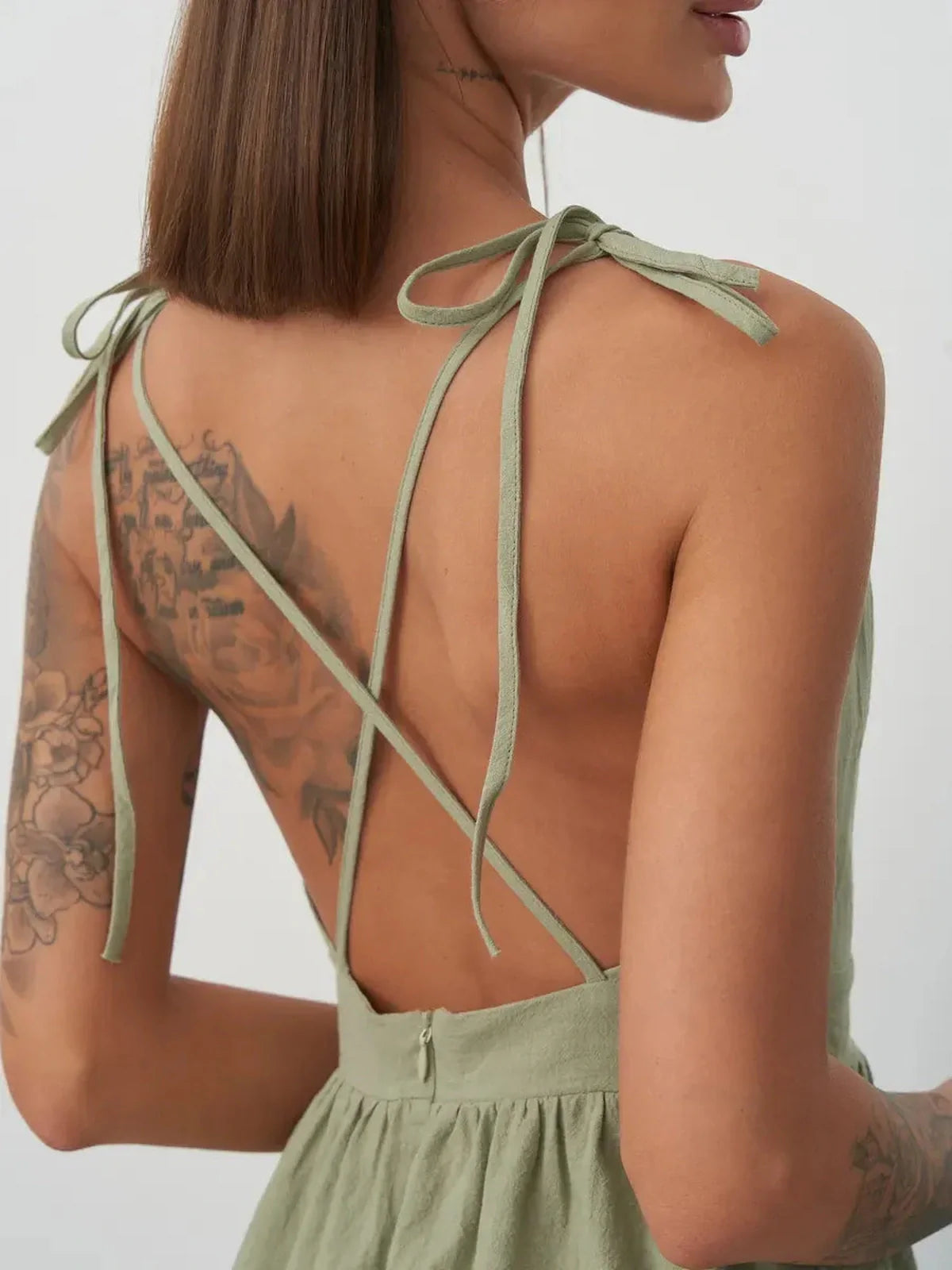 Elevate your warm-weather wardrobe with the Olive Whisper Mini Dress, a breathable 100% cotton piece designed for graceful, everyday sophistication. Its smooth texture and feminine lines create an airy silhouette that moves beautifully with you. A flattering U-neckline and crisscross back straps tie delicately at the shoulders, while the high waist and flared skirt lend structure and charm to this timeless summer dress.