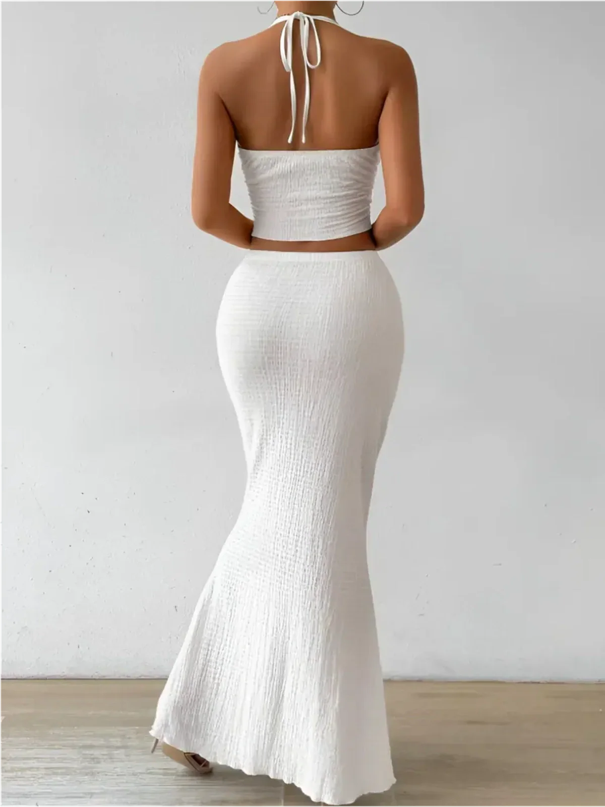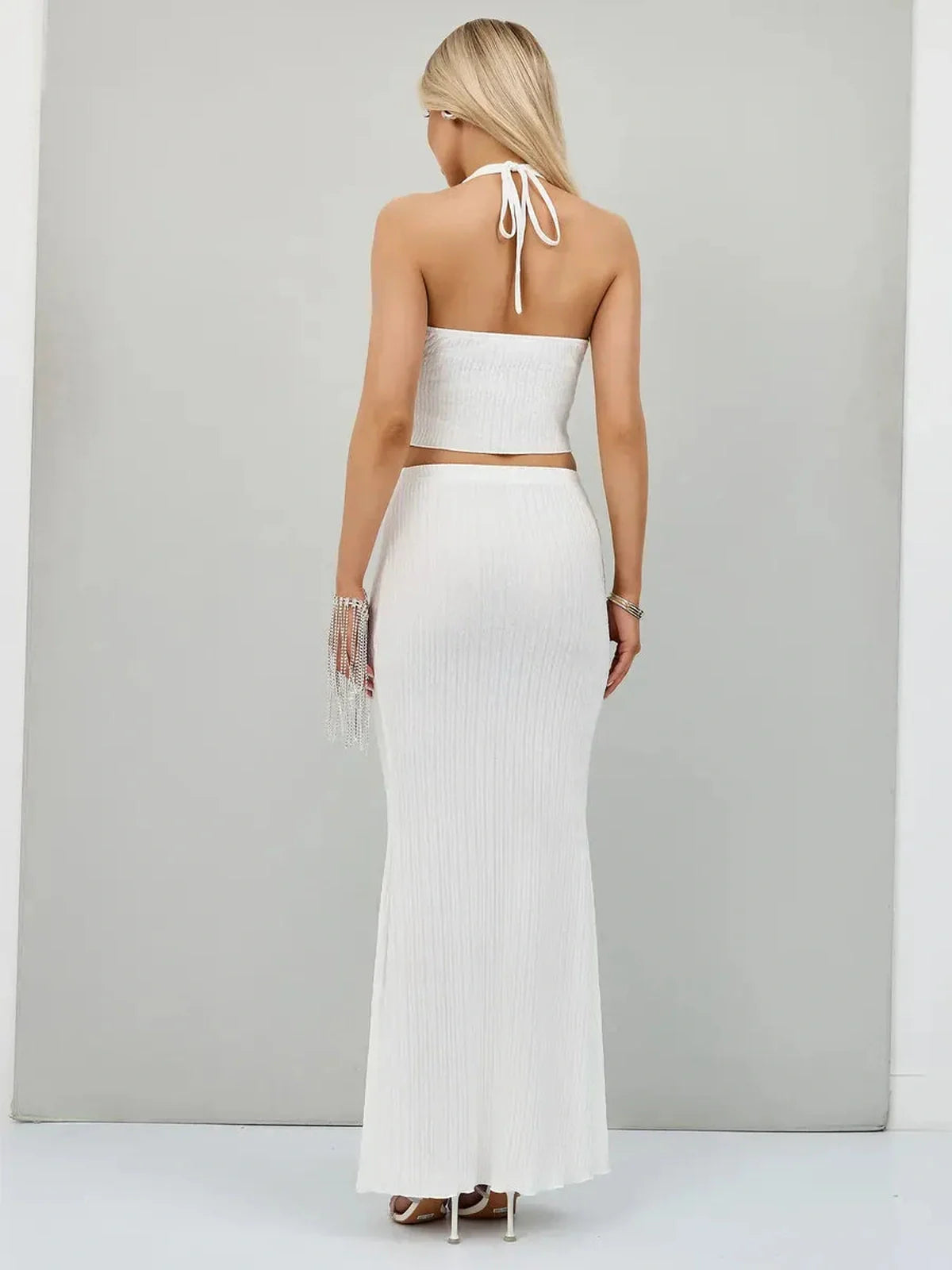 The Radiant Halter Set is a striking two-piece suit designed for women who want to exude modern elegance and timeless allure. Crafted in a luminous white fabric, this chic outfit combines a cutout halter crop top with a flowing high-waisted maxi skirt for a look that is equal parts refined and fashion-forward. Perfect for warm-weather occasions, this women’s suit set balances sophistication with a hint of boldness.