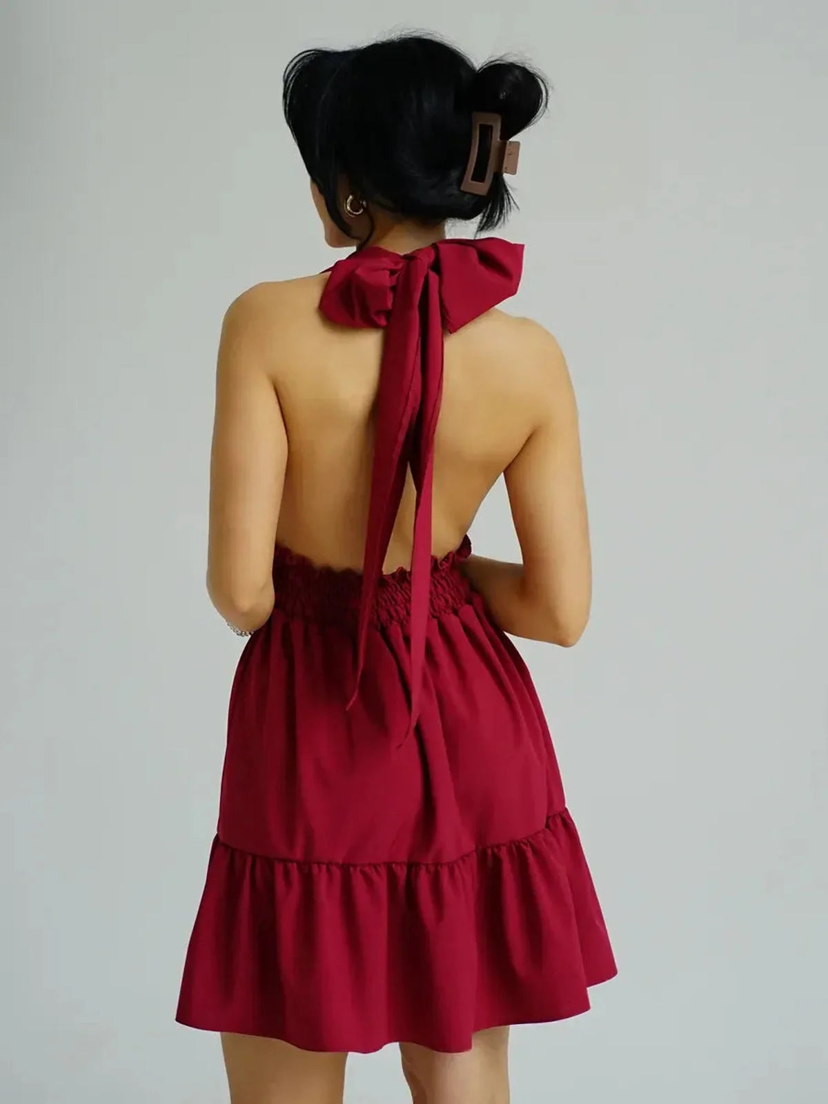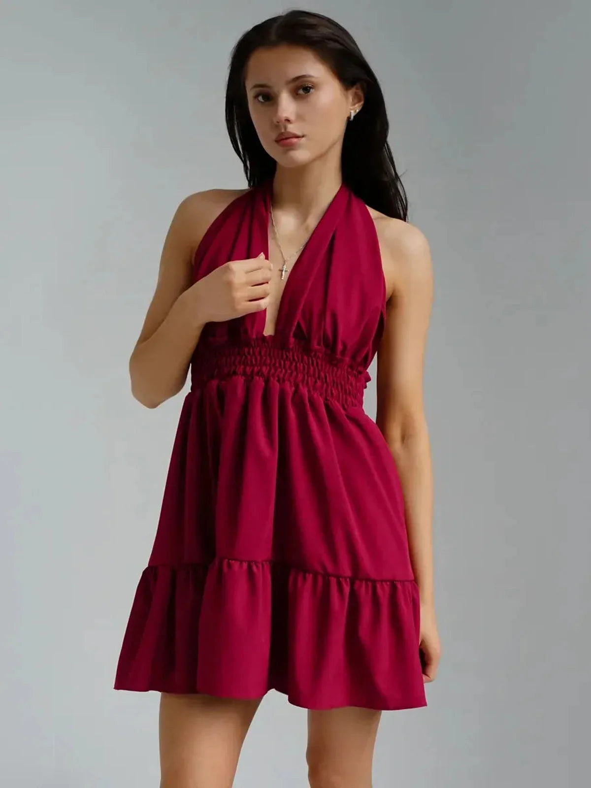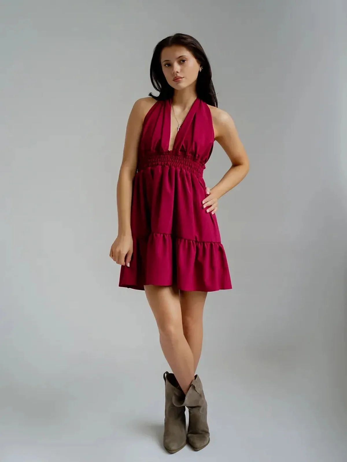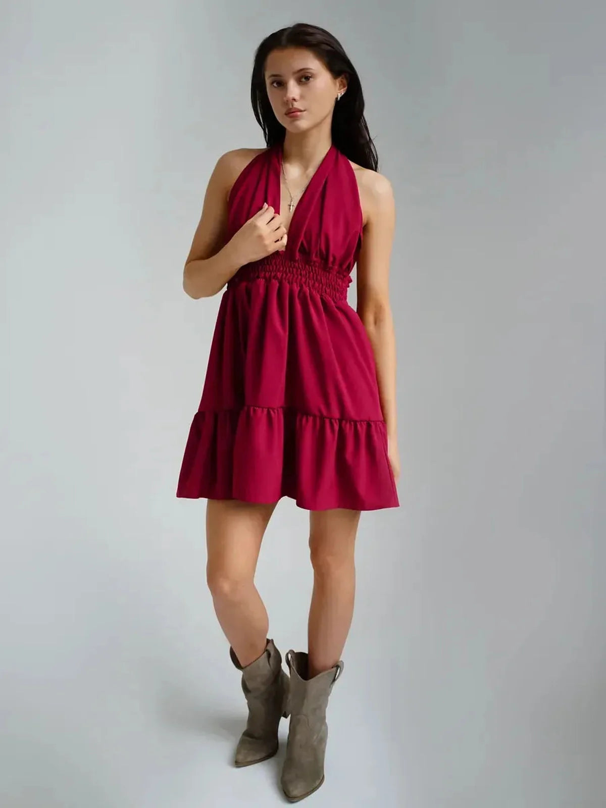 The Rosé Bloom Mini Dress features a plunging V-neck halter bodice with adjustable tie-back straps that let you customize your fit with ease. A smocked waistband cinches the waist while maintaining flexibility and comfort, flowing into a tiered, gathered skirt that moves beautifully with every step. Designed with no zippers or hardware, this slip-on style embodies true effortless dressing — easy, elegant, and endlessly wearable.