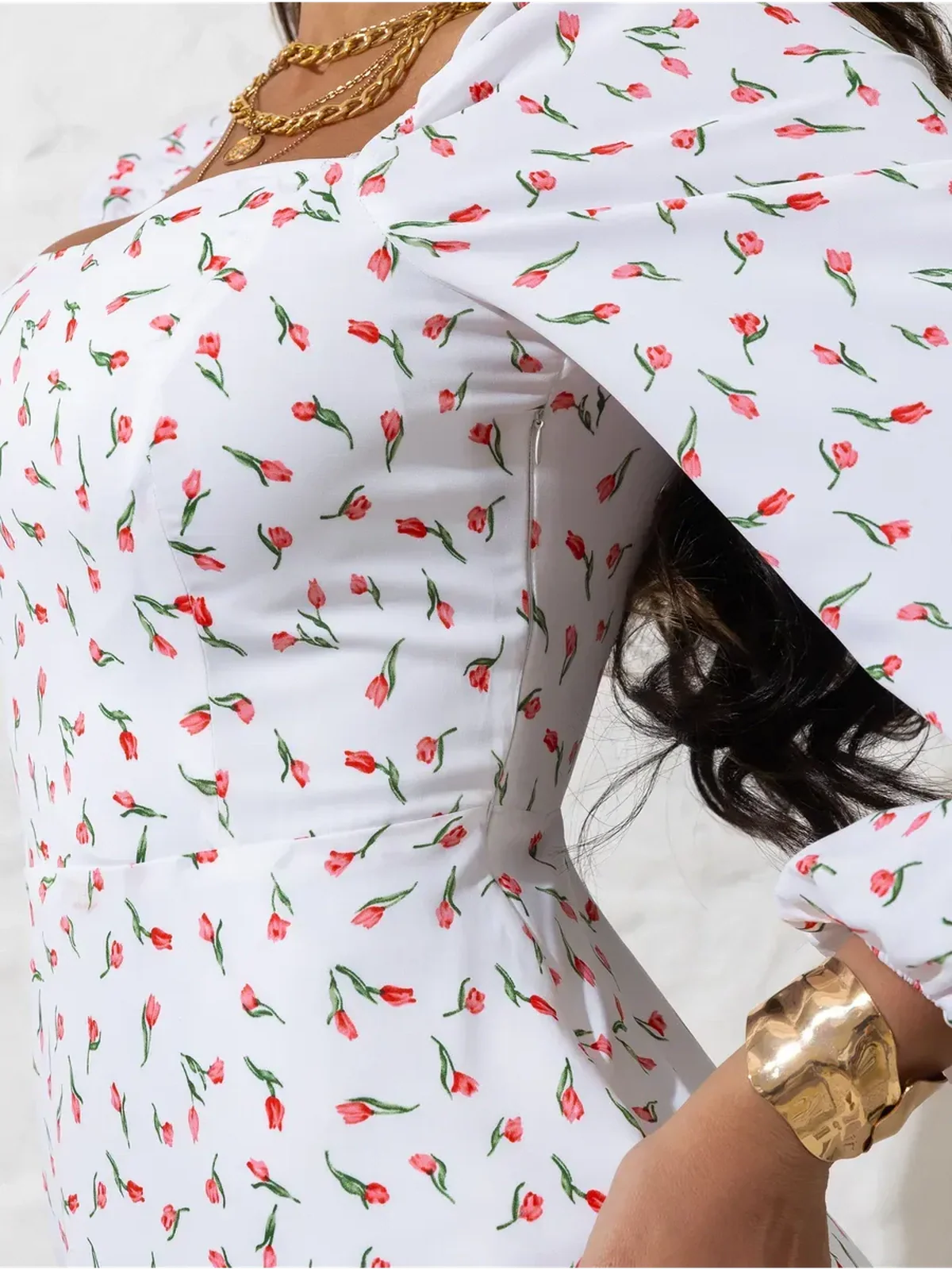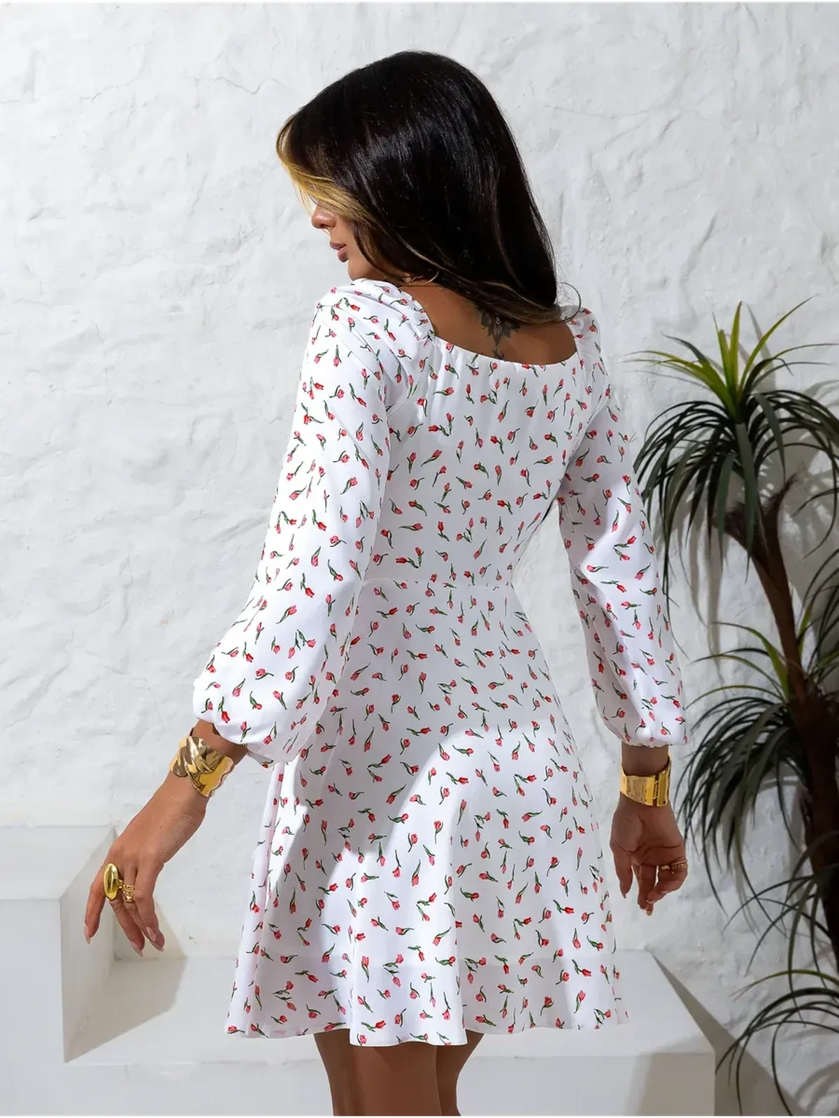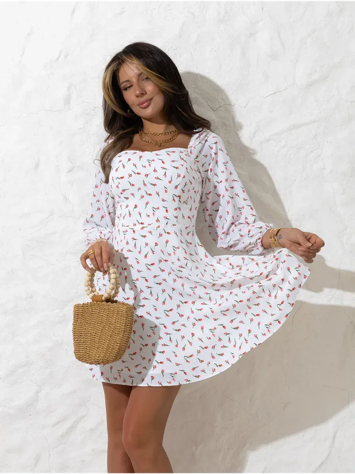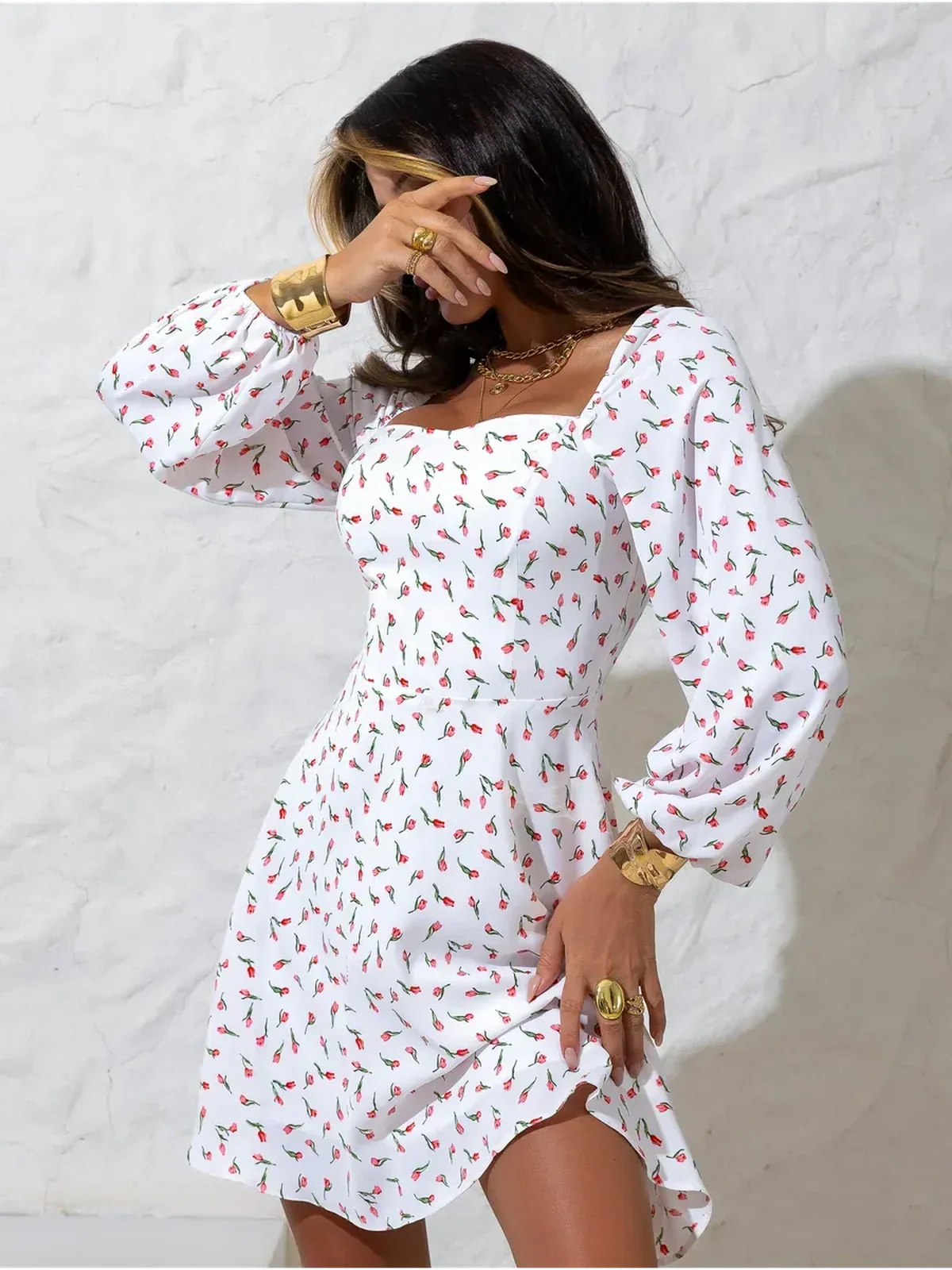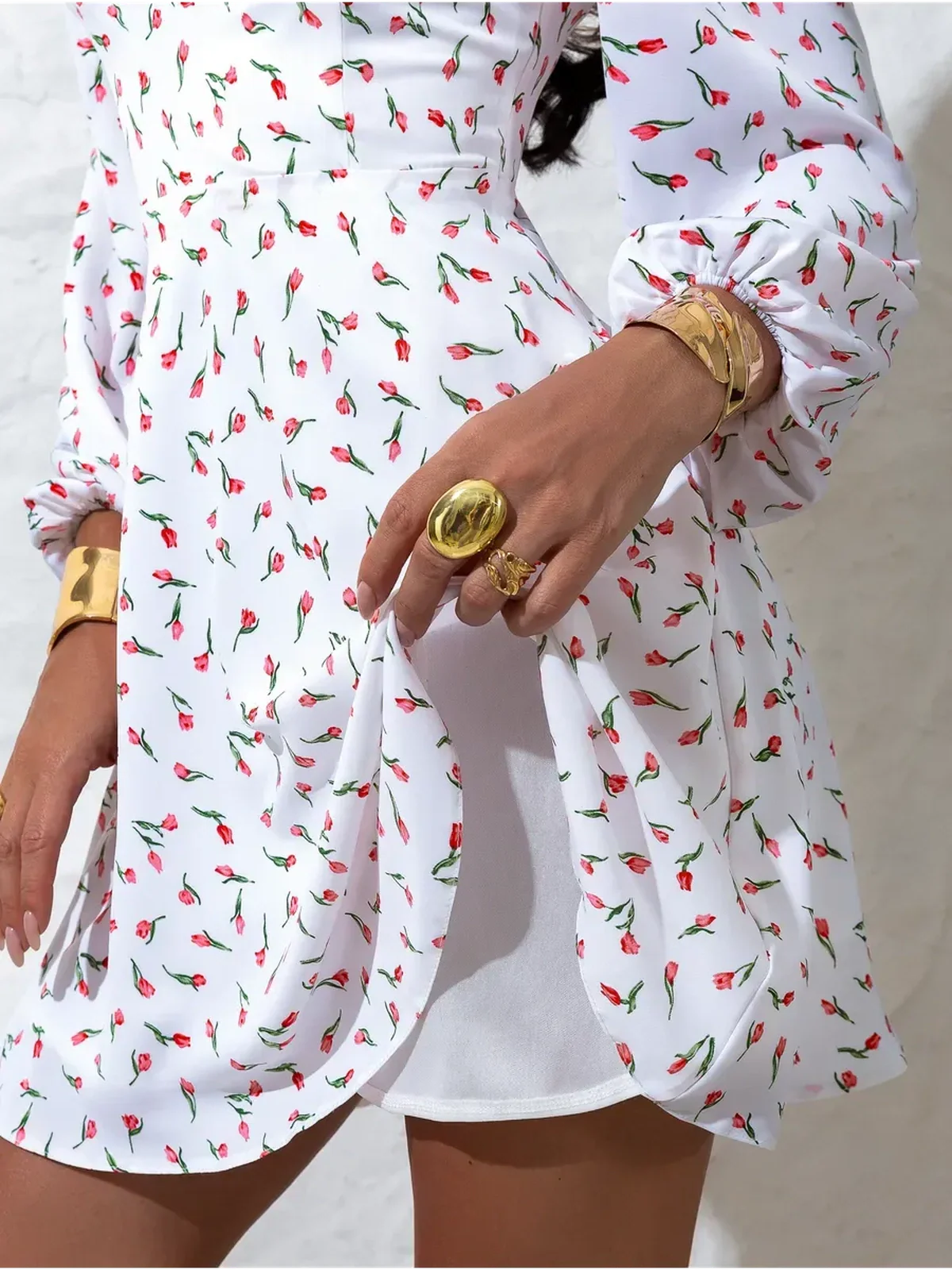 A graceful white mini dress with a rosebud print that embodies modern romance and timeless femininity.