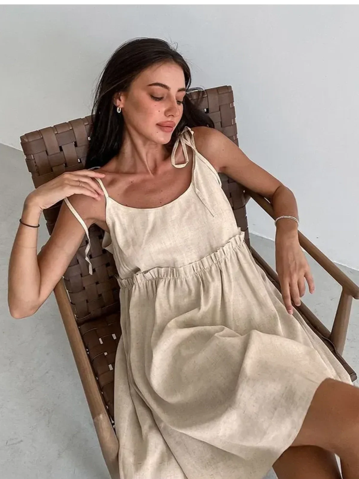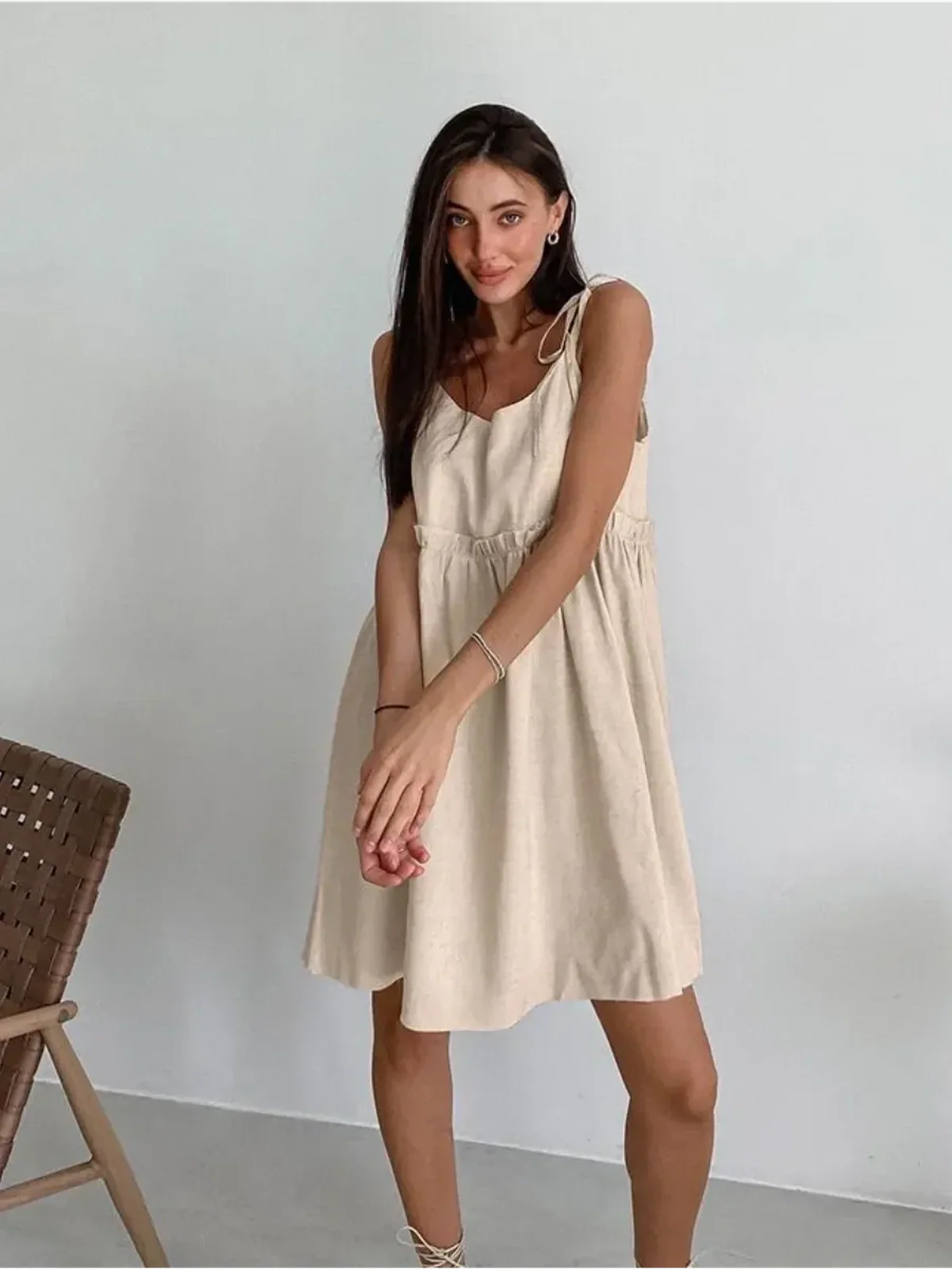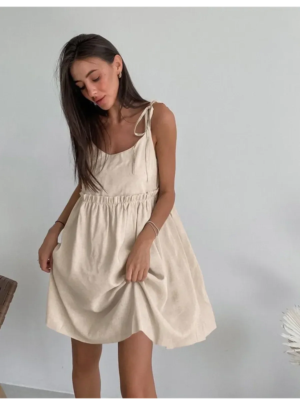 Designed with a flattering U-neckline, delicate tie straps, and a softly flowing silhouette, this light beige mini dress flatters every figure with understated grace. The minimalist cut ensures freedom of movement and an easy slip-on fit — no zippers, no fuss, just pure elegance. Its airy texture and neutral tone make it ideal for casual party dresses, wedding guest looks, or relaxed graduation dresses that transition seamlessly from day to night.