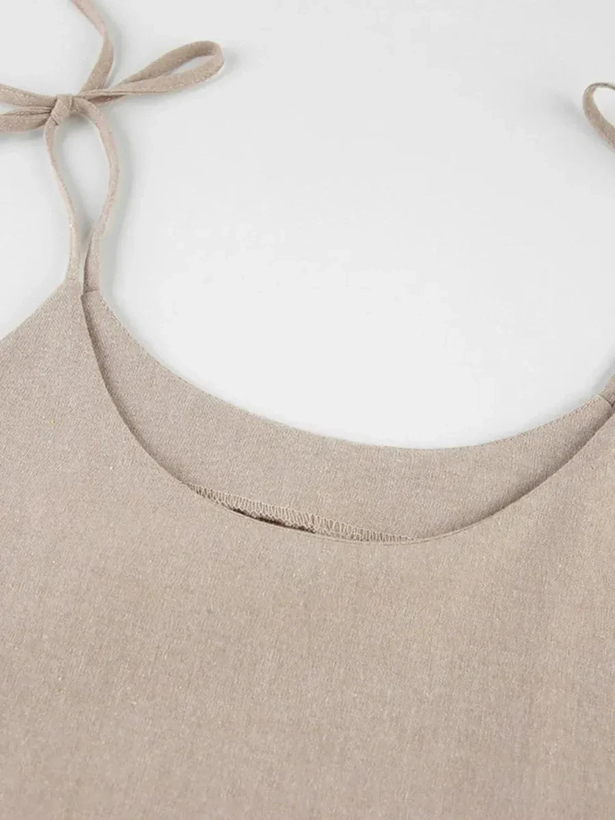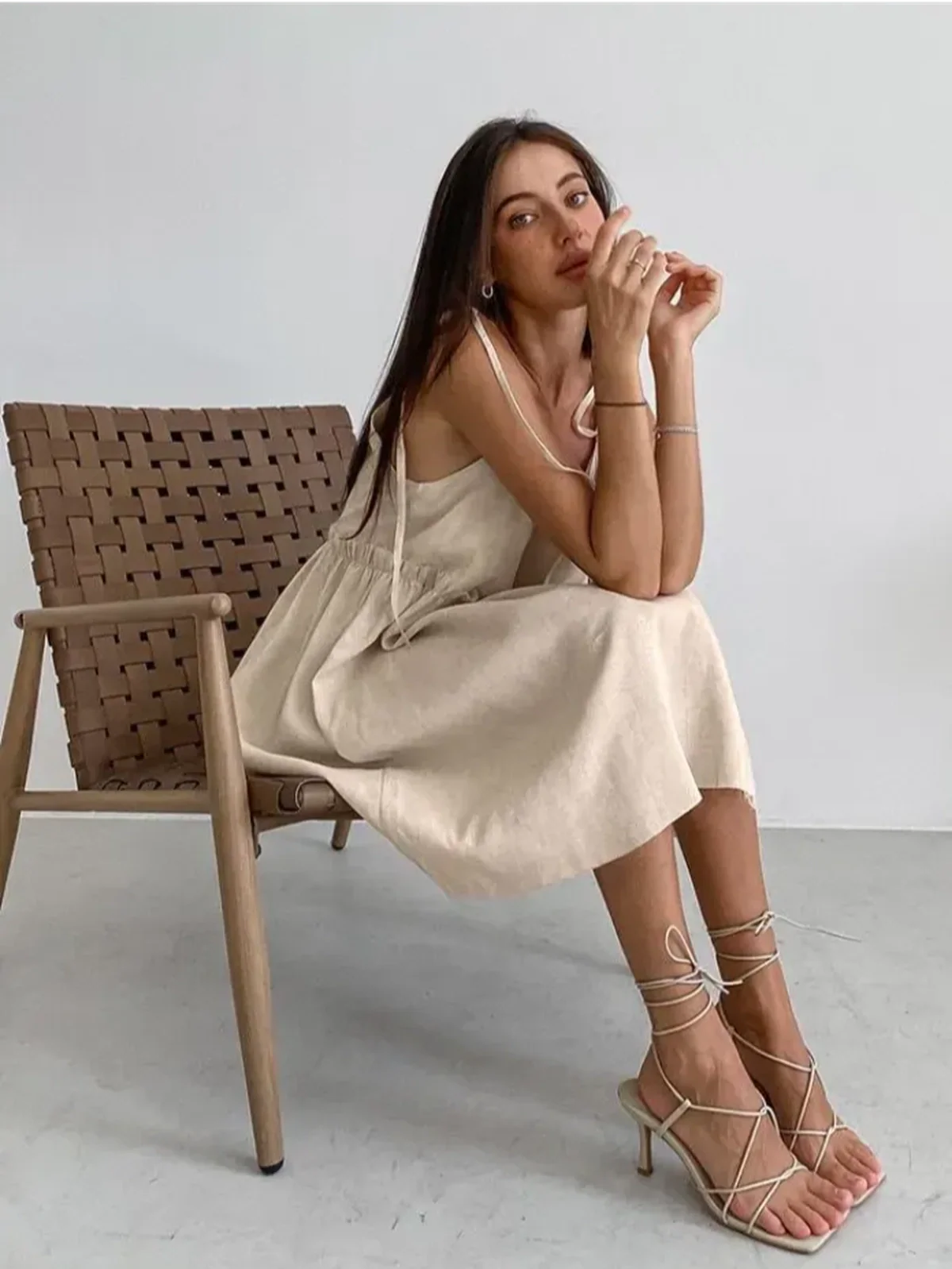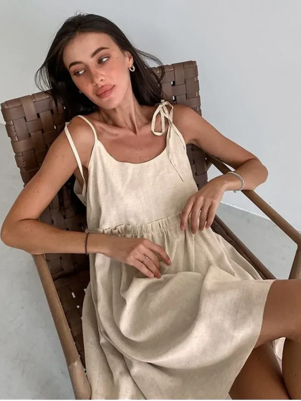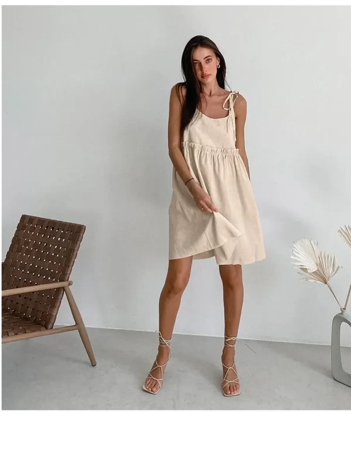 Designed with a flattering U-neckline, delicate tie straps, and a softly flowing silhouette, this light beige mini dress flatters every figure with understated grace. The minimalist cut ensures freedom of movement and an easy slip-on fit — no zippers, no fuss, just pure elegance. Its airy texture and neutral tone make it ideal for casual party dresses, wedding guest looks, or relaxed graduation dresses that transition seamlessly from day to night.