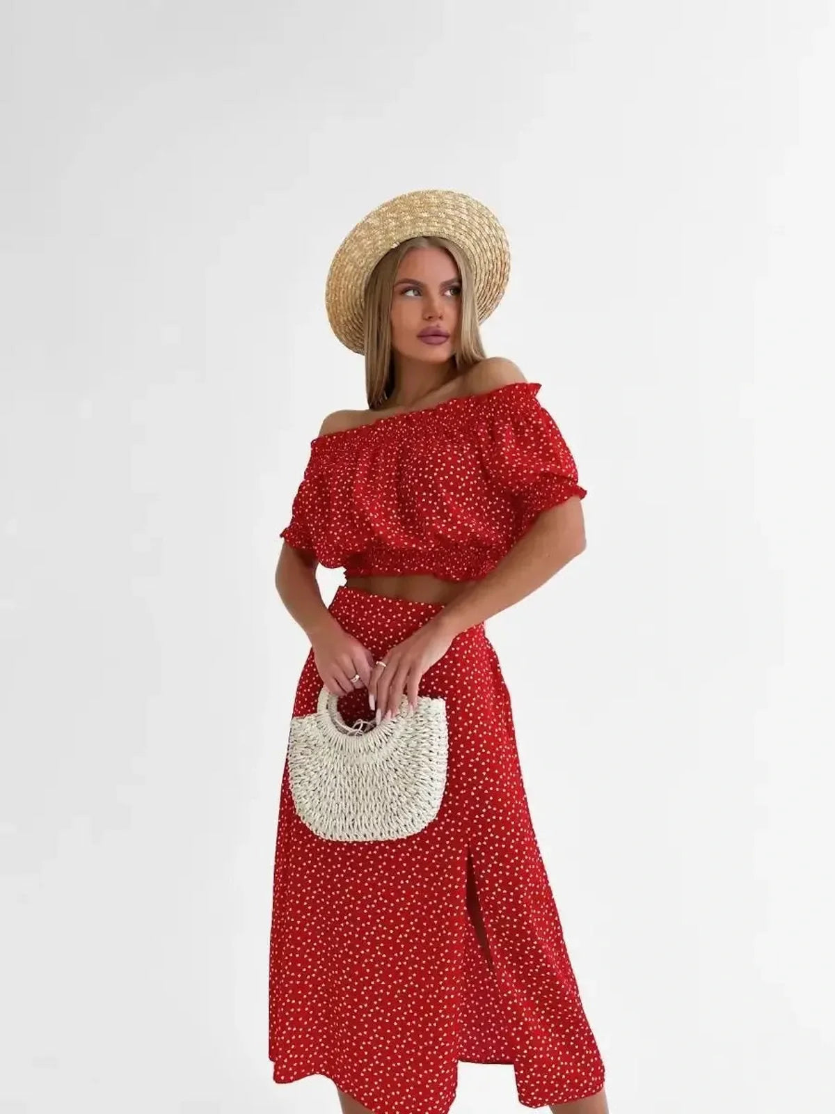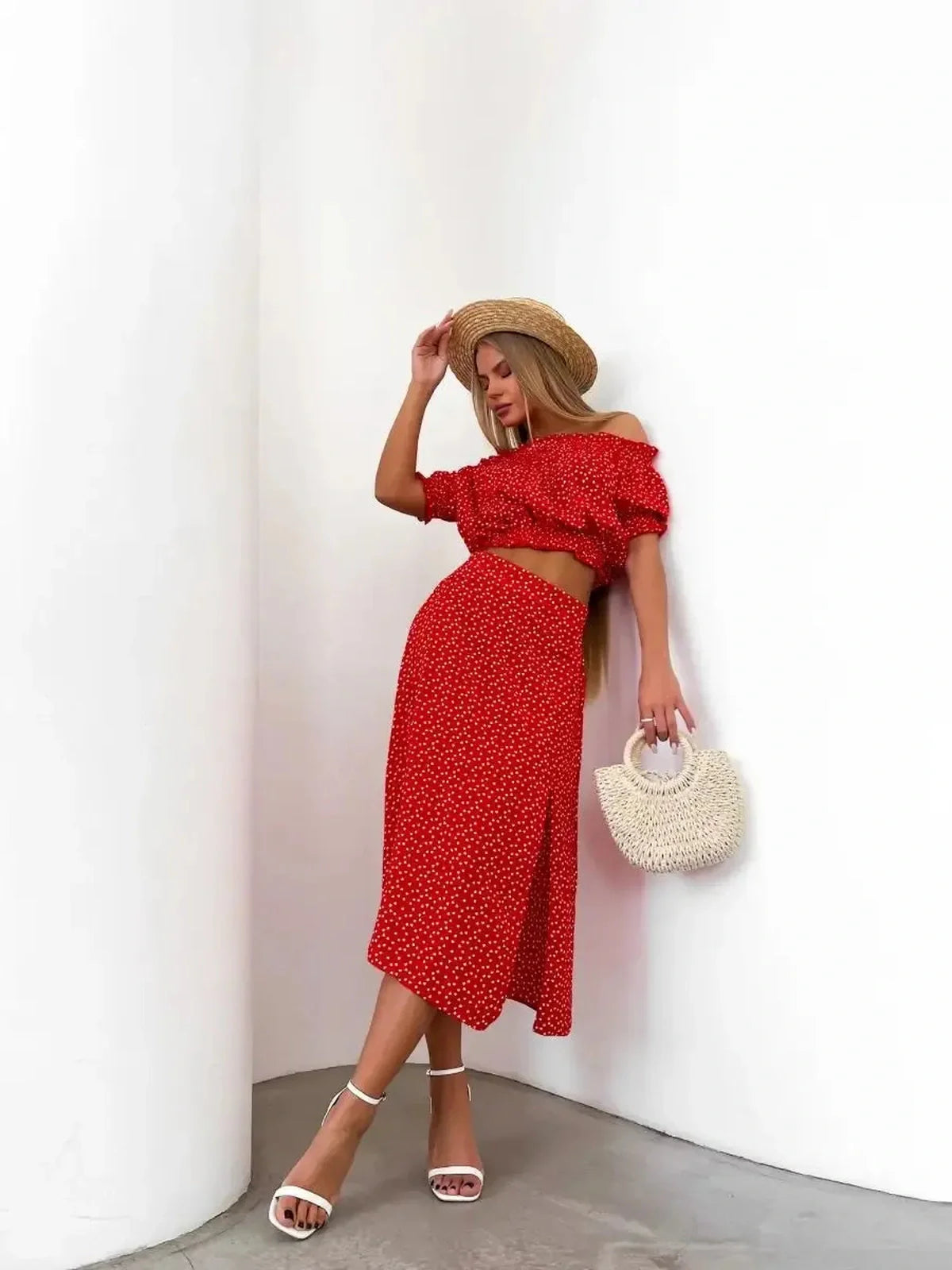 The Scarlet Breeze Set is a vibrant two-piece crafted to embody playful femininity and effortless summer style. Designed in a bold scarlet red with chic polka dots, it pairs a flirty off-shoulder ruffle crop top with a flowing high-waisted midi skirt featuring a subtle side slit. Lightweight, breathable, and wrinkle-resistant, this set ensures comfort without compromising elegance.