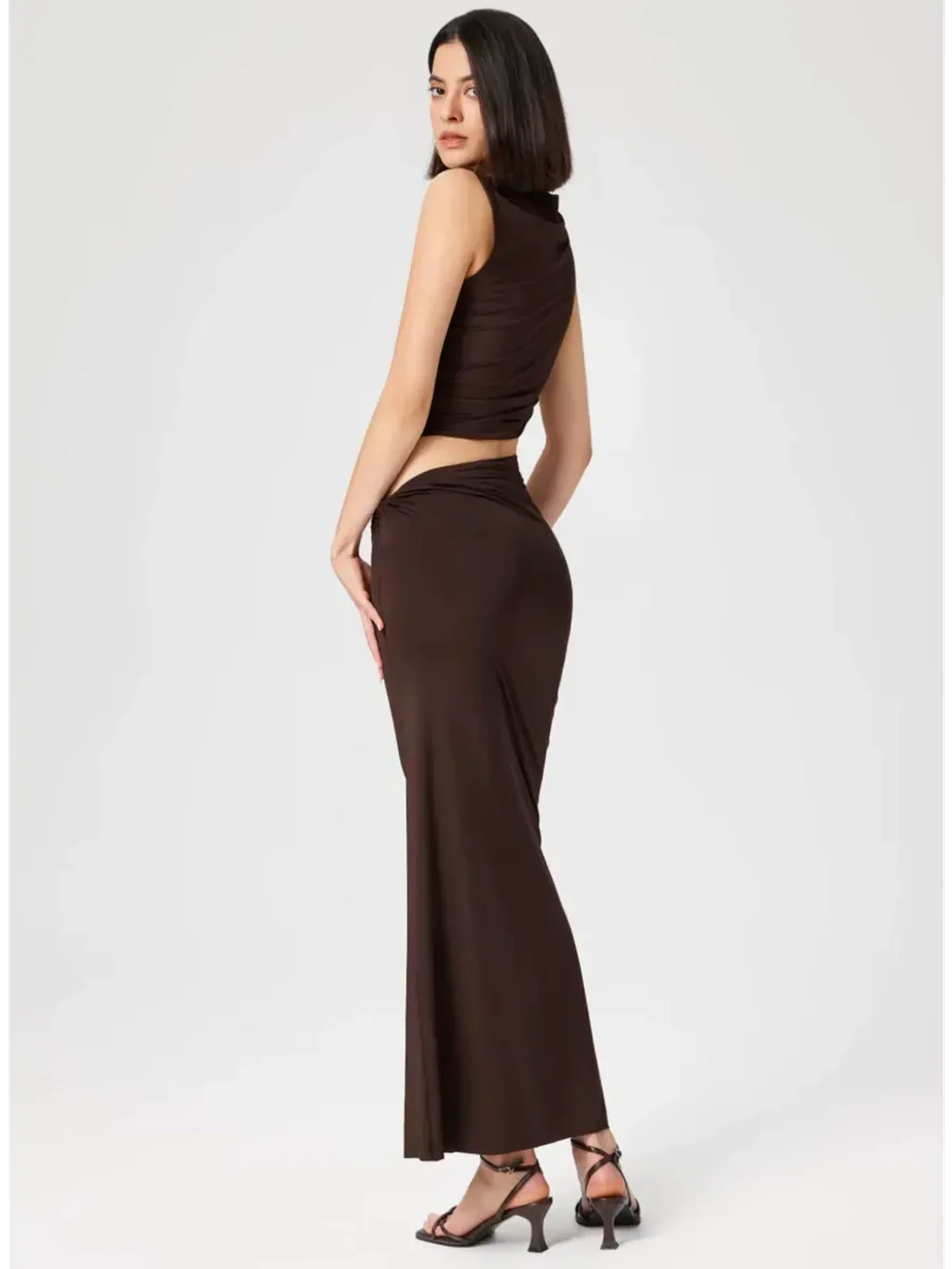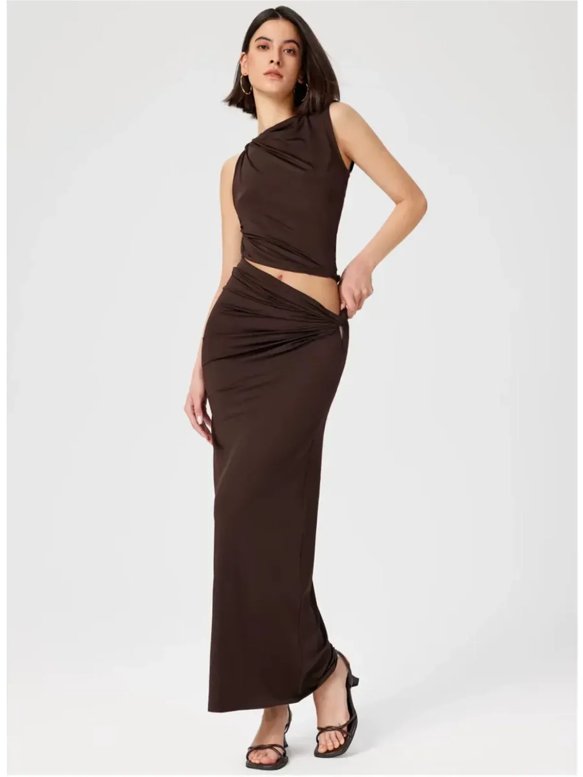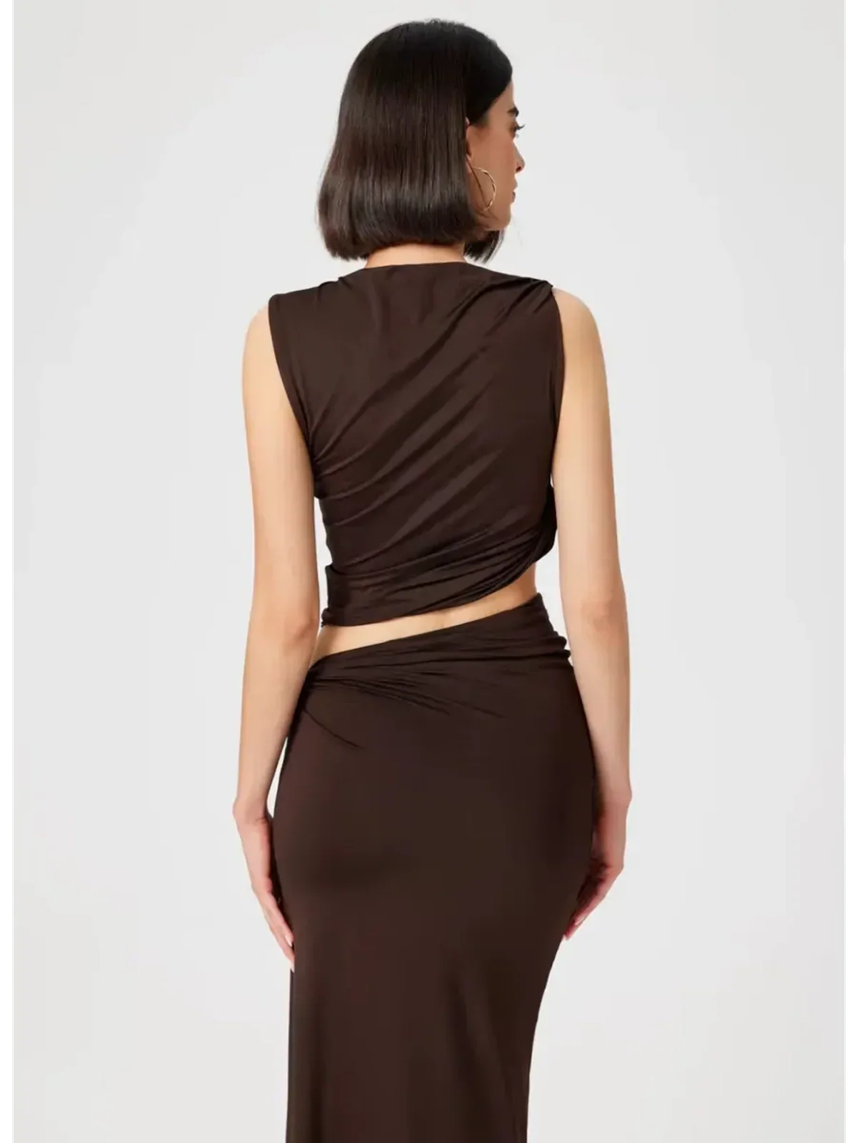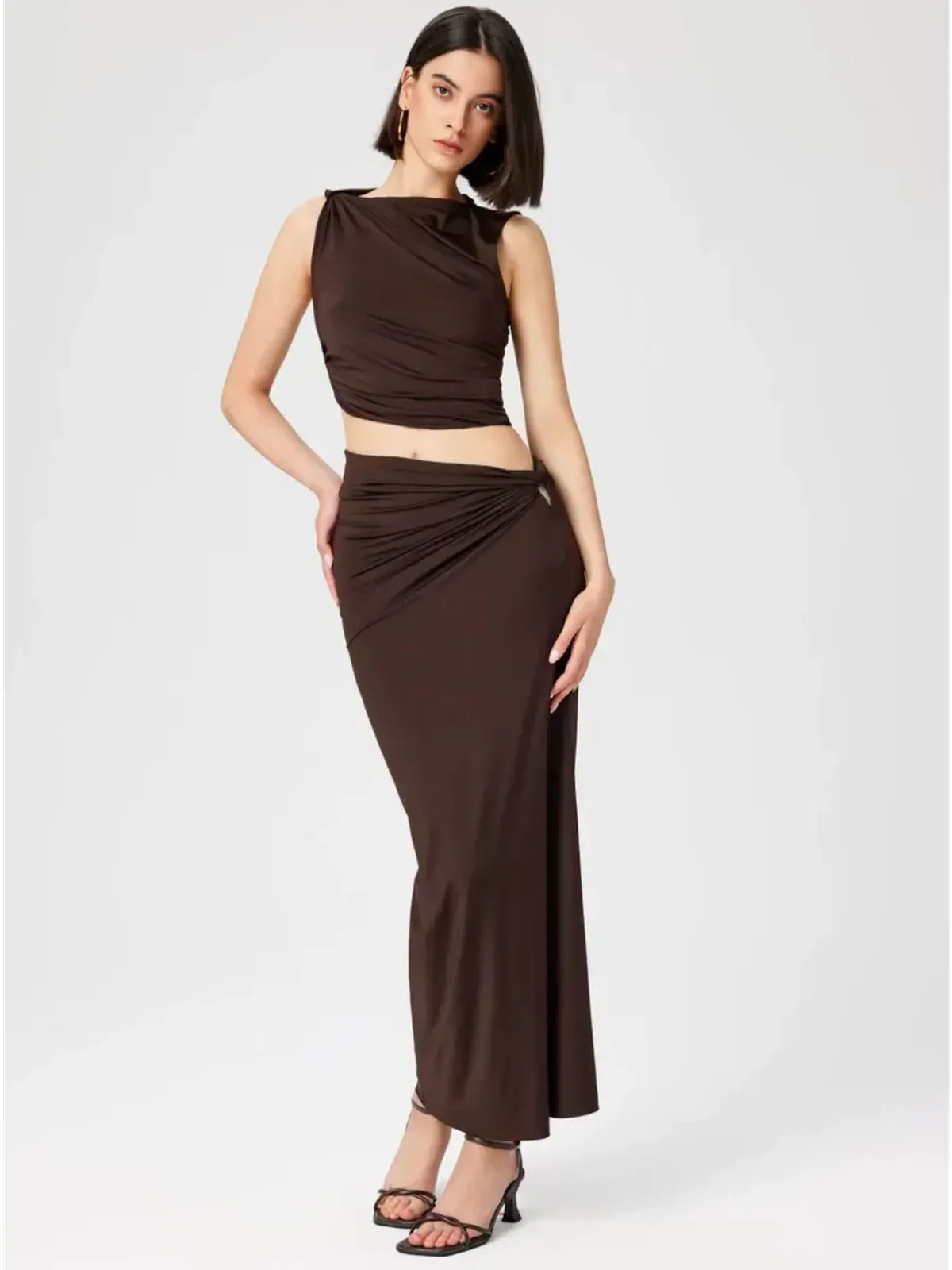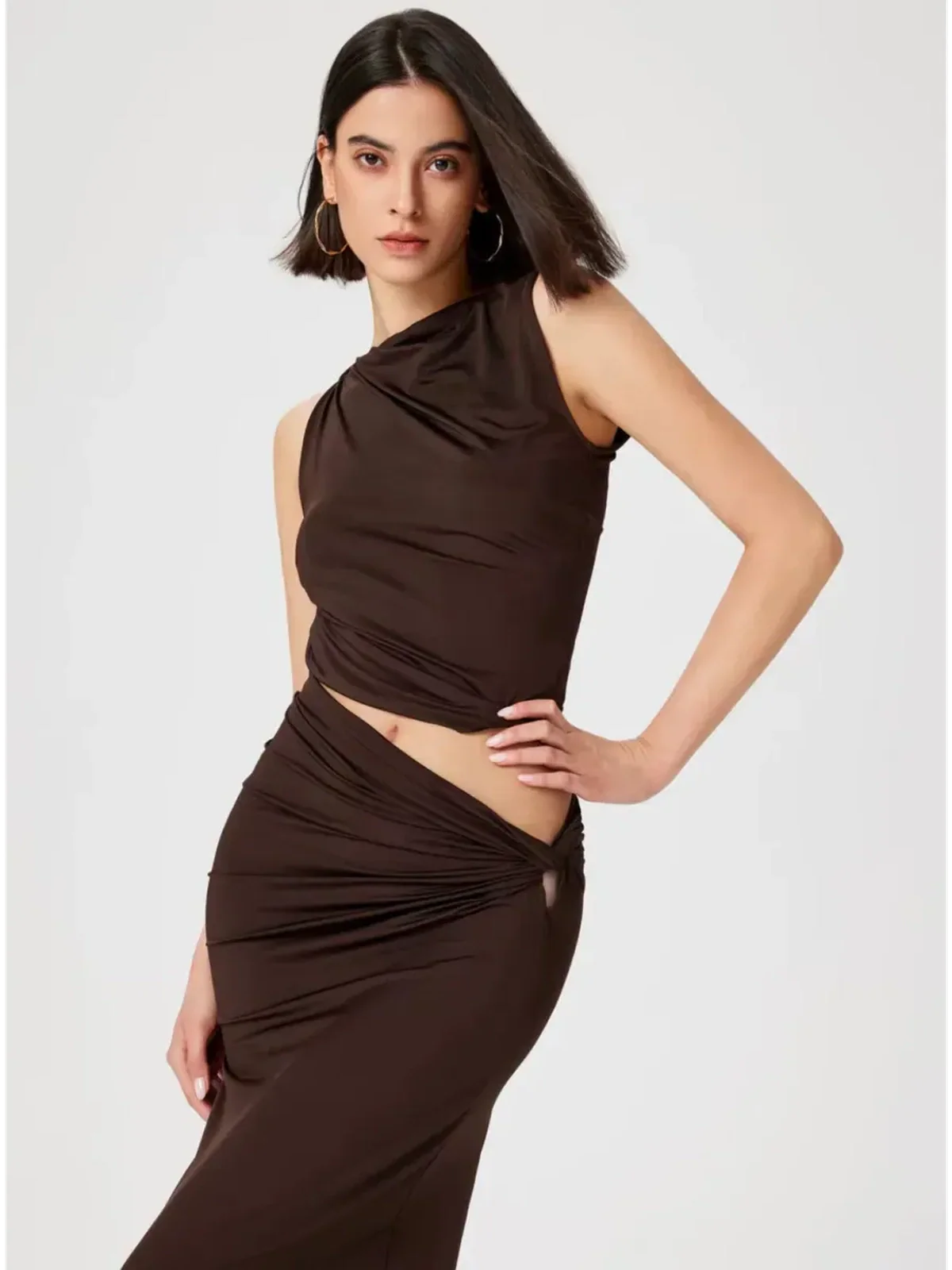 This women’s suit set is designed to transition effortlessly from day to night. The ruched draping and sculpted lines create a figure-enhancing shape, while the rich chocolate tone adds depth and sophistication to any wardrobe. Whether styled together or worn separately, the set offers versatility for both casual chic and formal occasions.