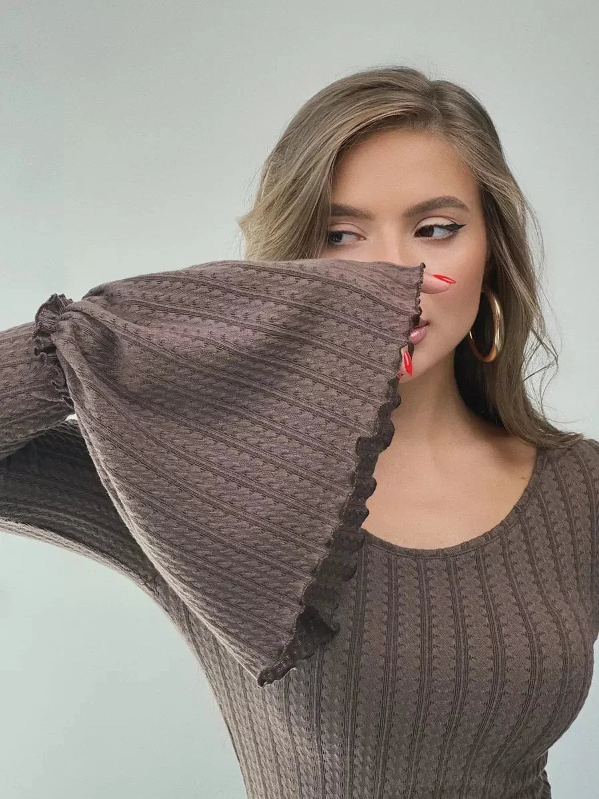 The Sculpted Grace Maxi Dress merges architectural precision with feminine artistry, creating a silhouette that’s equal parts power and poise. Crafted in a deep chocolate brown ribbed knit, this statement piece sculpts the body with graceful definition before flaring into a dramatic fishtail hem. Every detail — from the soft vertical texture to the voluminous bell sleeves — is designed to enhance movement and exude quiet confidence.