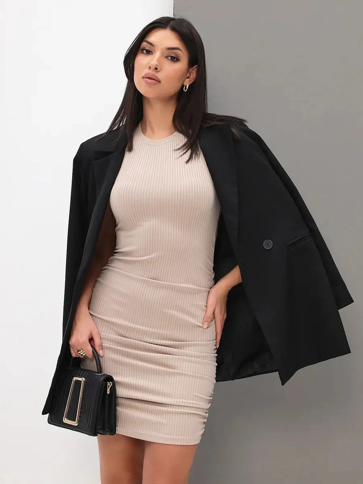 Meet the Sandora Mini Dress — the ultimate blend of understated elegance and modern confidence. Crafted from a soft ribbed knit blend of viscose, polyester, and lycra, this women’s beige mini dress hugs the body in all the right places while offering breathable comfort and subtle shaping support.