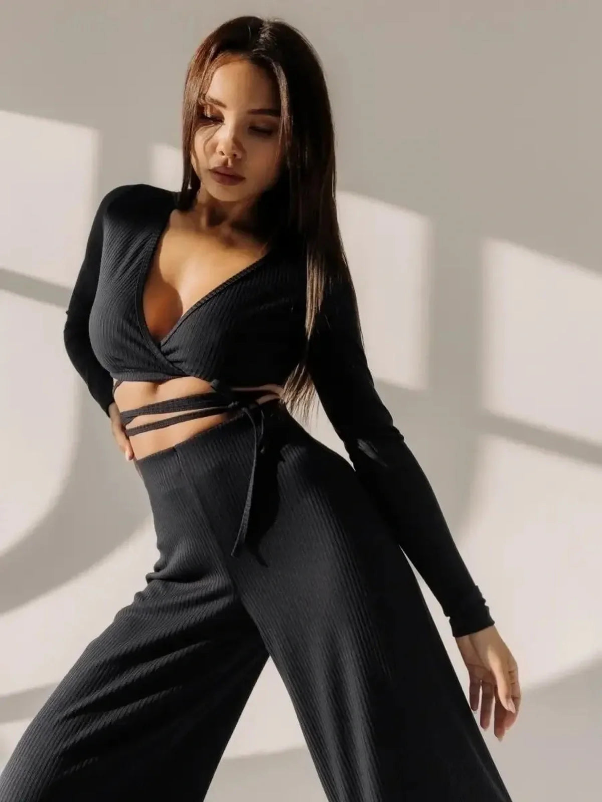 The Sculpted Wrap Set is designed for women who embrace modern minimalism with a touch of sophistication. Crafted from soft ribbed cotton with a hint of stretch, this two-piece ensemble features a wrap-style long-sleeve crop top with delicate side ties and high-rise flared pants that elongate the silhouette. Both flattering and versatile, it’s a set that moves effortlessly from lounging to city chic styling.