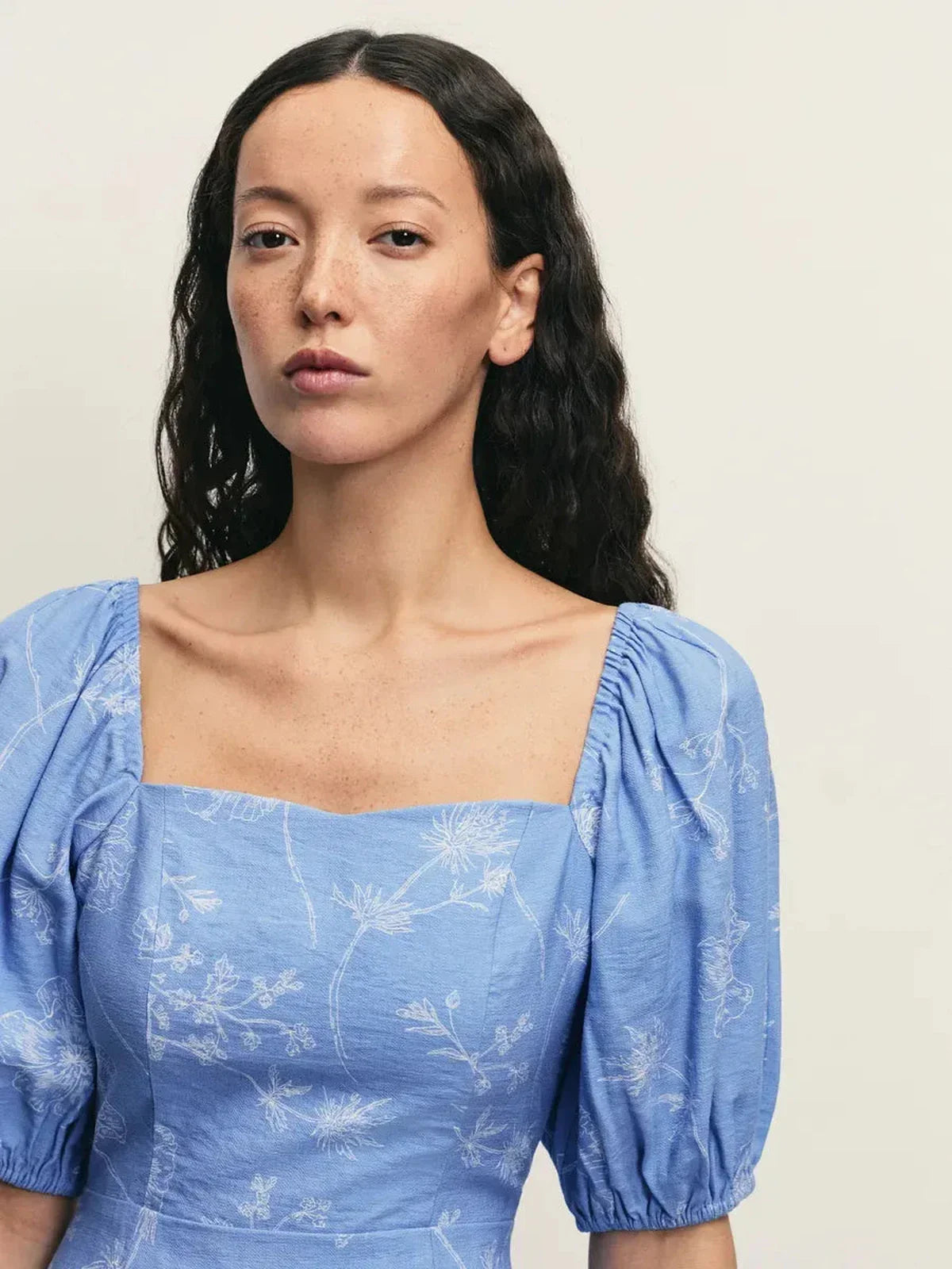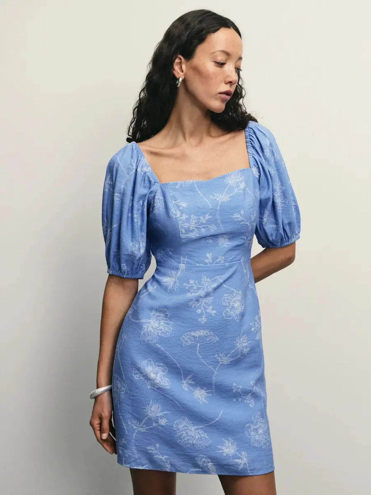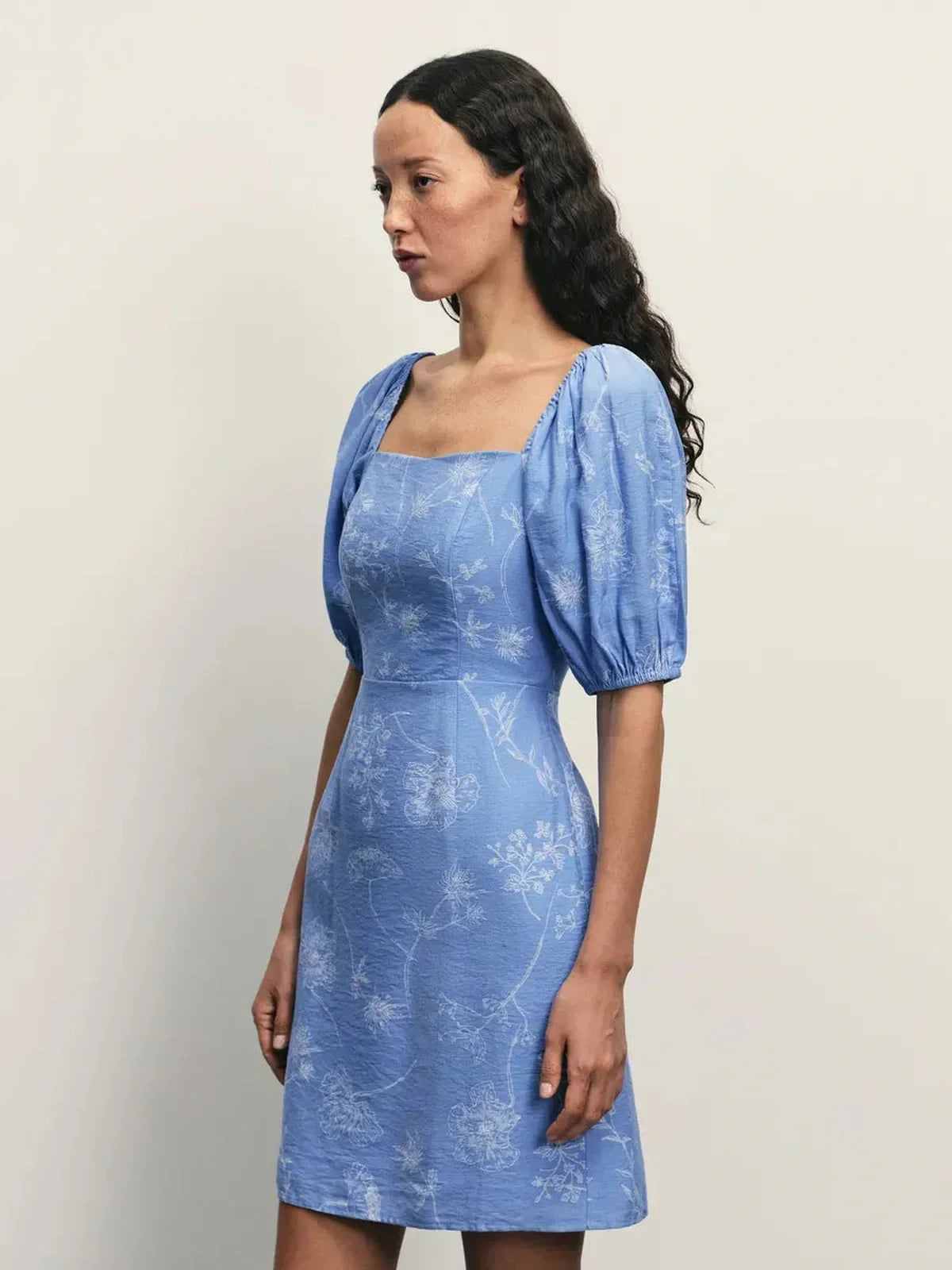 Its square neckline and gently puffed short sleeves frame the shoulders with feminine charm, while the fitted bodice and A-line mini skirt create a graceful silhouette. Finished with an invisible back zipper, the design ensures a seamless look. The delicate light-blue floral print enhances its romantic appeal, making it a versatile piece for any event.