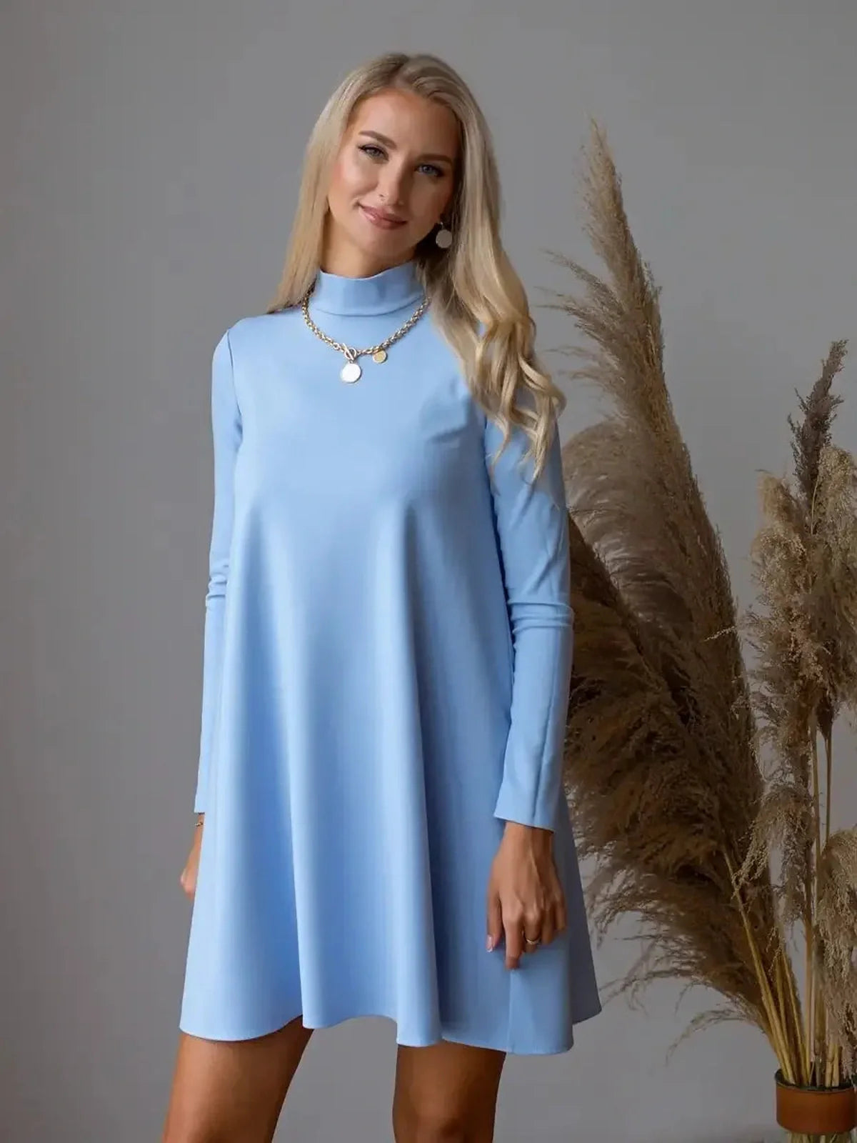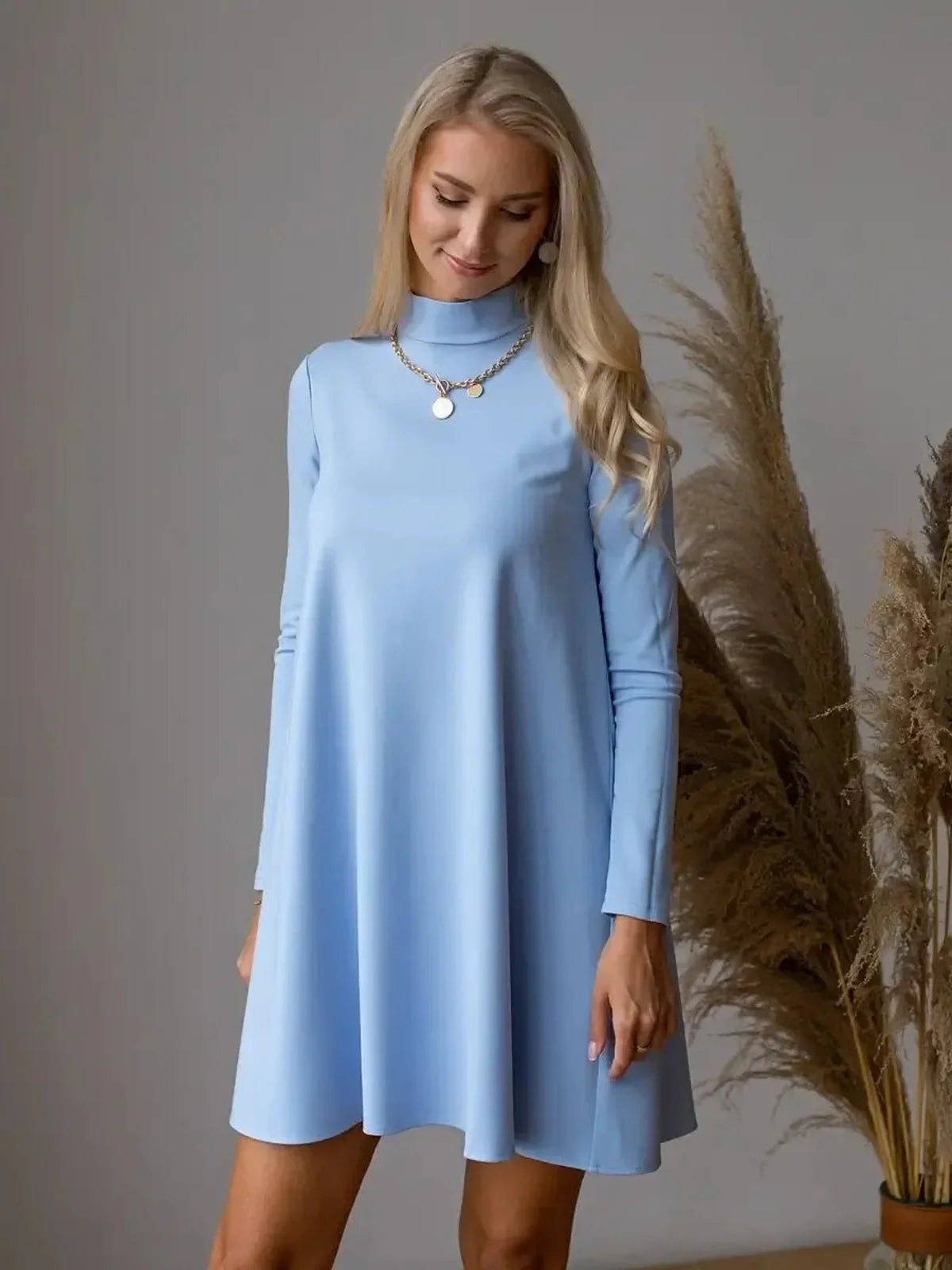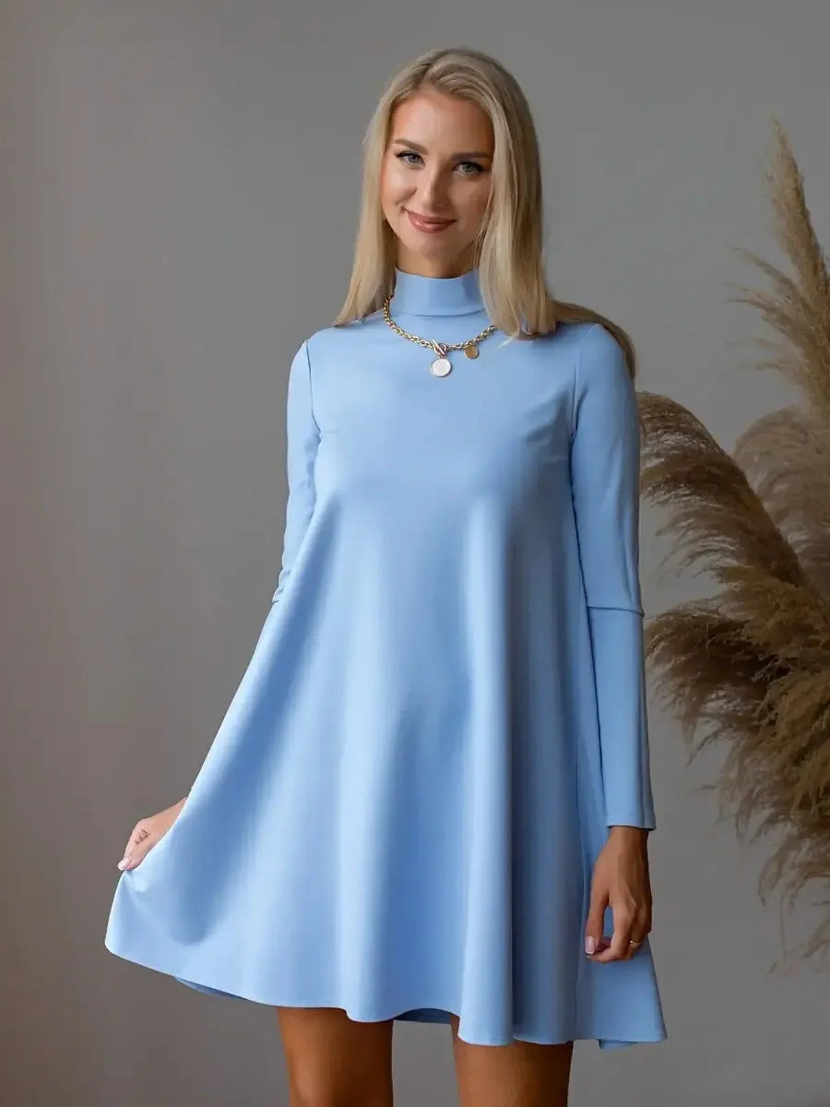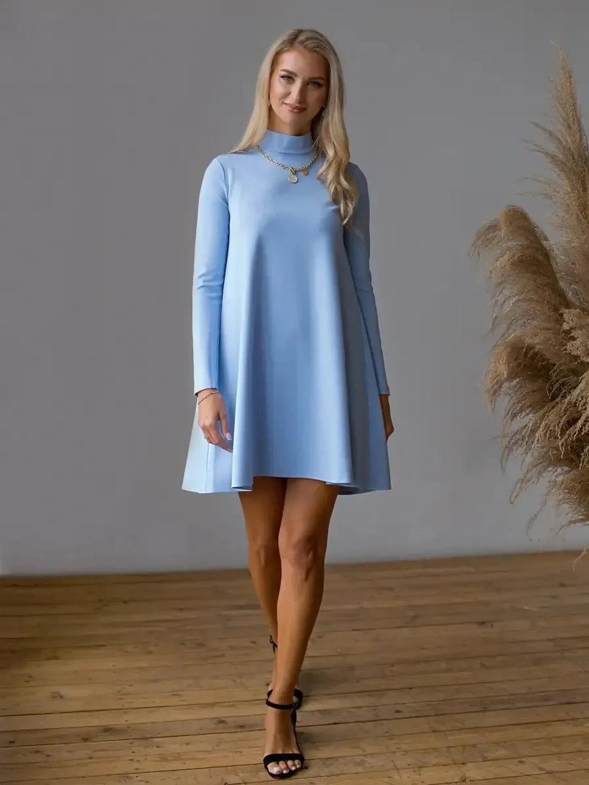 The high mock neckline adds a sleek, contemporary edge, while the A-line silhouette creates a balanced, figure-flattering shape that moves beautifully without clinging. A hidden back zipper maintains a seamless finish, and the fully lined interior ensures all-day comfort — smooth on the skin, never scratchy. With no pockets or extra detailing, this minimalist design keeps the focus on impeccable tailoring and elegant flow.