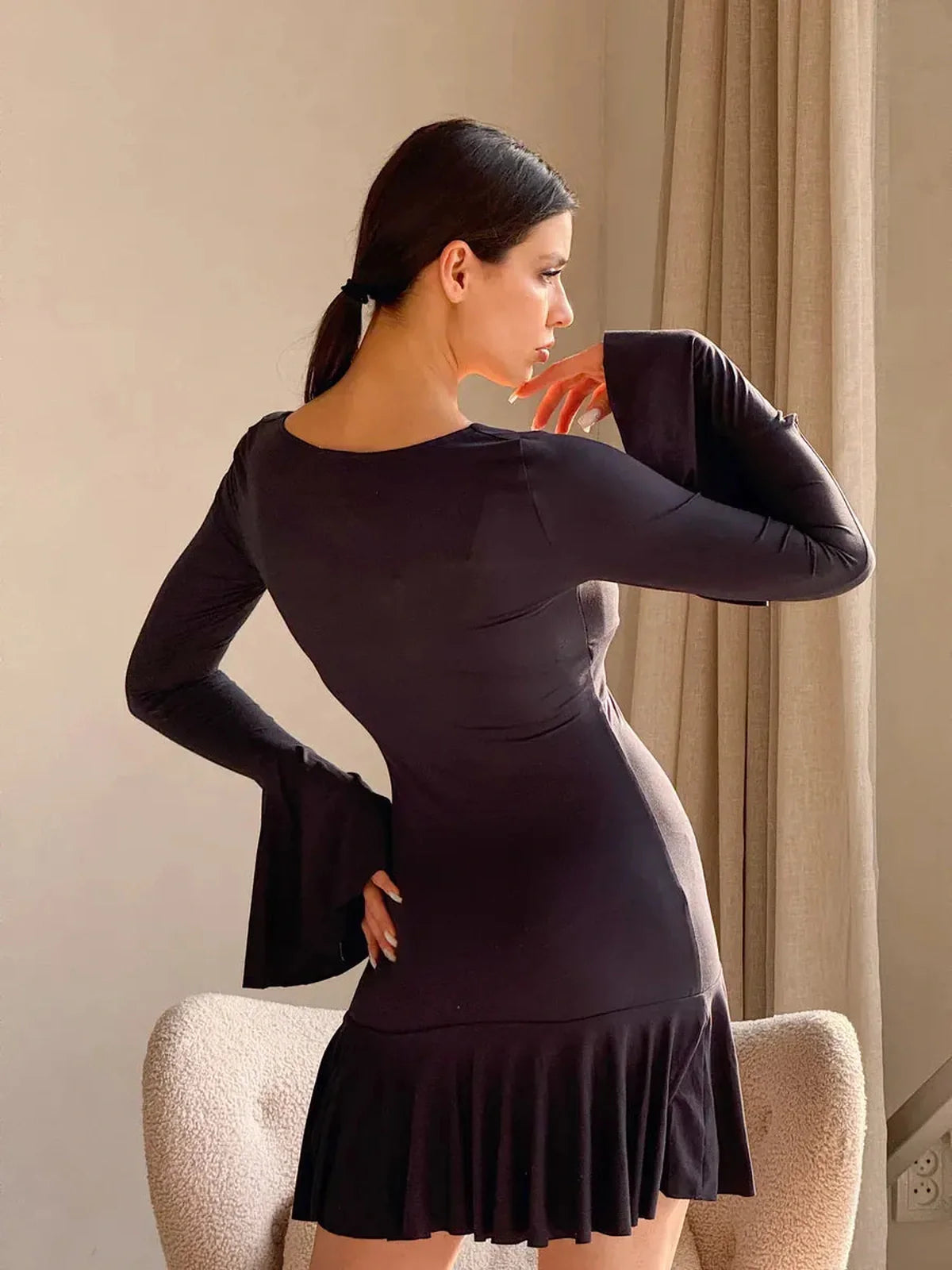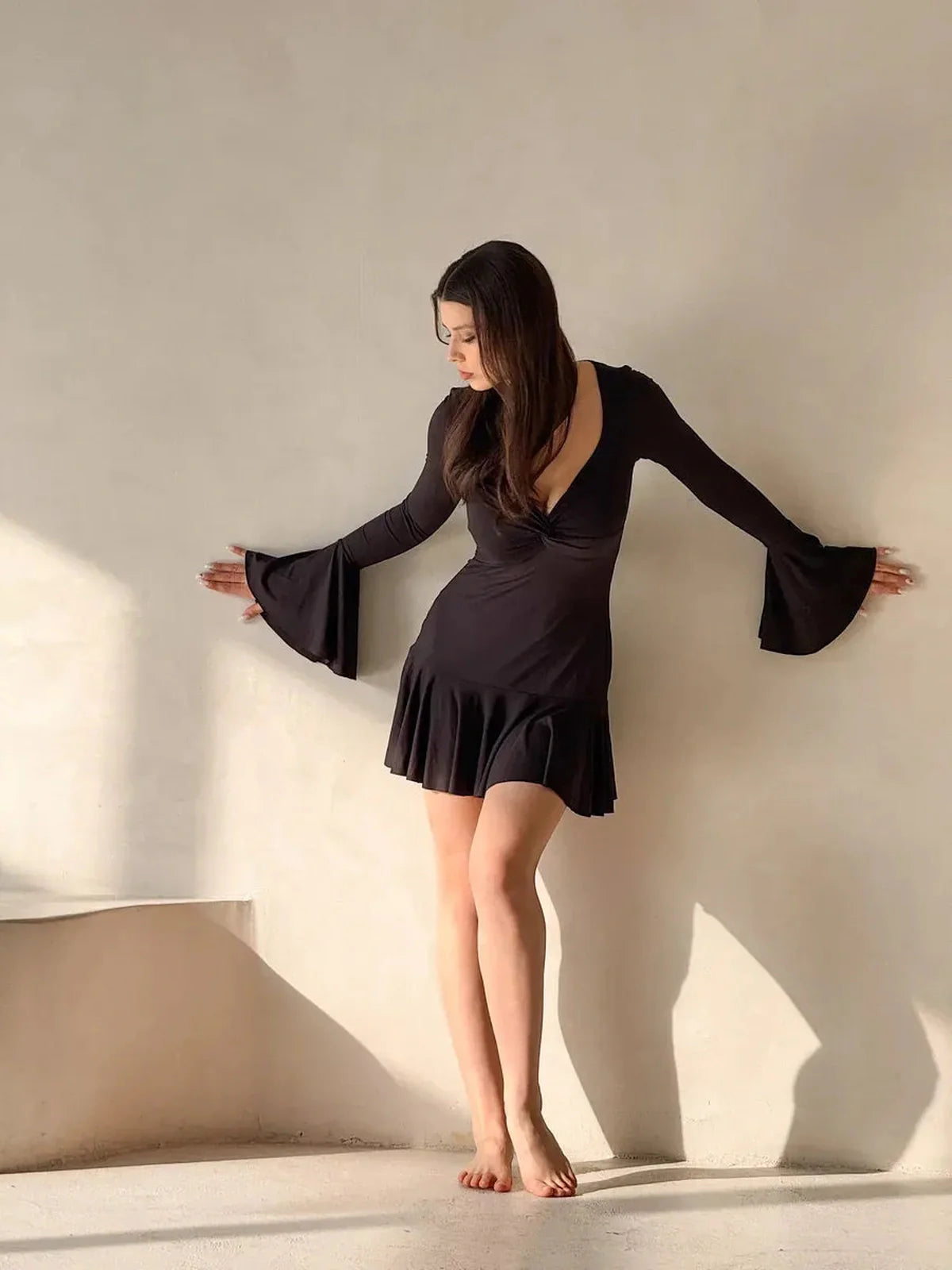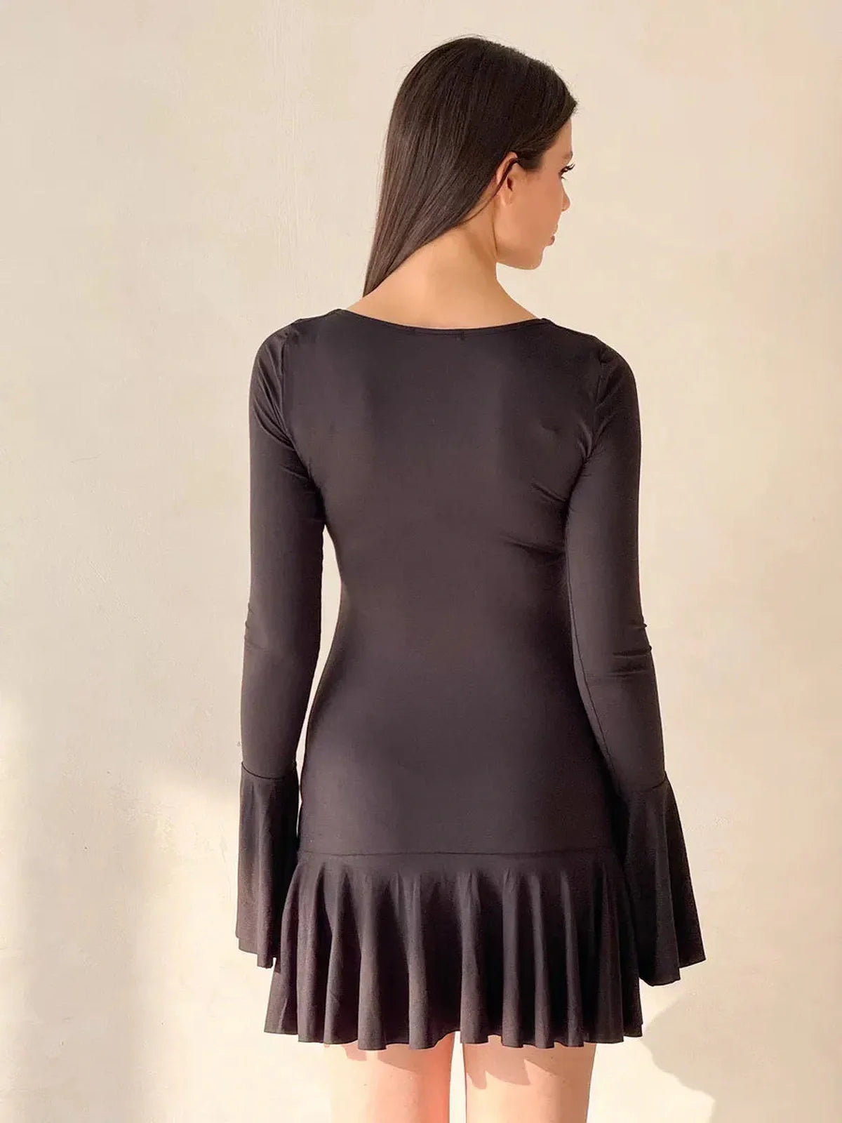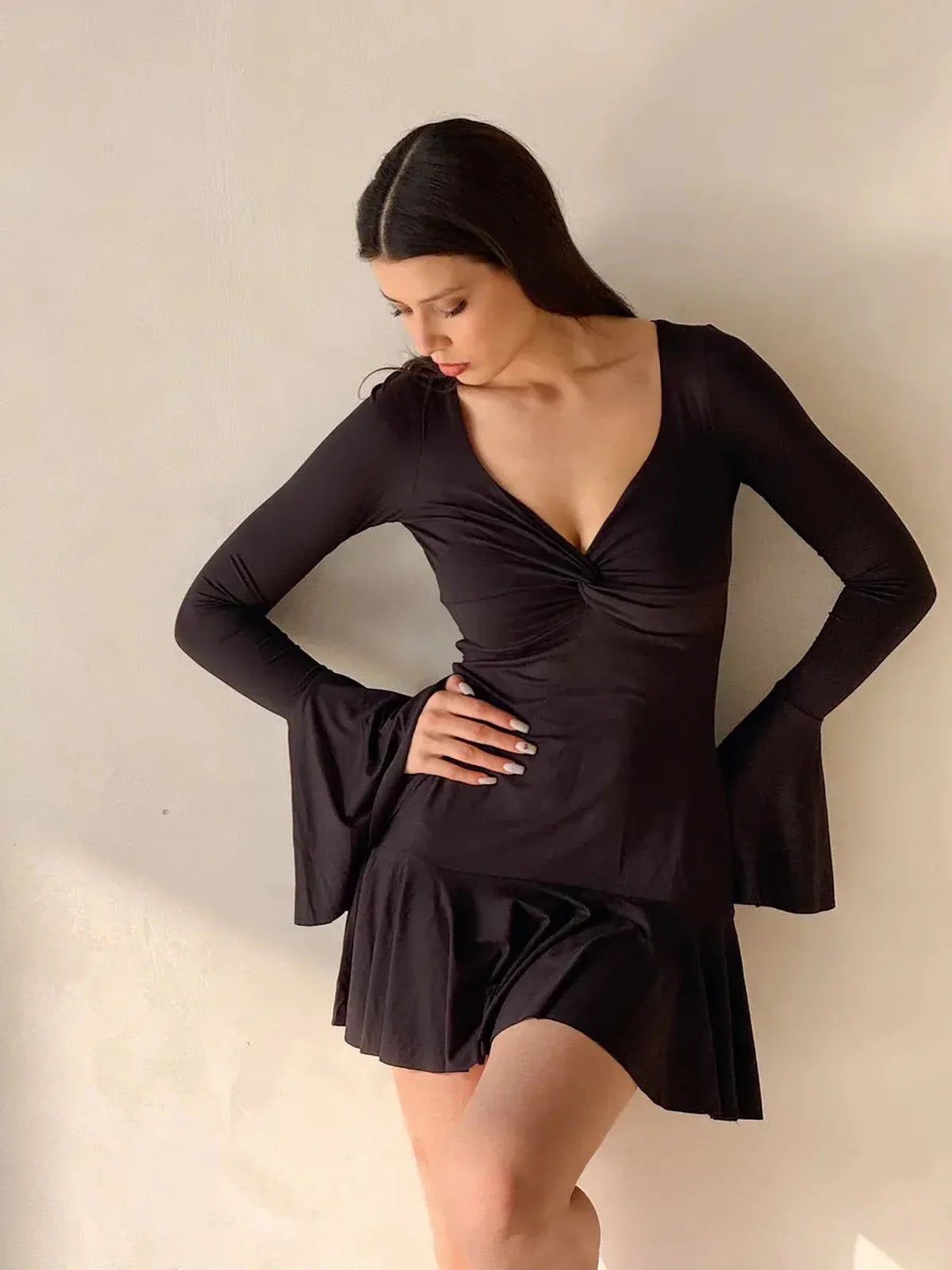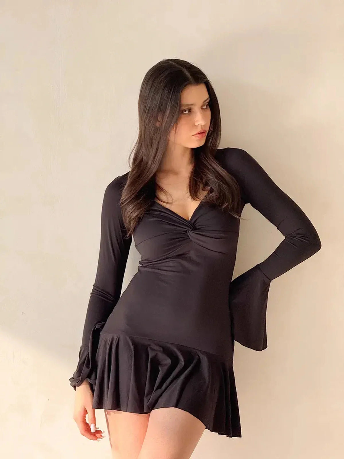 Command the room with effortless sophistication in the Novara Mini Dress, a black mini masterpiece that blends timeless allure with contemporary edge. Designed to accentuate and empower, this women’s long sleeve dress features a deep V-neckline with a twist-front detail that flatters the bust and defines the waist. Crafted from a smooth, stretch-infused fabric, it moves with your body while maintaining its sleek, sculpting form.