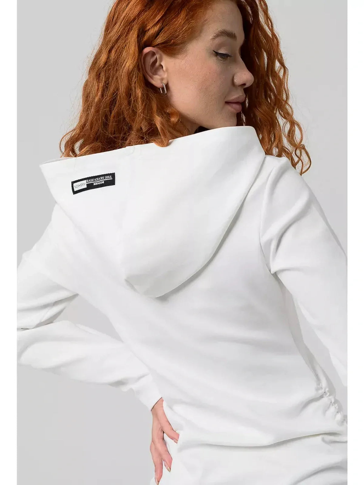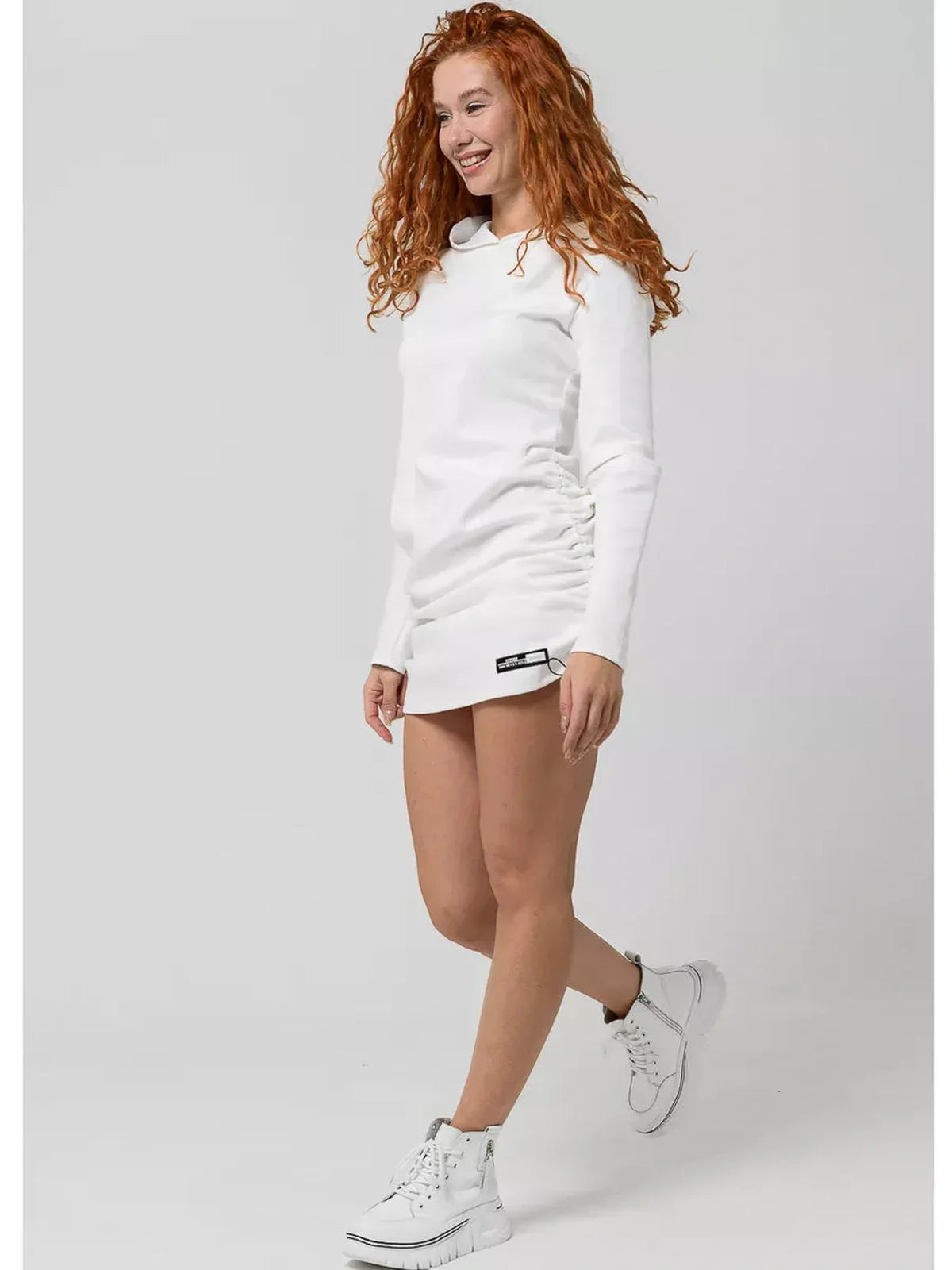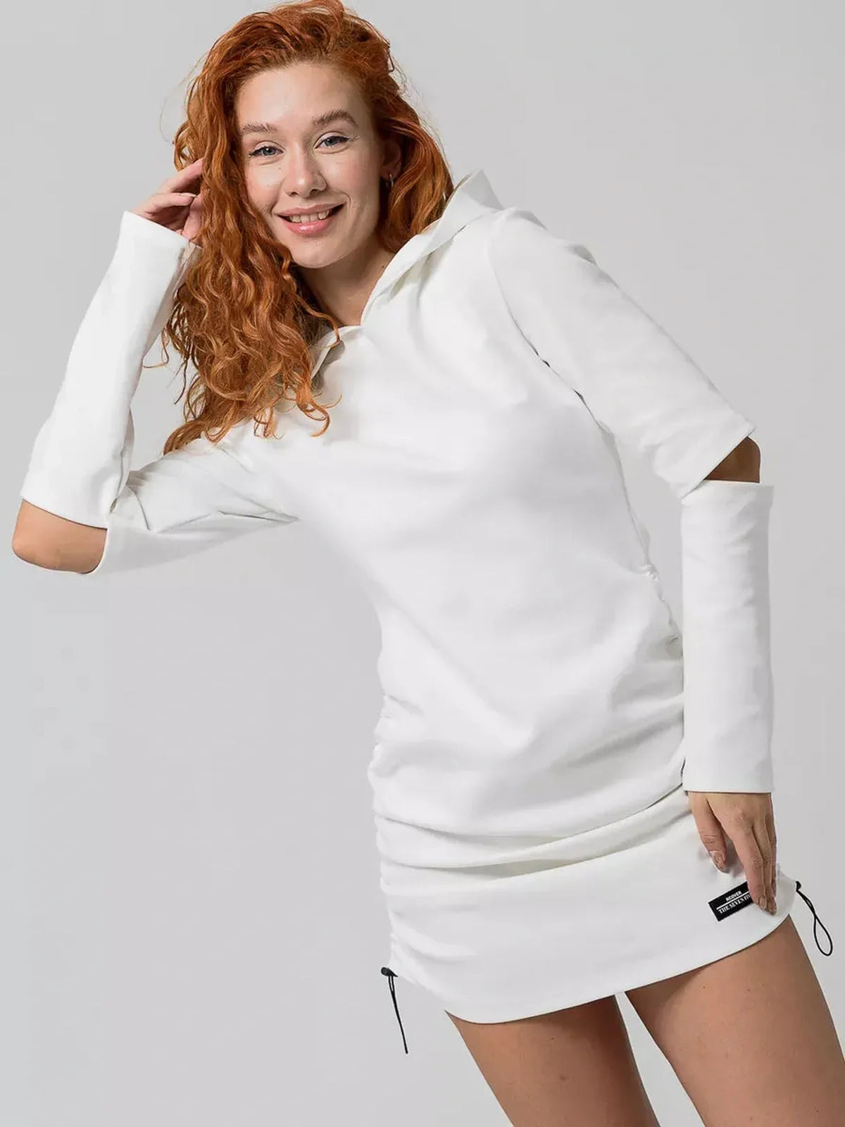 Designed in crisp white, this long sleeve mini dress features a hooded neckline for an urban-inspired twist and cut-out sleeve detailing that adds modern edge. The wrinkle-resistant fabric ensures a polished look, making it a versatile option for both casual and formal occasions. Its minimalist silhouette allows effortless styling, whether you’re keeping it laid-back or elevating it for special events.